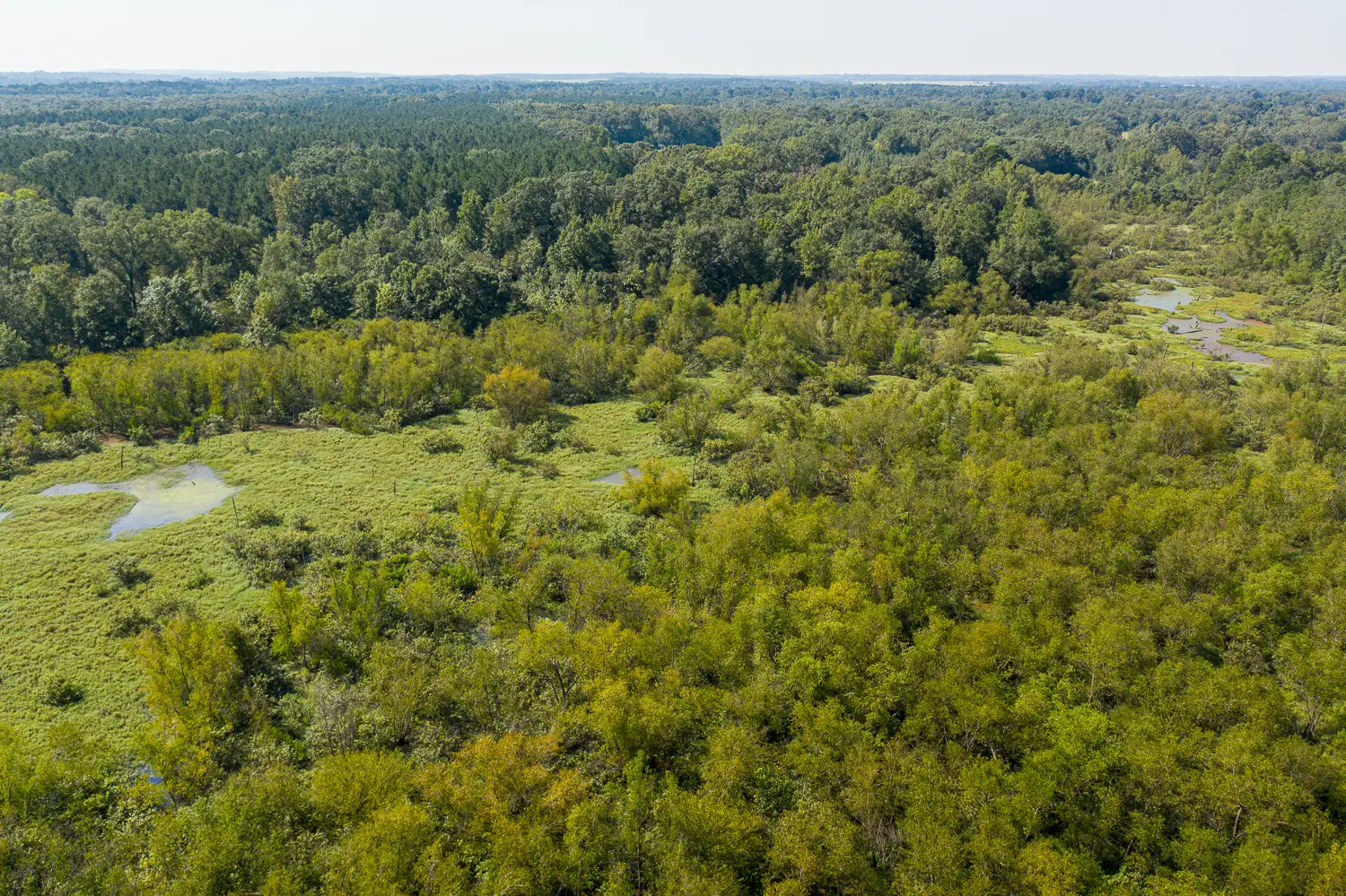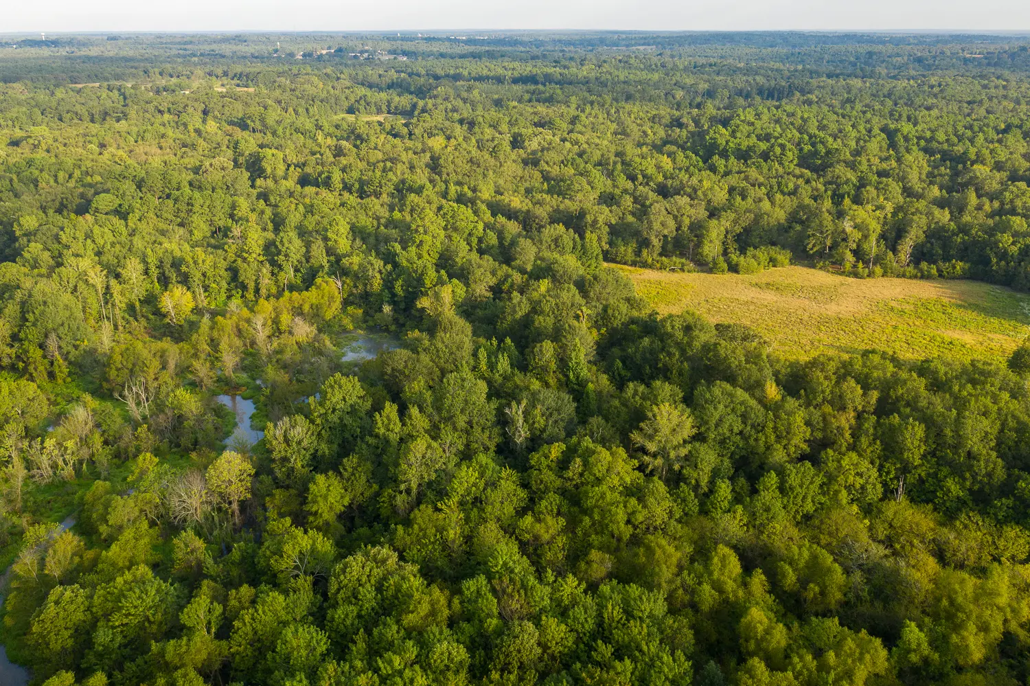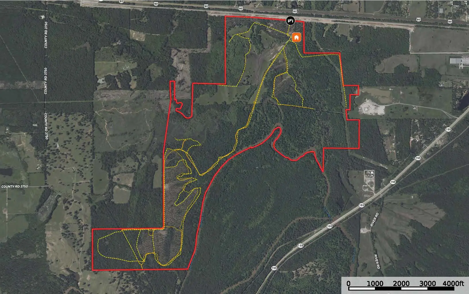 Four stands of mature Loblolly Pine cover approximately 150 acres of the property. The timber carries real commercial value — pulpwood, sawtimber, and utility pole markets all draw from well-stocked East Texas plantation stands. For hunters, these same stands provide dense thermal cover, solid bedding areas, and natural travel corridors connecting the hardwood bottoms to the open fields.