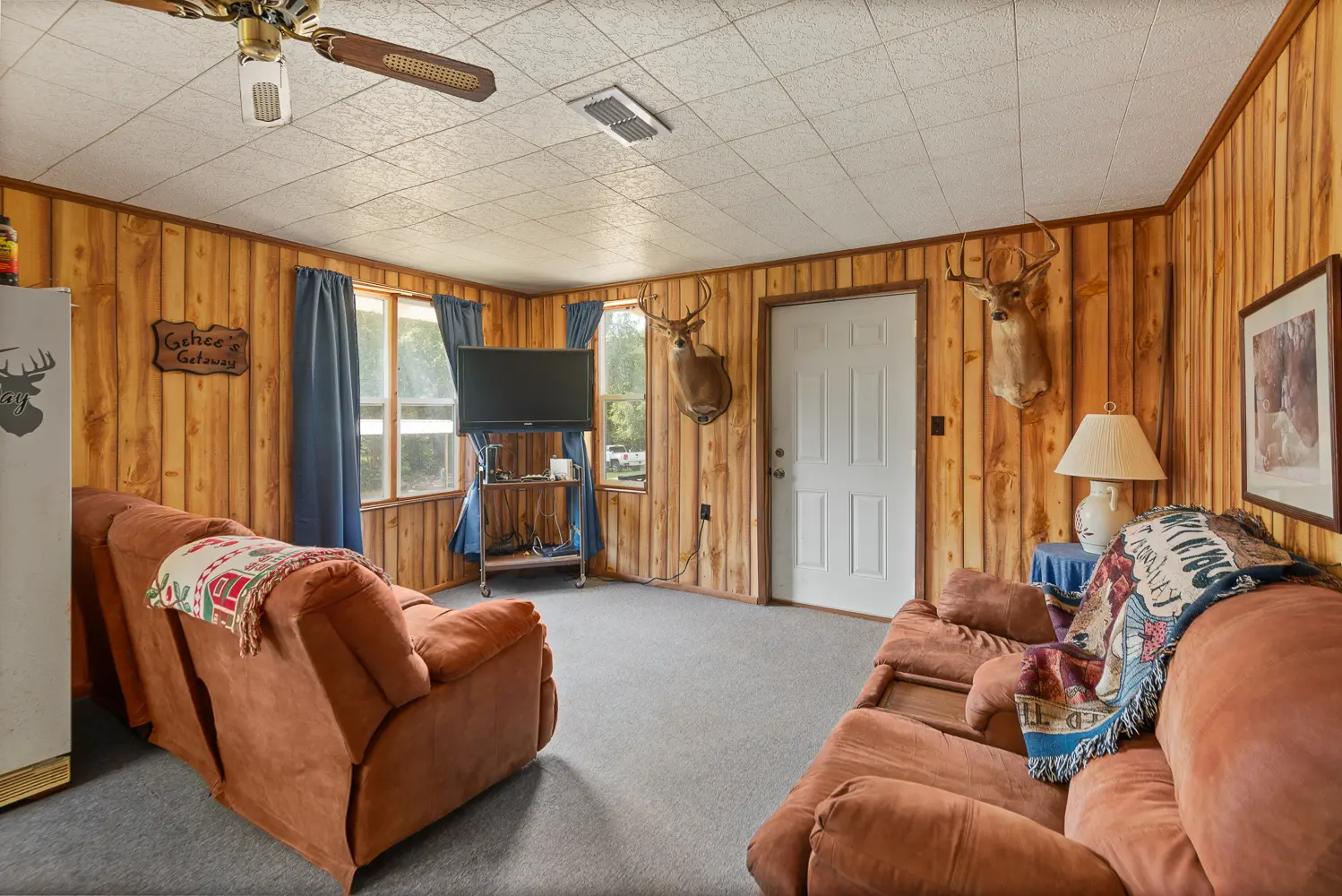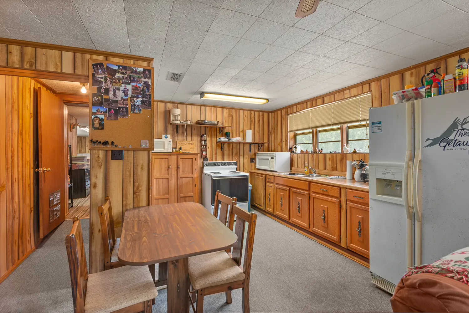 The camp infrastructure at The Getaway was built for working hunters, not weekend glampers. Camp Headquarters includes a fully furnished cabin with one private bedroom, a large bunkroom, bathroom, kitchen, and a living and gathering area with a front porch. Every piece of furniture conveys. Utilities are established; Big Sandy City Water and Upshur County Rural Electric are already in place, backed by conventional septic.