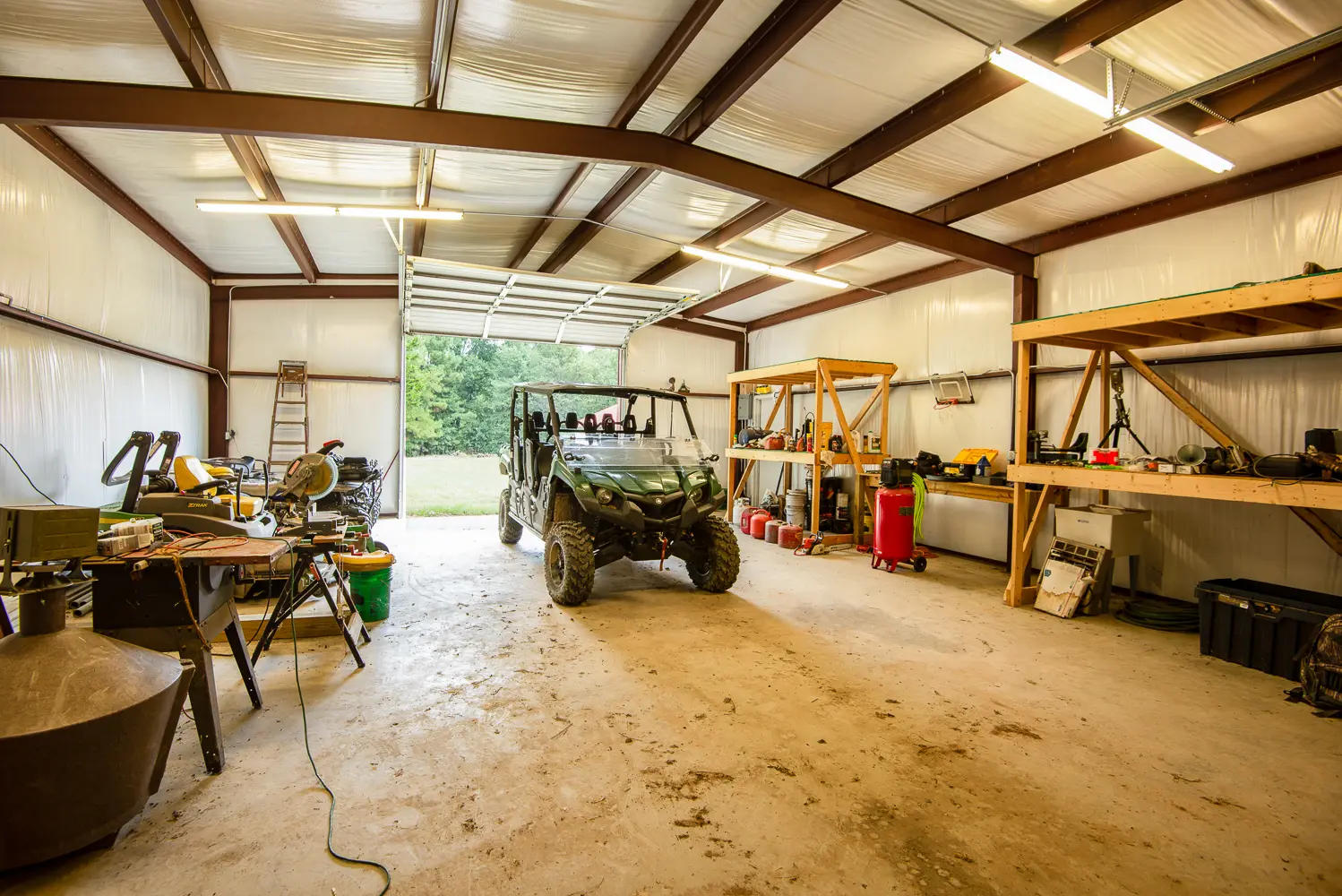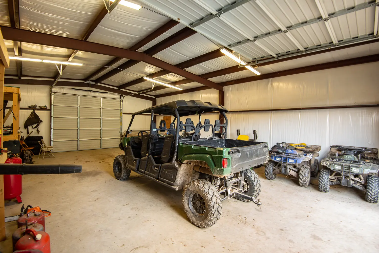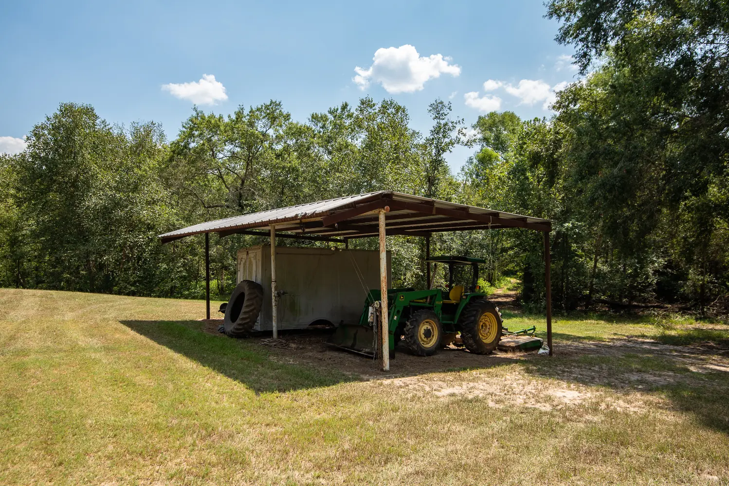 The support buildings are what separate this camp from a cleared lot with a cabin dropped on it. A 30×50-foot insulated equipment storage building with roll-up doors at each end handles gear, ATVs, and other equipment. A separate shed built for tractors, implements, and trailers includes a dedicated walk-in cooler for storing harvested game, the kind of setup that matters when you are stacking deer during the rut or running several hunters through a multi-day camp. The property currently holds agricultural exemption status, which carries meaningful tax advantages for the incoming owner.