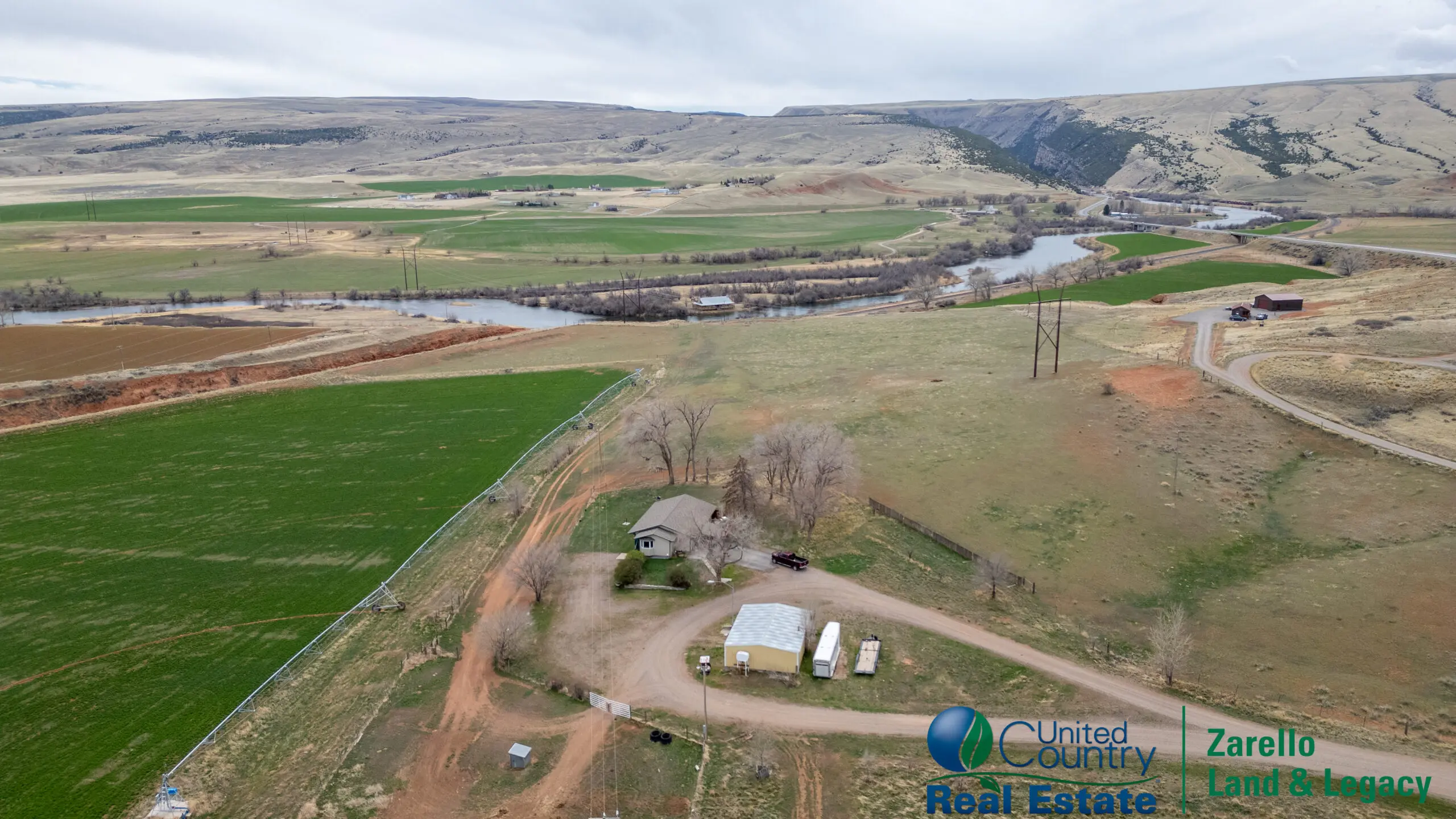 Encompassing 57.02± deeded acres, the ranch includes approximately 21± acres of established alfalfa irrigated under a 4-Tower Valley pivot system supplied by a pump-fed 12-inch pipeline drawing directly from the Big Horn River. Adjudicated surface water rights with early 20th-century priority dates support the irrigation history of the property. In a region experiencing ongoing drought conditions, the visible green production under pivot irrigation materially distinguishes this offering from non-irrigated acreage.