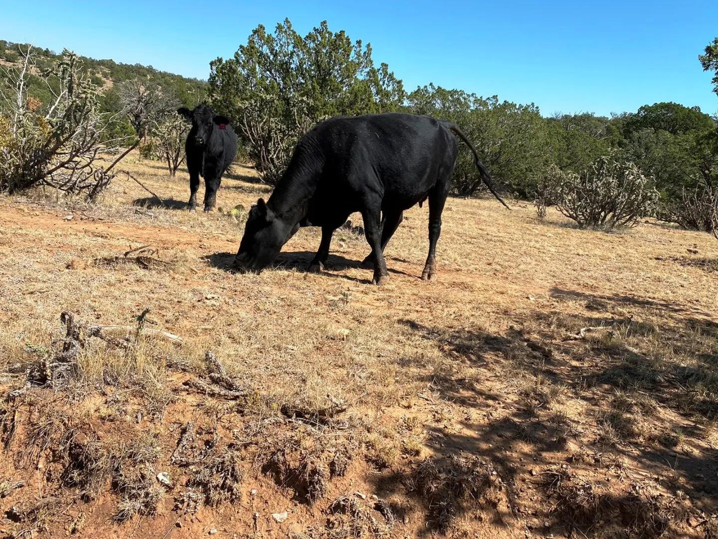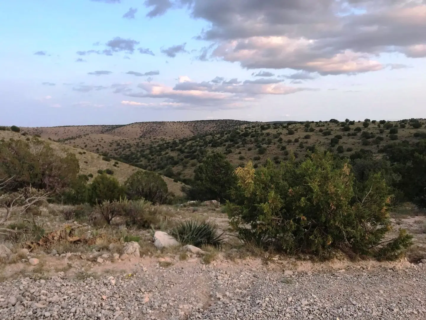 There is approximately 20% of the ranch that falls below the rim that slopes towards Pinon Draw. The remainder of the ranch is above the rim and consists of mostly gently rolling hills but does have steep terrain in areas. Cedars, junipers and pinon trees are the main trees found throughout the ranch.