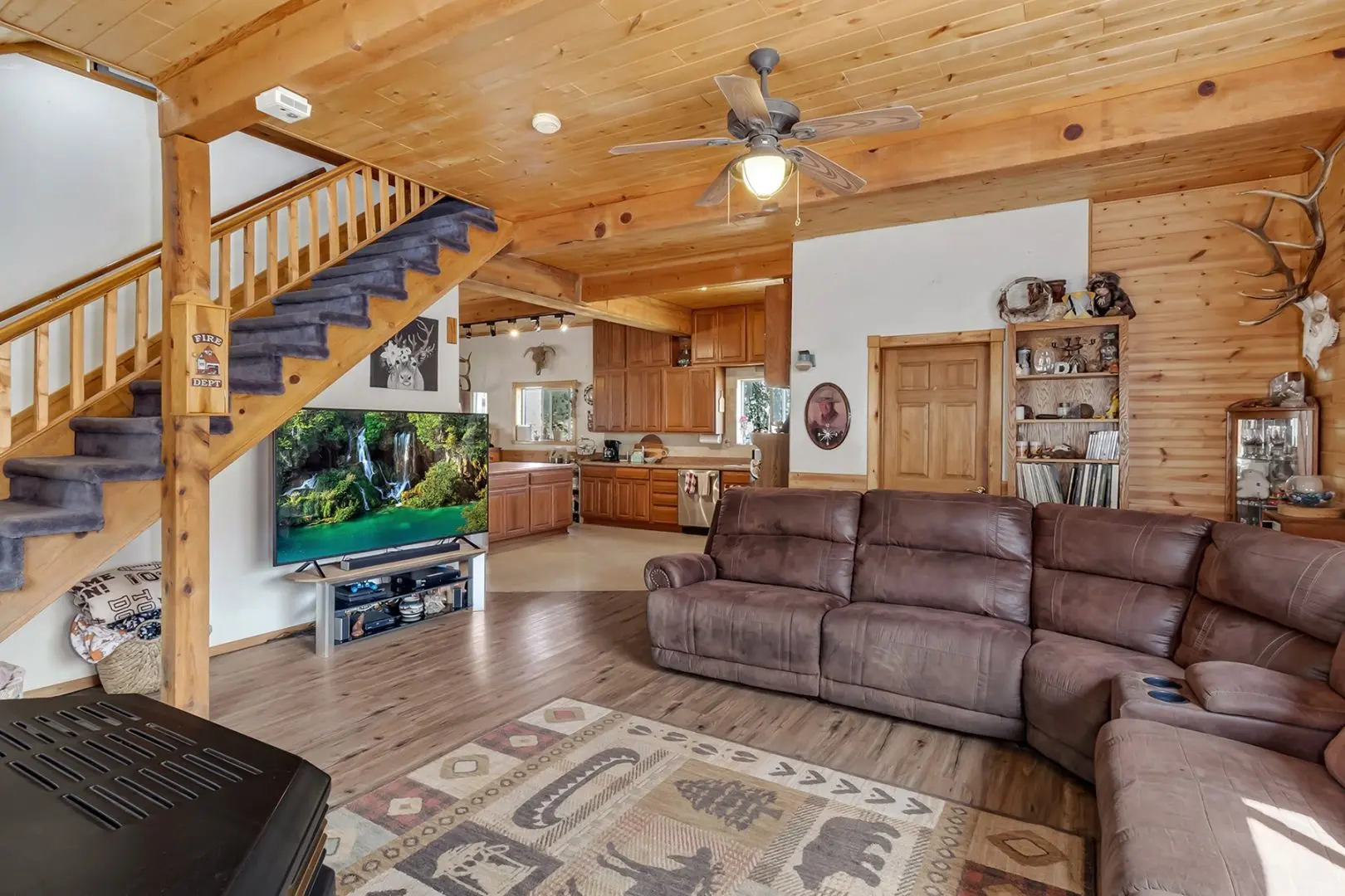 The centrally positioned living room, with pellet stove is warm and keeps everyone engaged with each other thru the open space from the kitchen. Beautiful wood laminate flooring making cleaning a breeze. To add charm and a rugged country feel, the entire home is finished in tongue and groove wood on the walls and ceilings. It’s truly a mountain home look, feel, and character.