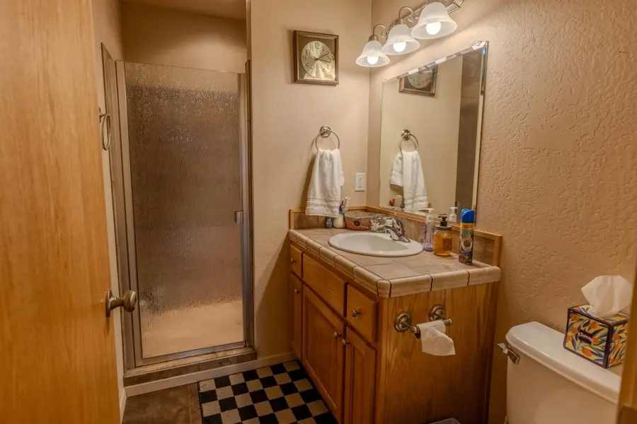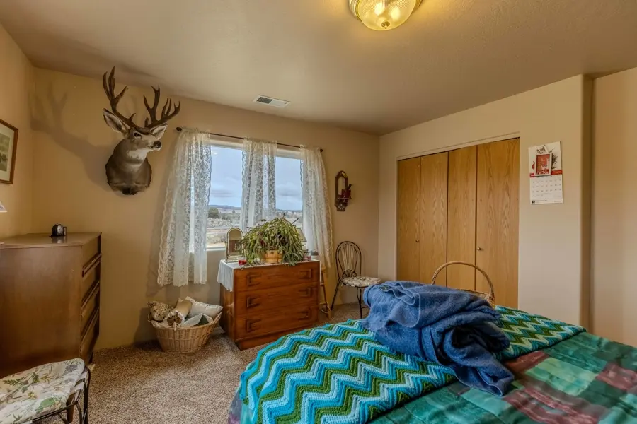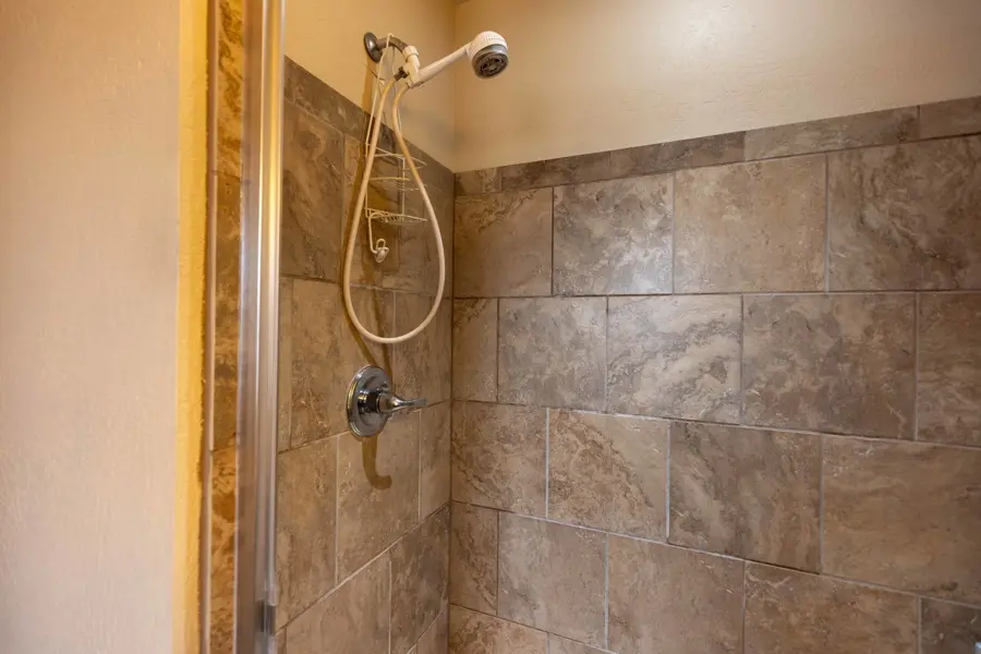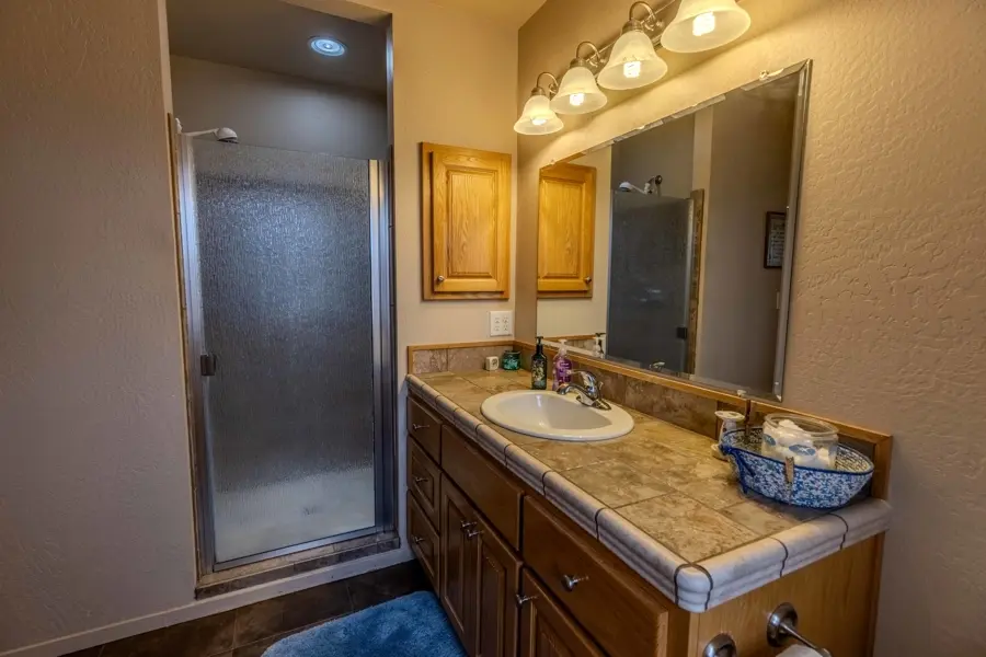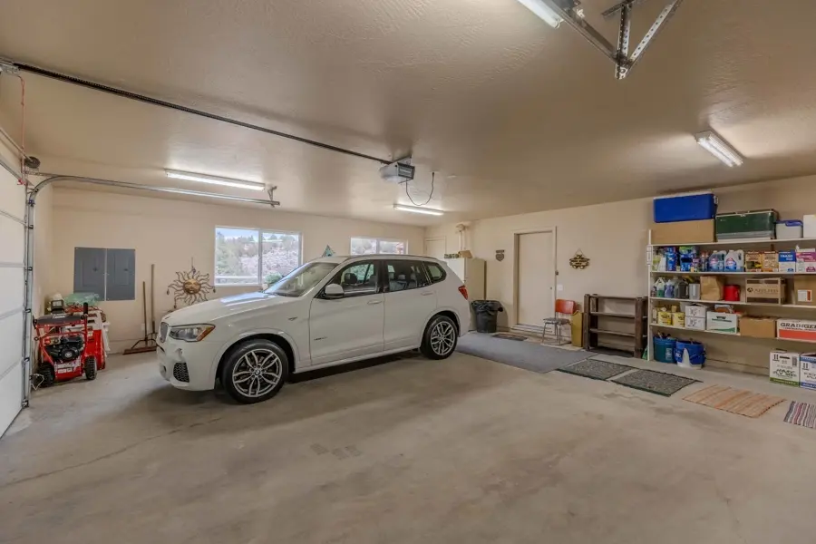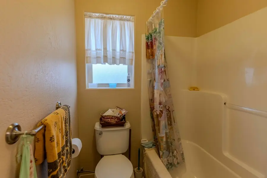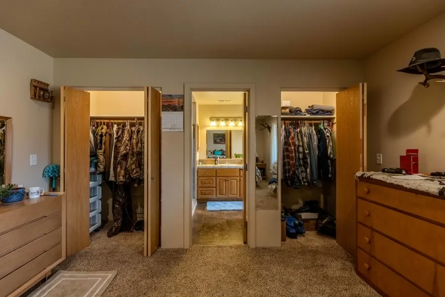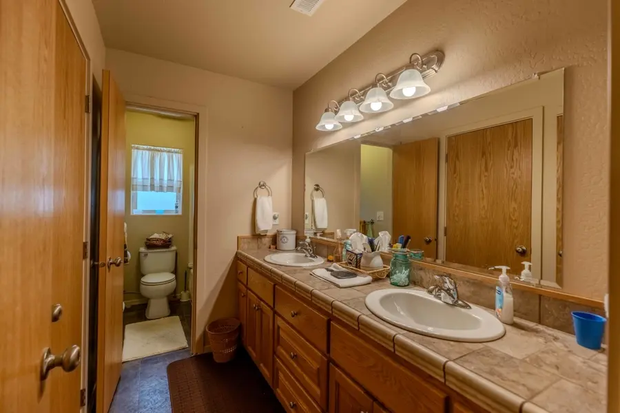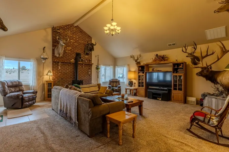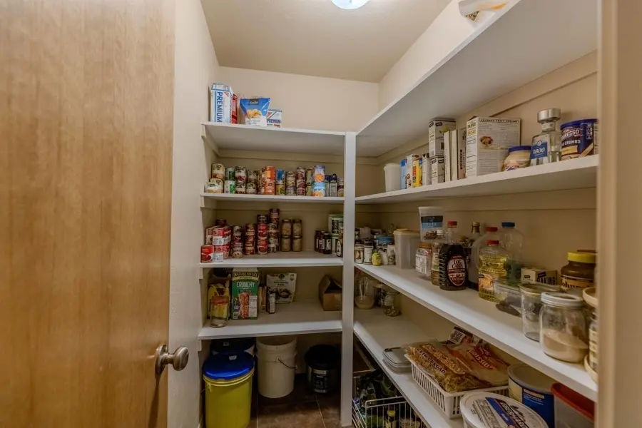 A double-car garage offers ample space for parking and includes additional storage areas with built-in shelving and room for extra freezers. From the garage, you enter into a large mudroom with tile flooring that continues into the kitchen. This utility room includes two large storage closets, cabinetry, washer and dryer hookups, and a convenient ¾ bathroom which has a tiled walk-in shower and a large, deep closet that previously served as a secure gun room. The kitchen is open-concept and overlooks the dining area, creating a great space for entertainment. It features a walk-in pantry, center island with bar seating, and abundant counter and cabinet space. Tile countertops, a built-in stovetop, dual ovens, and a conveniently placed dishwasher in the island add to the functionality of the space. Adjacent to the dining room is a generous family room with vaulted ceilings and carpet flooring. A central hallway leads to all four bedrooms and the remaining bathrooms. The primary suite is one of the first rooms off the hallway and includes his-and-hers closets and a private ¾ bathroom with tiled finishes. Across the hall, a similarly sized room is currently used as a large office. The two additional bedrooms share a well-appointed bathroom featuring a dual-sink vanity, a towel closet, and a separate enclosed space for the toilet and tub—designed for added privacy and convenience.