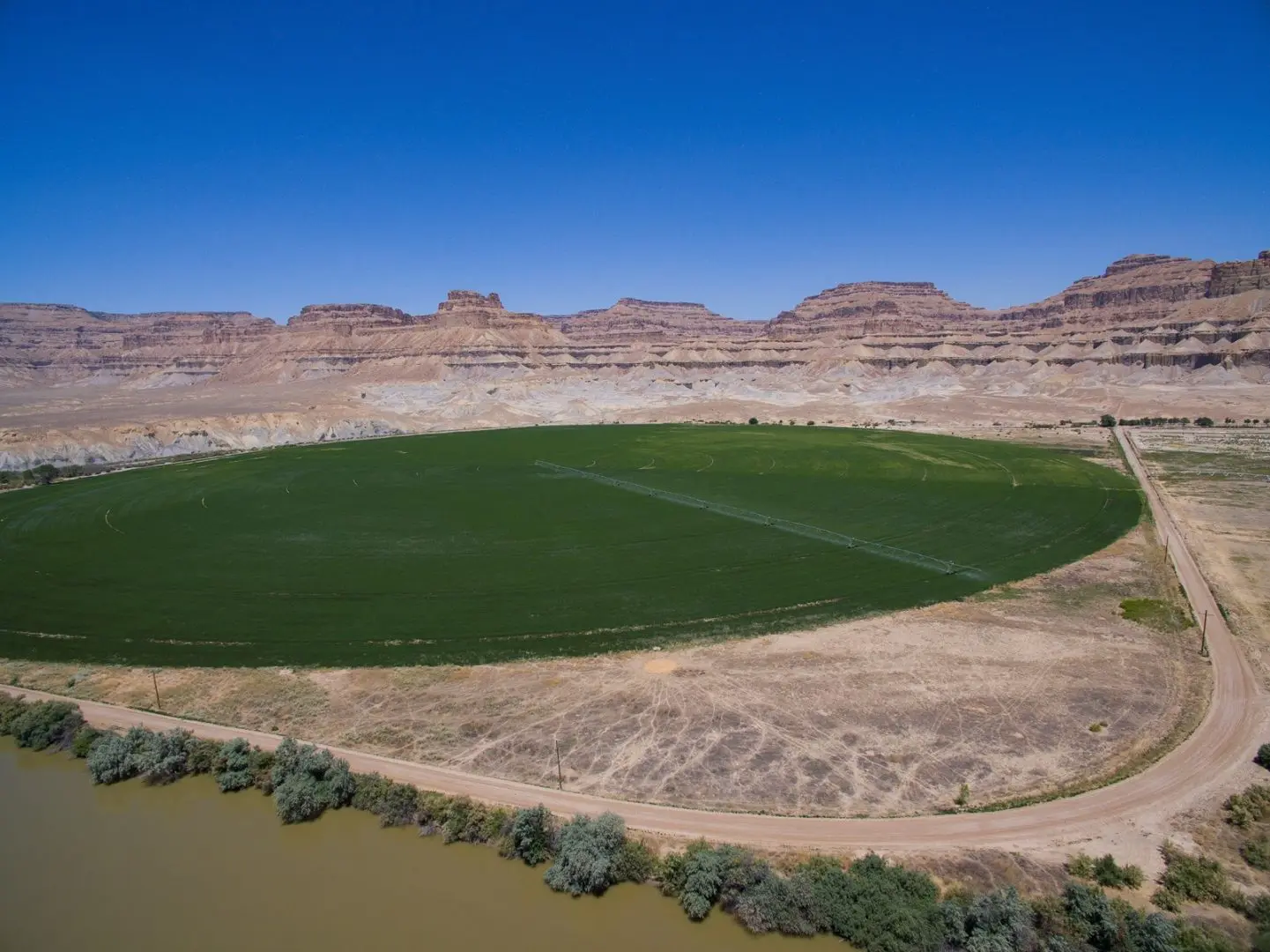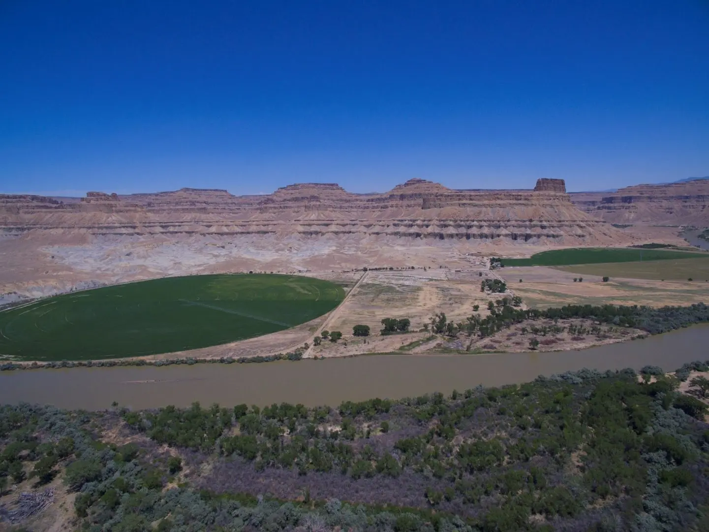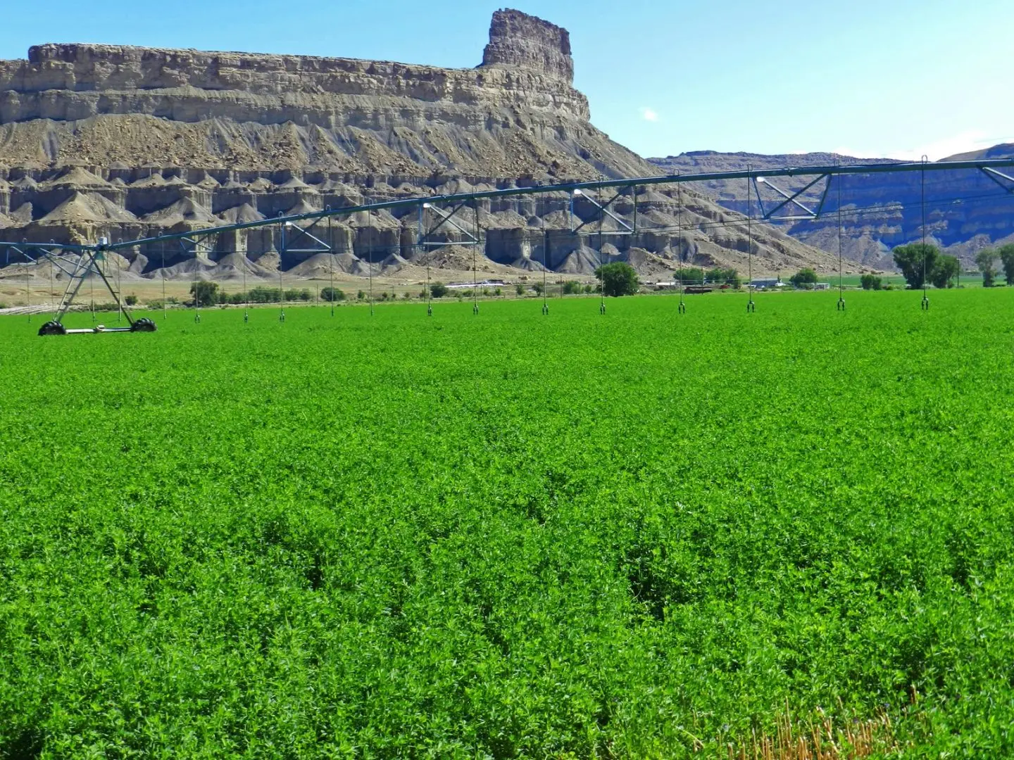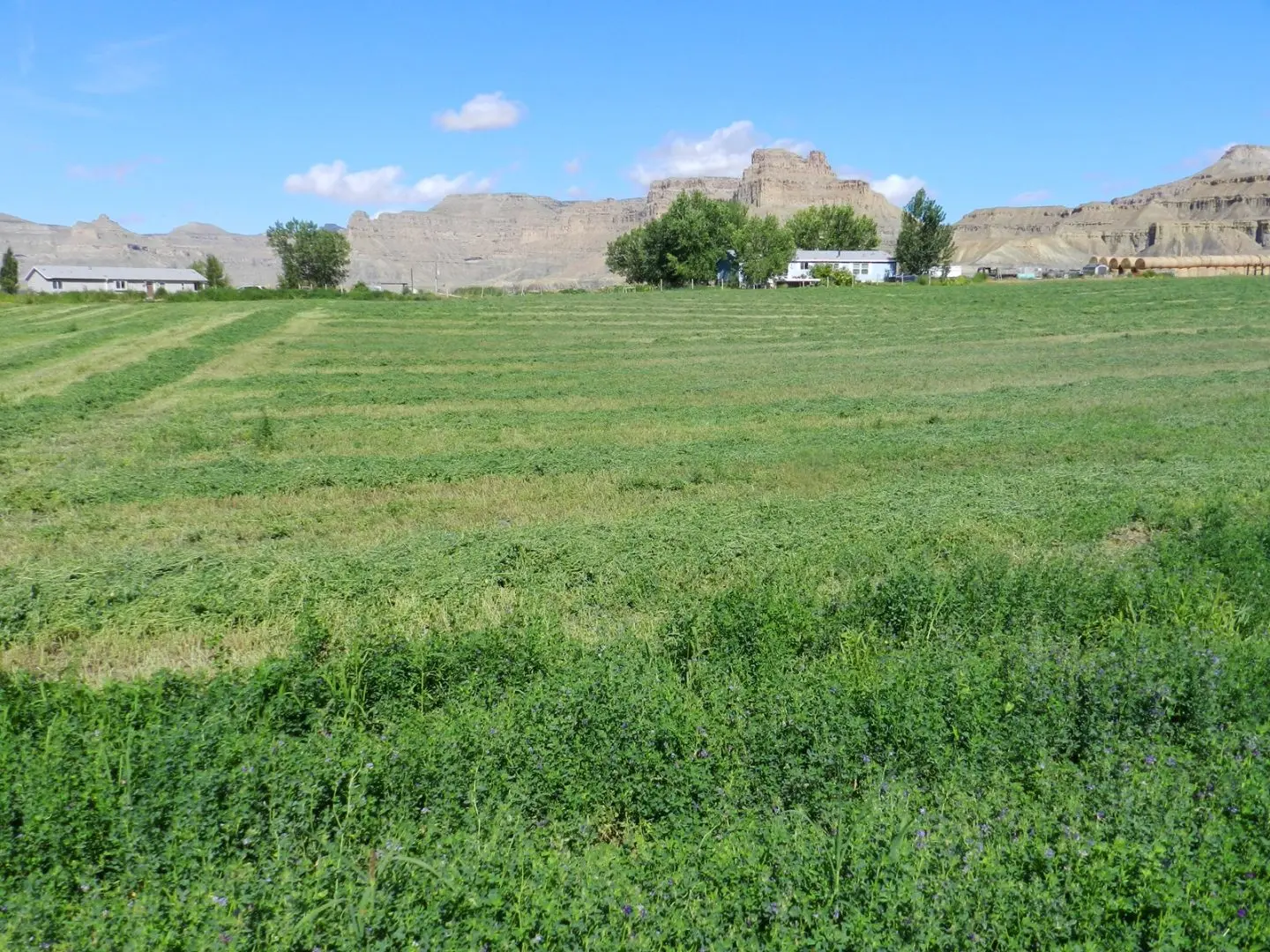The Gunnison Butte Farm is comprised of approximately 485 total acres, with 210 irrigated acres on the east parcel and 600 acre feet of adjudicated water rights pumped directly out of the Green River. The west parcel, irrigated by a 2006 Valley center pivot, has 155 acres and over 600 acre feet of adjudicated water rights. Green River is known for its mild climate and long growing season—over 150 days a year—which is why Green River is famous for its melons. This farm is known for being highly productive, with fields planted in grass-alfalfa hay, alfalfa, and also a 5-acre fruit orchard planted in peaches, apples, plums, pears, Asian pears, cherries, and apricots. It’s possible to obtain yields of 6 tons to the acre of alfalfa. Historically the ranch has produced sugar beets, corn, melons, alfalfa, and high-quality grass-alfalfa mix hay. The east part of the ranch is irrigated by a 2006 Model 8000 Valley center pivot, 5 sideroll sprinklers, and 15 acres are flood irrigated.