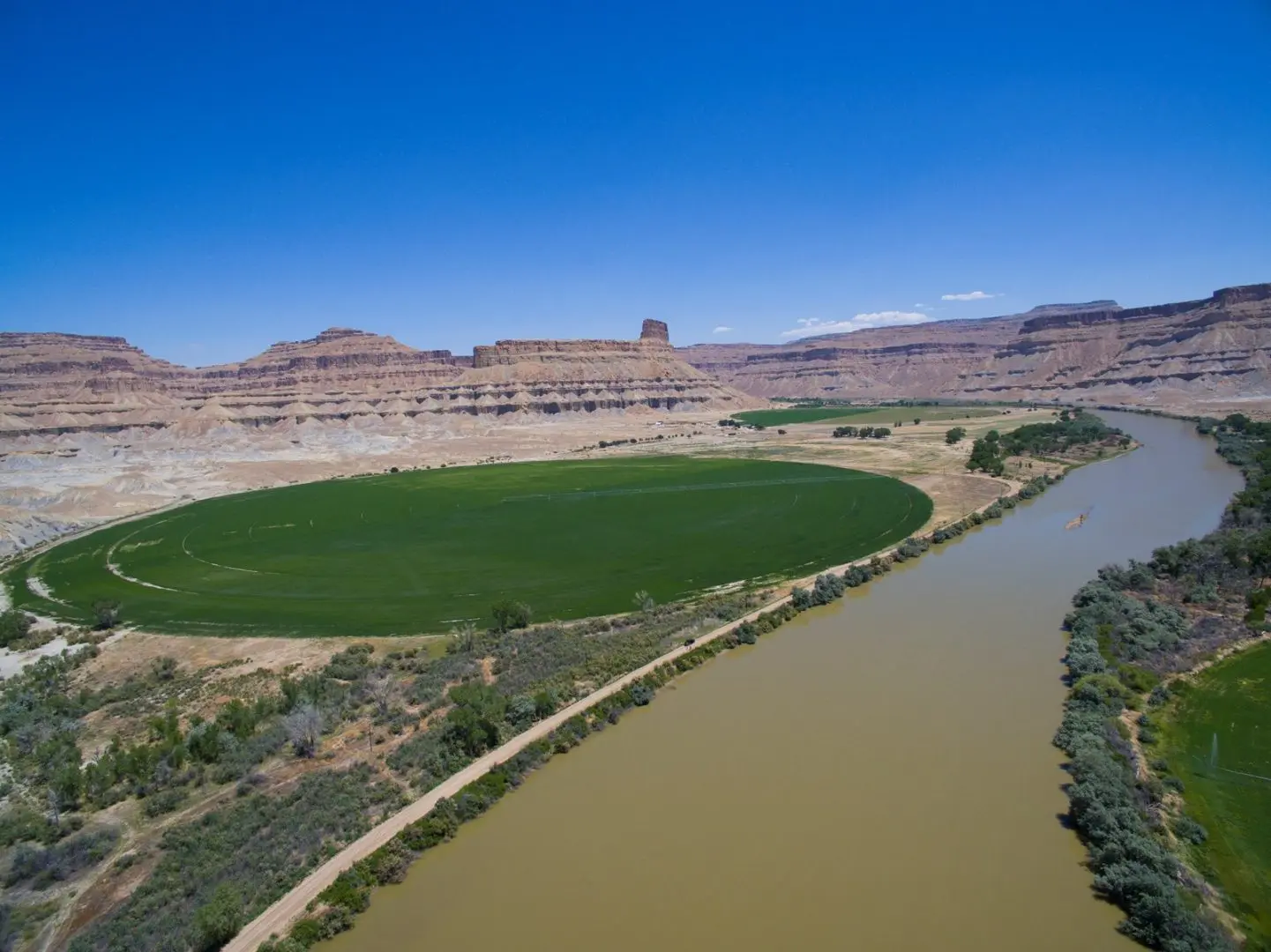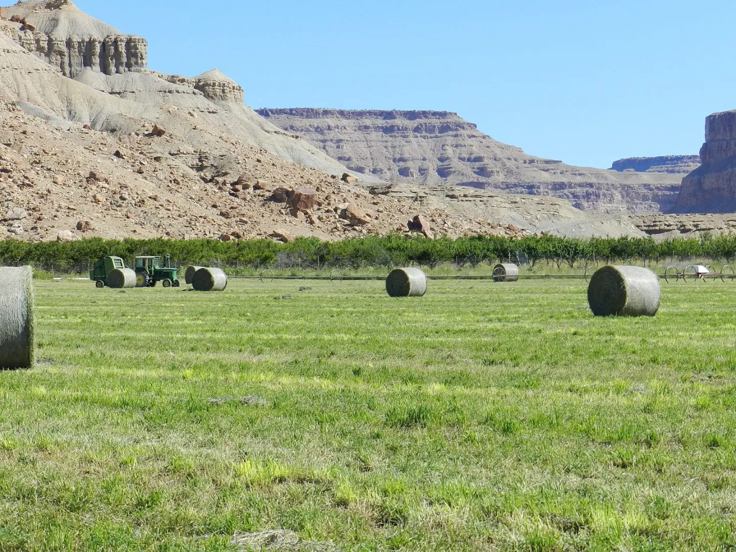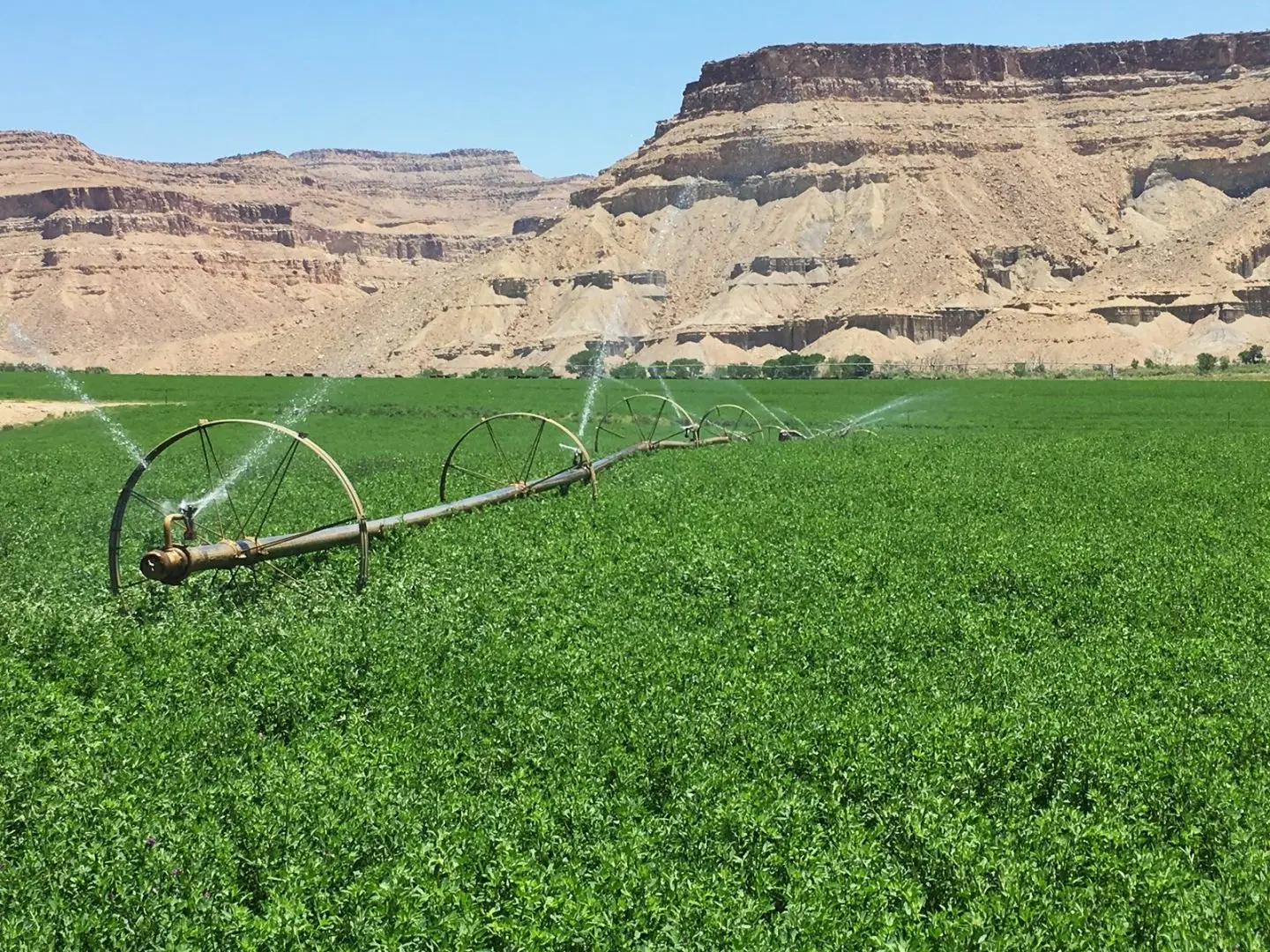 The Gunnison Butte Farm is comprised of approximately 485 total acres, with 210 irrigated acres on the east parcel and 600 acre feet of adjudicated water rights pumped directly out of the Green River. The west parcel, irrigated by a 2006 Valley center pivot, has 155 acres and over 600 acre feet of adjudicated water rights. Green River is known for its mild climate and long growing season—over 150 days a year—which is why Green River is famous for its melons. This farm is known for being highly productive, with fields planted in grass-alfalfa hay, alfalfa, and also a 5-acre fruit orchard planted in peaches, apples, plums, pears, Asian pears, cherries, and apricots. It’s possible to obtain yields of 6 tons to the acre of alfalfa. Historically the ranch has produced sugar beets, corn, melons, alfalfa, and high-quality grass-alfalfa mix hay. The east part of the ranch is irrigated by a 2006 Model 8000 Valley center pivot, 5 sideroll sprinklers, and 15 acres are flood irrigated.