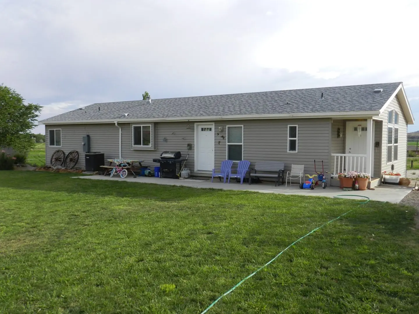 There are 2 newer homes on the ranch, both 2006 Nashua modular homes on full concrete basements. Both are built on custom floor plans, with pergo flooring in kitchen and dining, solid wood cabinets, vinyl siding, jetted garden tubs, central cooling and heating and are very energy efficient. The blue house has a 2,160 sq. ft. main floor with a full unfinished basement underneath that is plumbed for a full bathroom. The main floor consists of 3 bedrooms, 2 full baths, office, front room, dining room, kitchen with island and bar, morning room, family room, and a utility room all on a large, open floor plan. The brown house has a 1,560 sq. ft. main floor with a full, finished walk-out basement. The main floor consists of 2 bedrooms, 2 full baths, family room, kitchen with bar, dining room, and front room all on an open floor plan. The basement has 2 bedrooms, 1 bath, office, utility room, storage room, entry/mud room and garage for 1 car and 1 ATV.