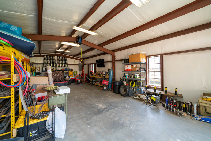 Metal Shop with roll up door, plumbed air, storage racks and worktables.