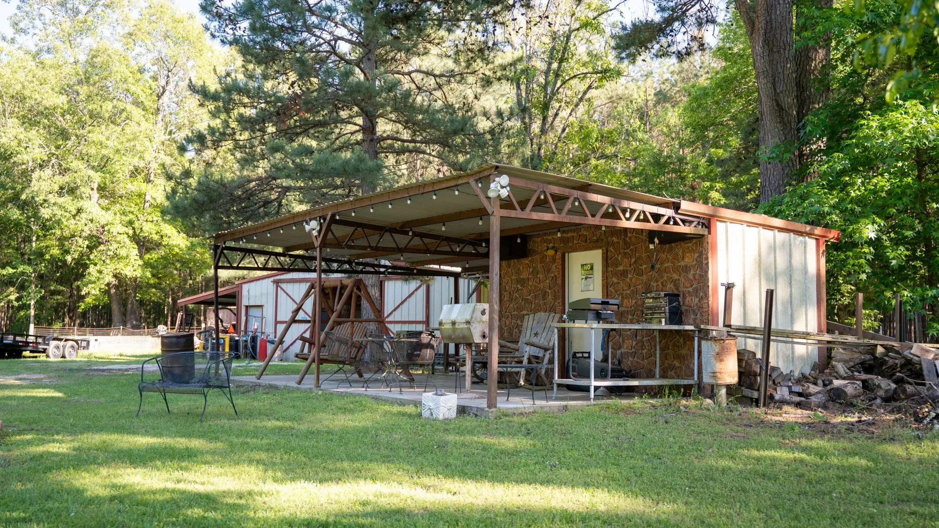 Nearby is a steel-framed barn with 4 horse stalls, 400 sq. ft. of guest quarters, power and water, and an adjacent Cantina bar and outdoor lounge area—perfect for relaxing after a day afield. The additional metal sea container provides secure storage for ATVs, tools, and feed.