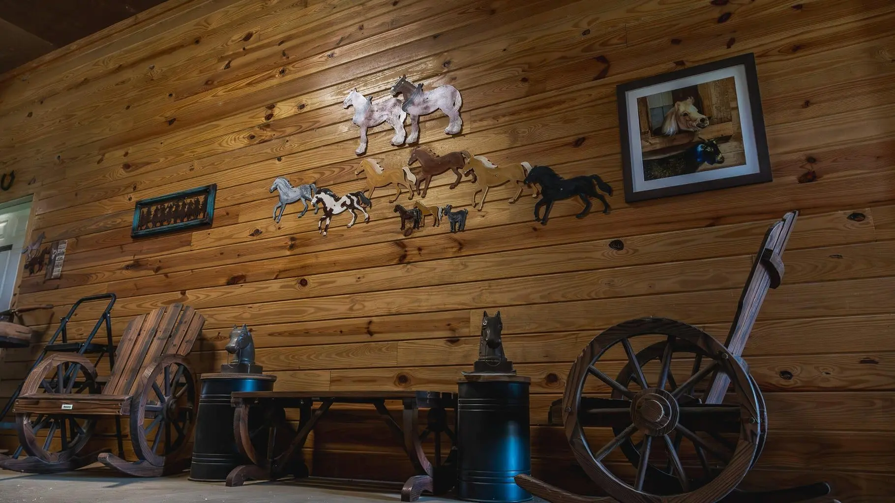 The Lodge is a two-story building featuring 10,400 SF on the 2nd floor and is built for hospitality and function. It includes 2 apartment suites (1 BR and 2 BR), 9 hotel-style guest rooms with private baths and walk-in closets, a spacious commercial-grade kitchen, dining and living areas, conference room and office, laundry facilities, and men’s and women’s restrooms with 3 shower stalls in each. The area below the lodge is divided into 2 spaces: a 5,785 SF horse barn with 12 stalls and a dedicated wash area, and 4,616 SF of climate-controlled space currently used as finished flex space and a garage/workshop area with a car lift, offering full flexibility for business operations, vehicle storage, or hobbyist use.