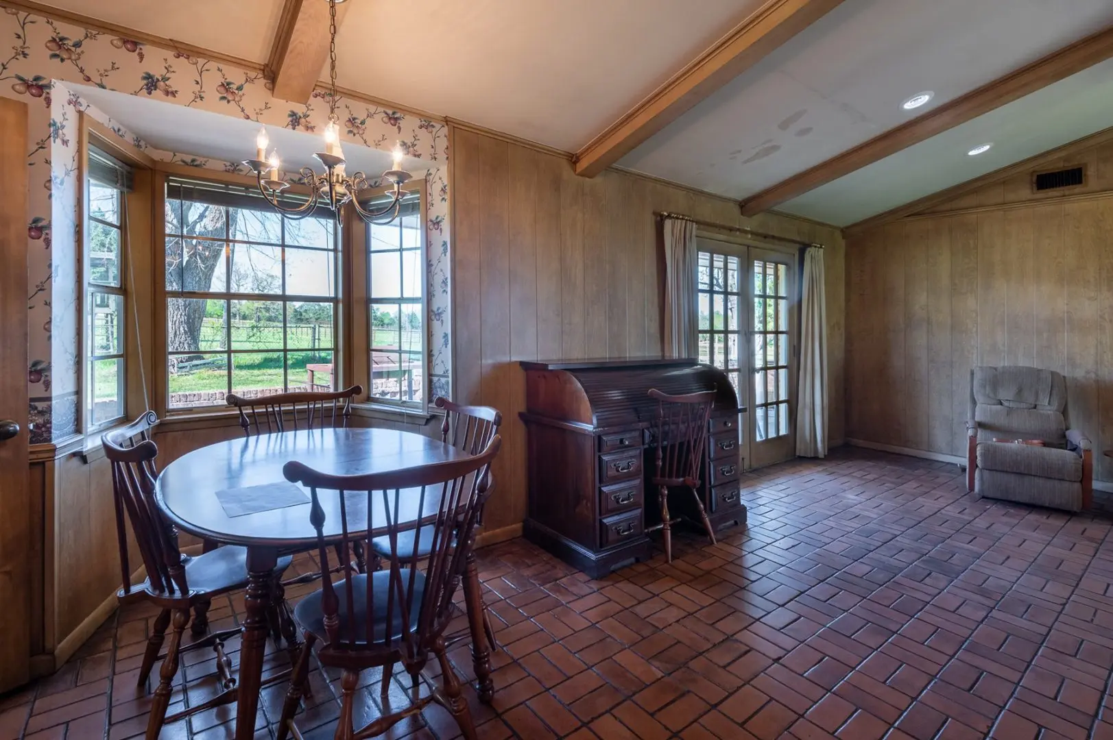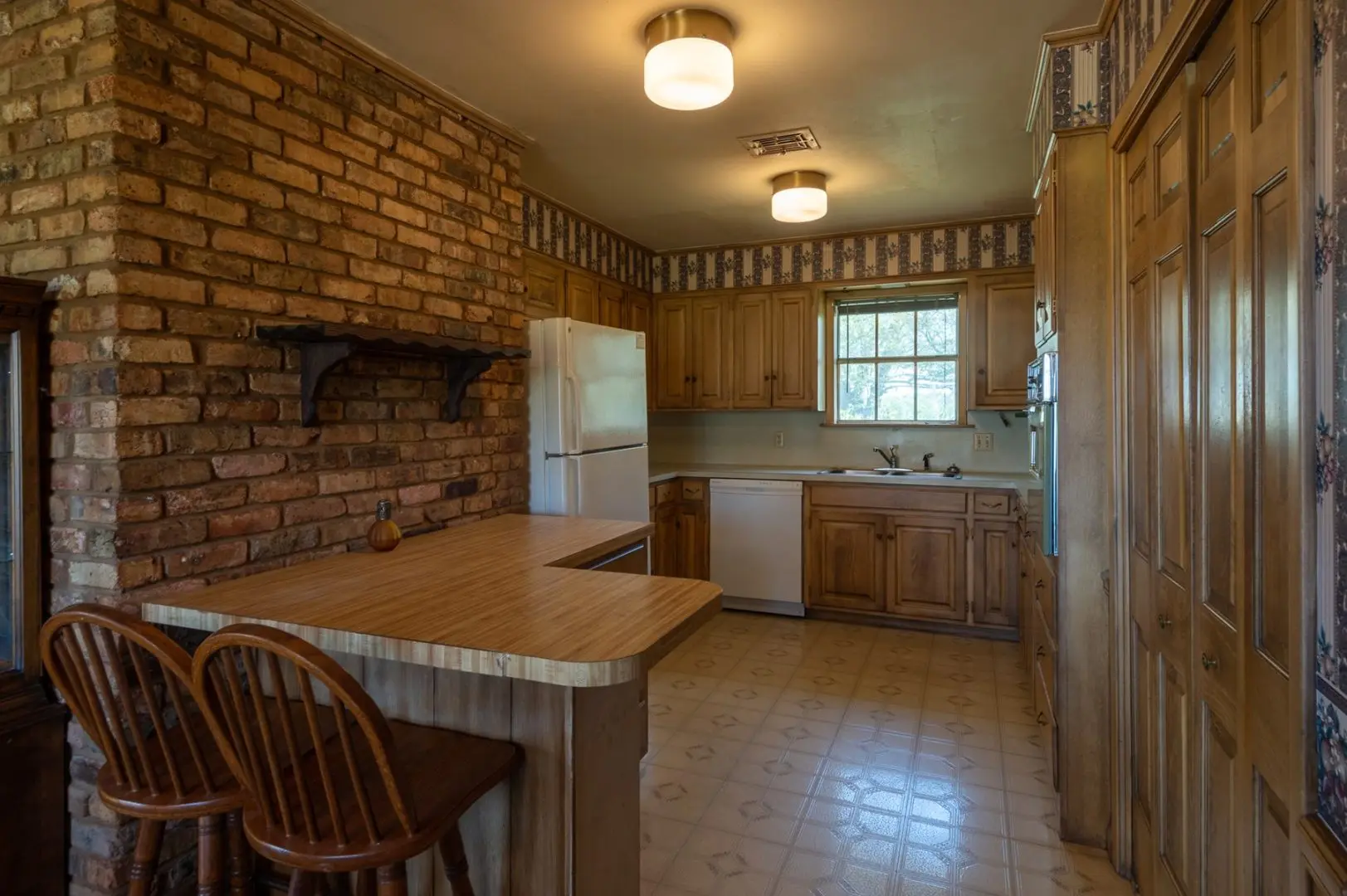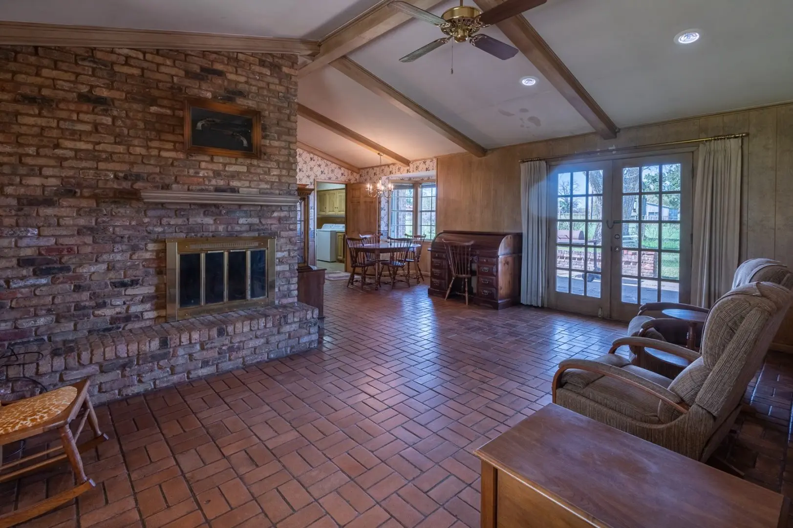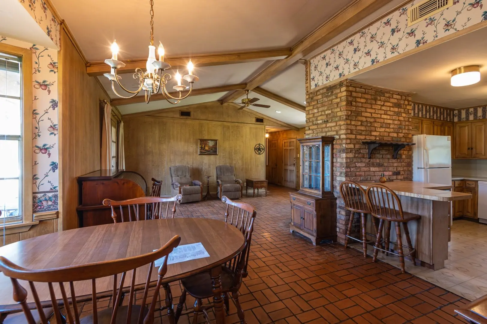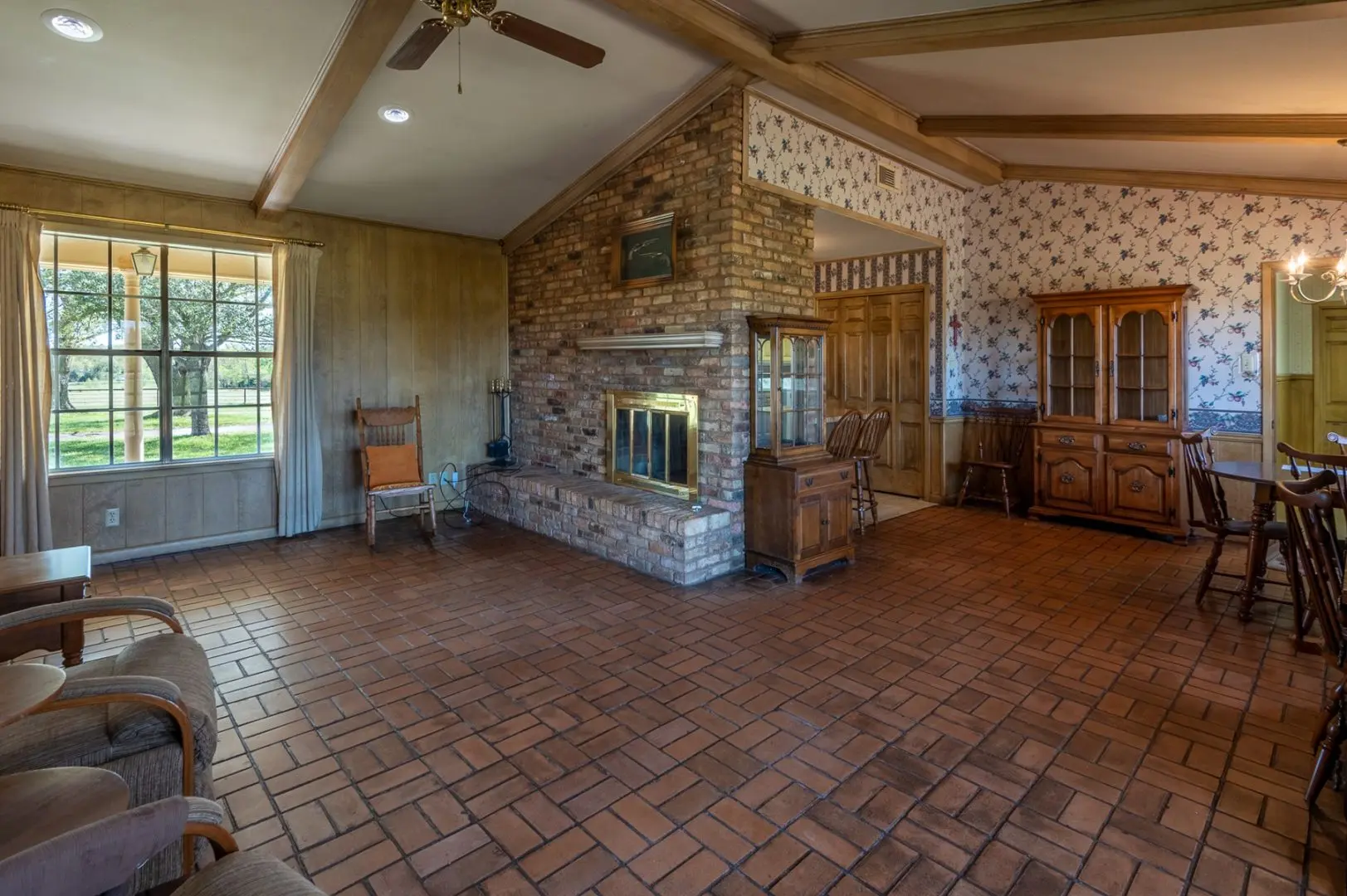 Enter the main gate and follow the winding entry driveway to the ranch house that sits atop the highest elevation point on the ranch overlooking scenic views of the lush green pastures and beyond. The three-bedroom two-bath brick ranch house was constructed in 1967 and has a living room with a fireplace and a separate dining area off the country kitchen with a breakfast bar. The bathrooms are in need of some repairs or remodel and the seller is leaving that project to the new owner.