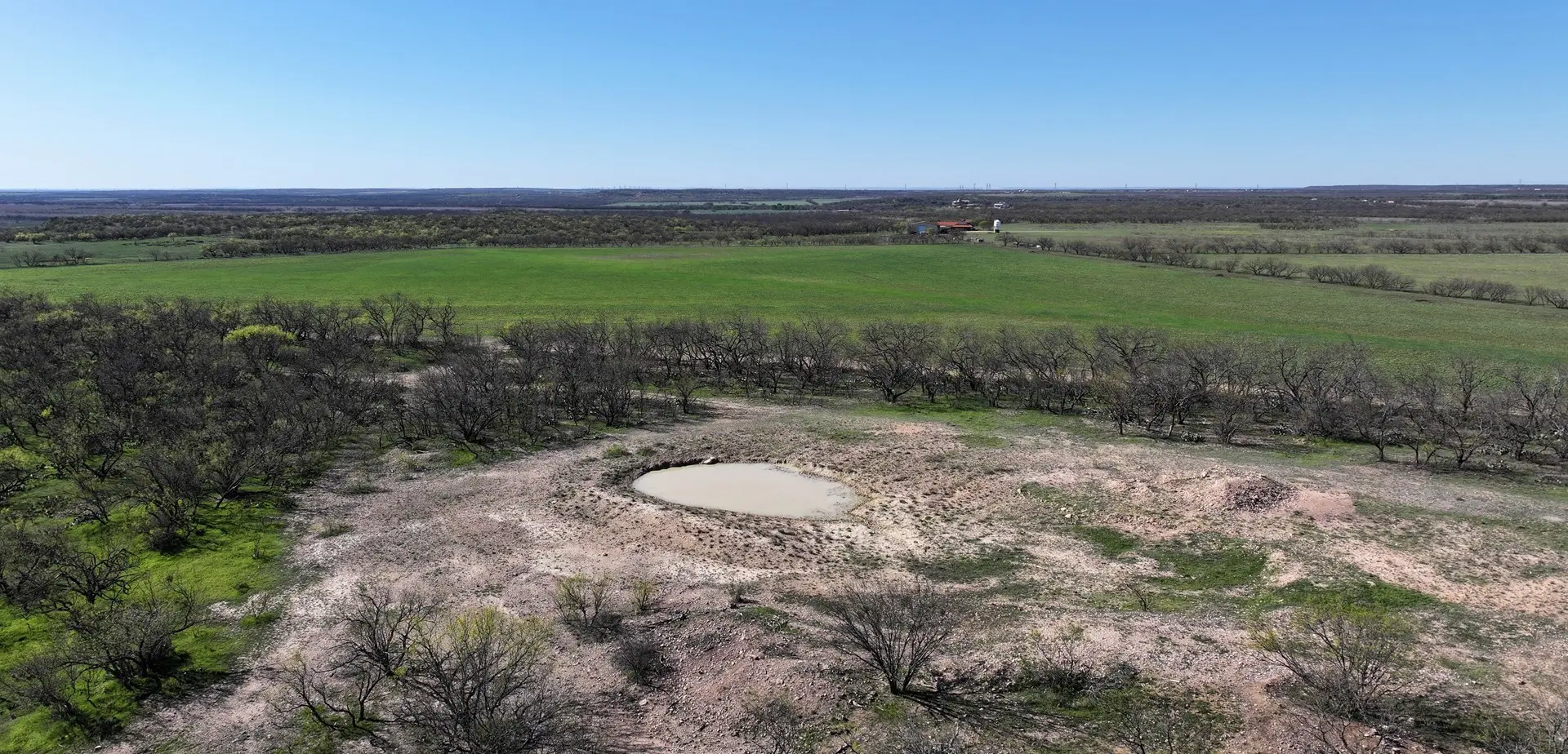 The ranch’s landscape features approximately 418 acres of land, divided into 5 pastures, each offering a unique blend of open grassland and wooded terrain. Two pastures are cultivated with b-dahl grass, providing fodder for the resident wildlife, while a third pasture is dedicated to wheat cultivation. Water features include a pond in the front and two additional ponds in the rough rangeland section, ensuring a sustainable water supply for the diverse flora and fauna.