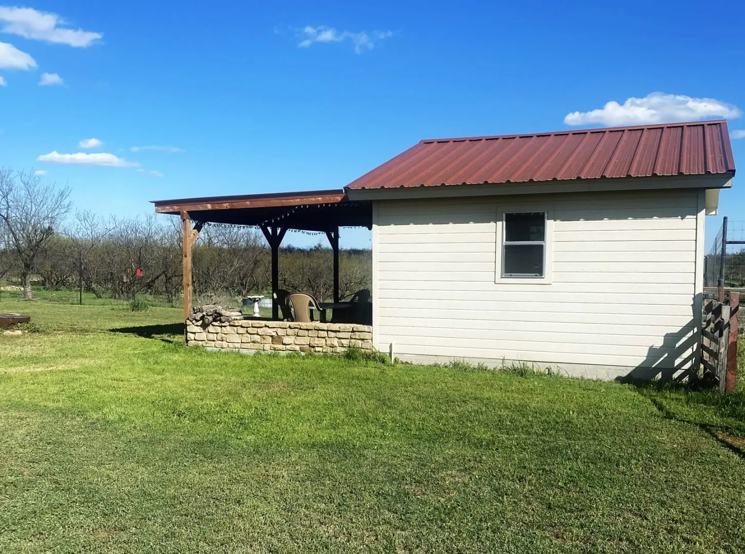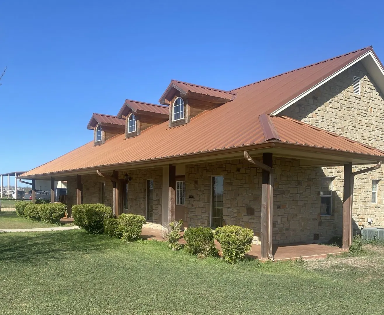 At the heart of this property lies a charming 2166 square foot home, crafted from sandstone rock and topped with a metal roof. Built in 2009, this residence features 3 bedrooms, 2.5 baths, and an inviting open floor plan, complemented by a custom island kitchen and a spacious wrap-around porch. Additionally, an outdoor kitchen enhances the backyard, providing a perfect space for entertaining guests. Adjacent to the home, a 2-car garage or shop offers ample storage for vehicles and equipment.