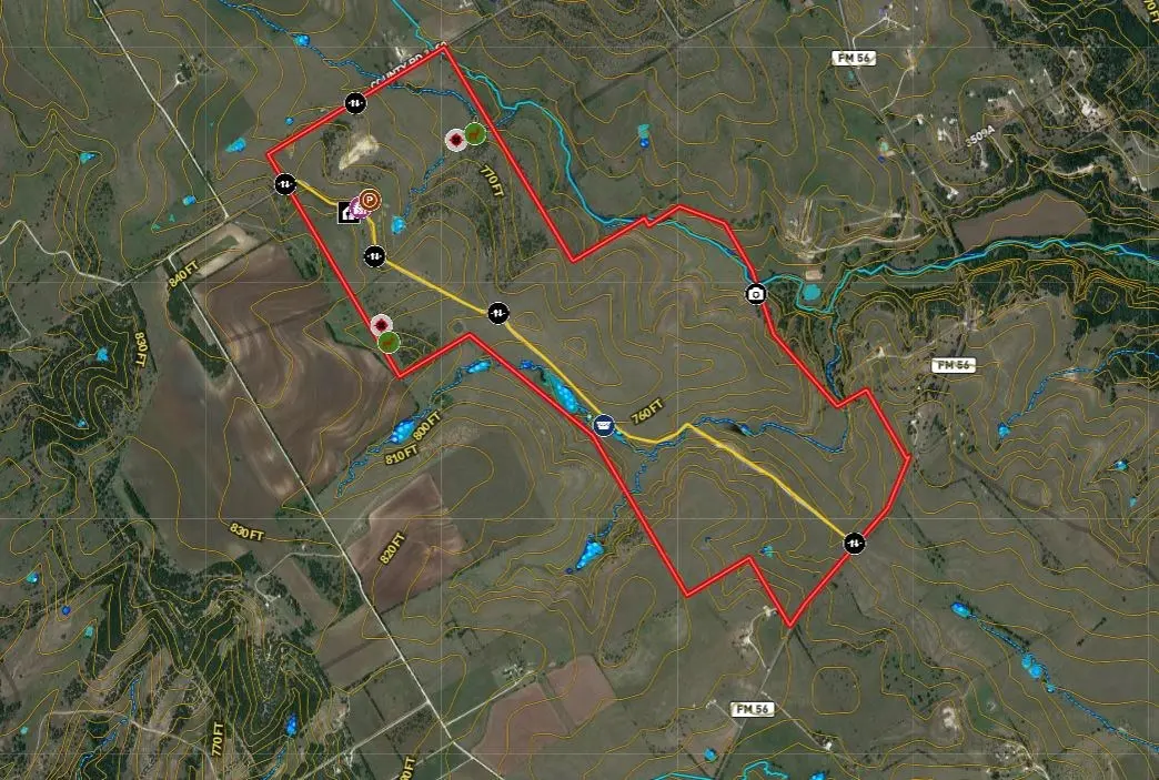 This 700+ Acre hunting ranch in Central Texas is a rare find. The property is fenced and cross fenced and has road frontage on 2 sides. CR 3360 runs along the North West Boundary and FM 56 runs across the South East boundary. This is one of the premier Ranches for Sale in Texas located in Bosque County. This property has beautiful hilltop and valley views. The elevation reaches over 800′. There are 7 ponds on this property along with numerous all weather creeks. You’ll find mature Oak trees, Elm trees and established native grasses along the gently rolling terrain.