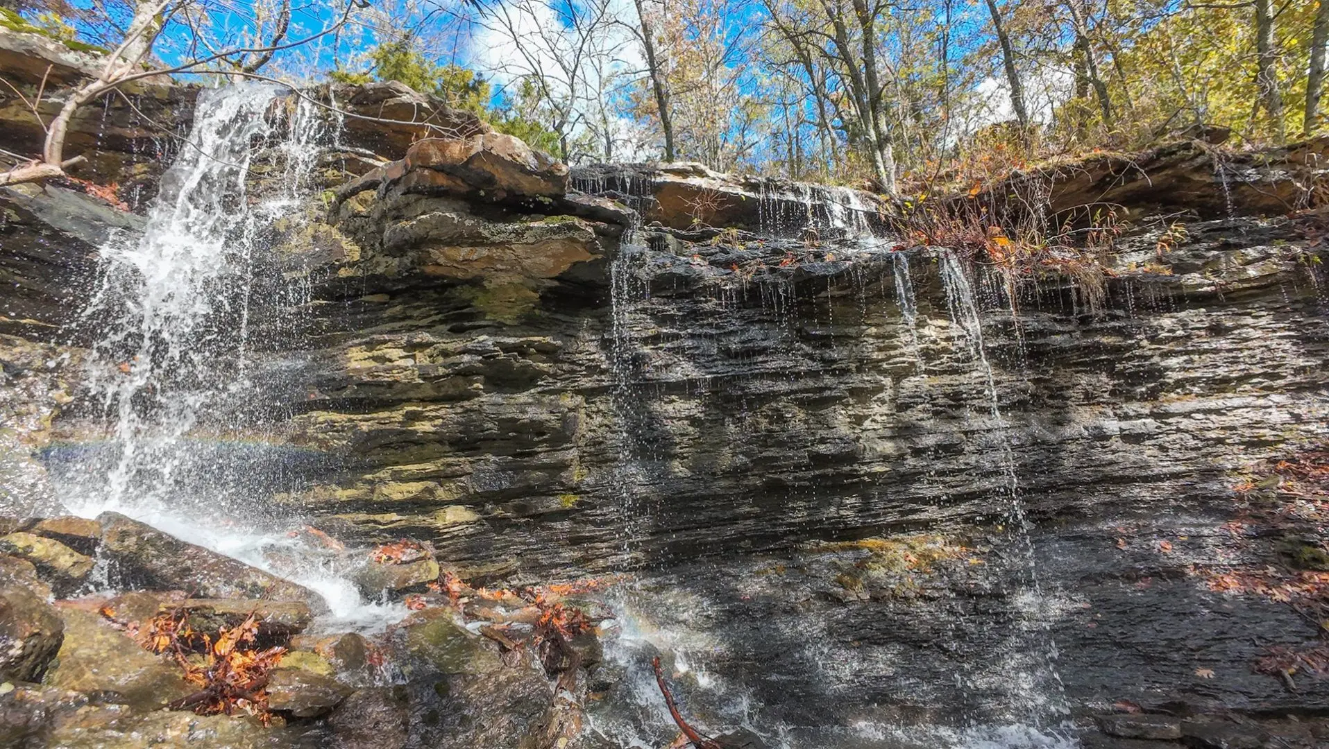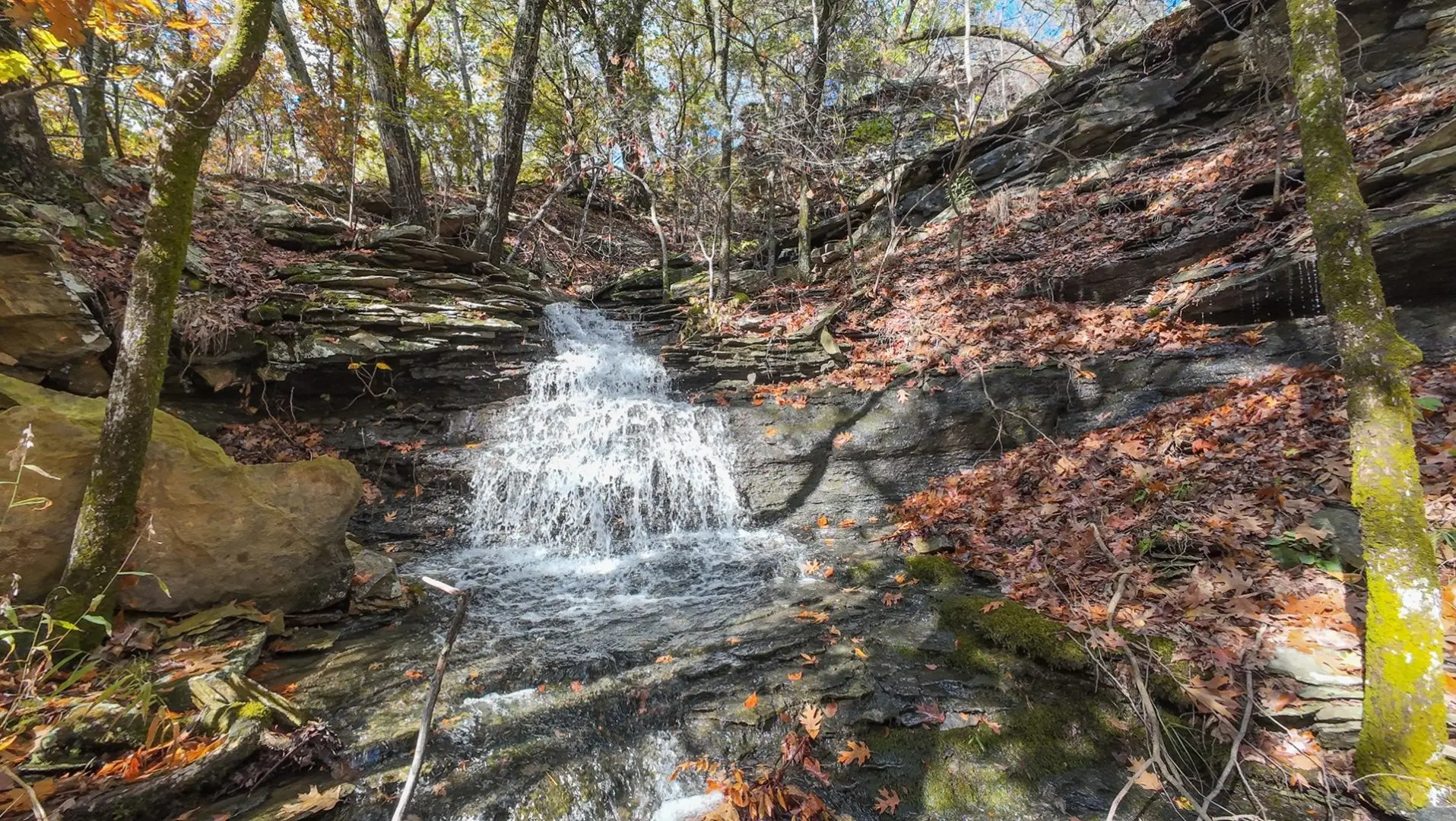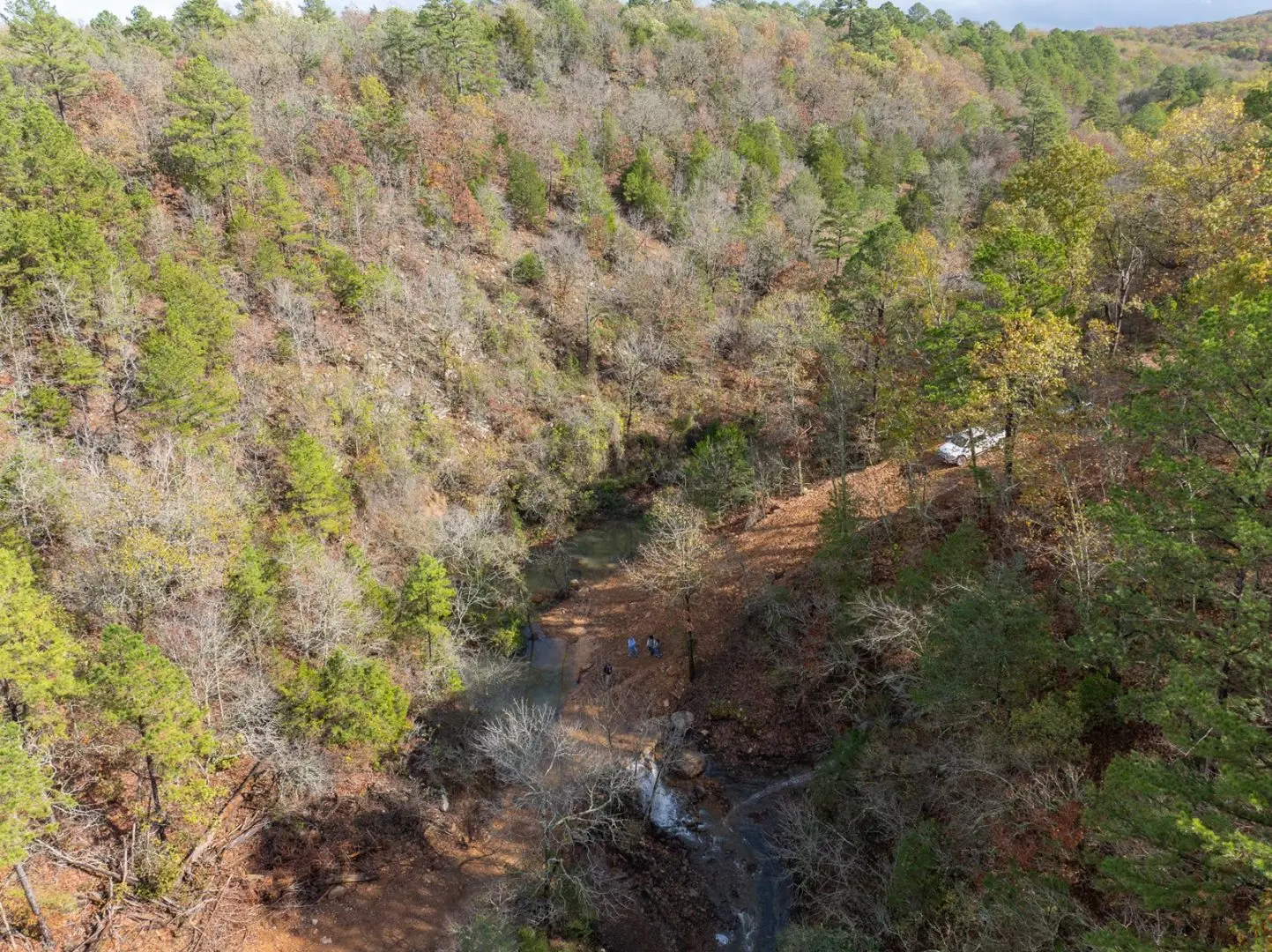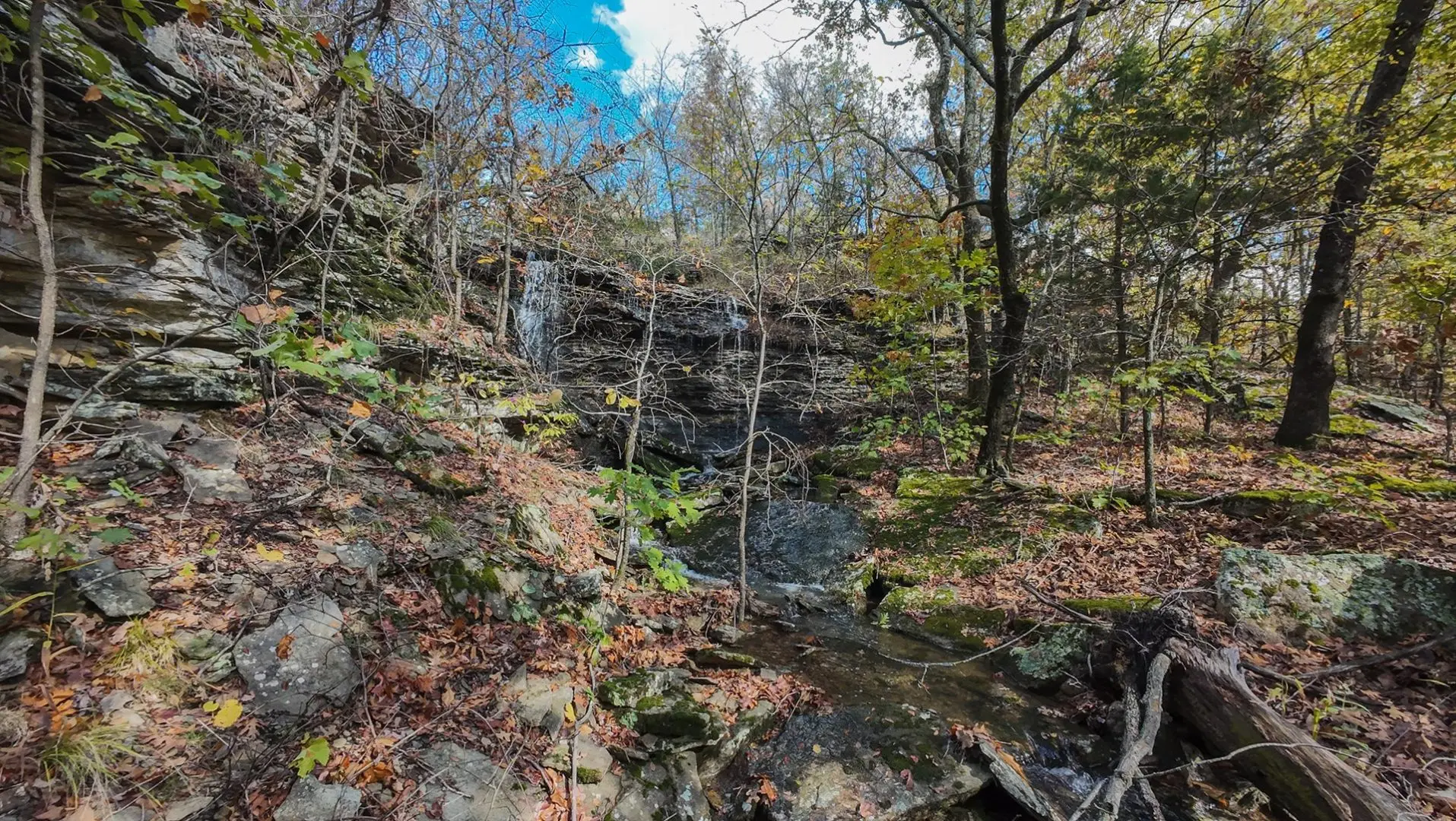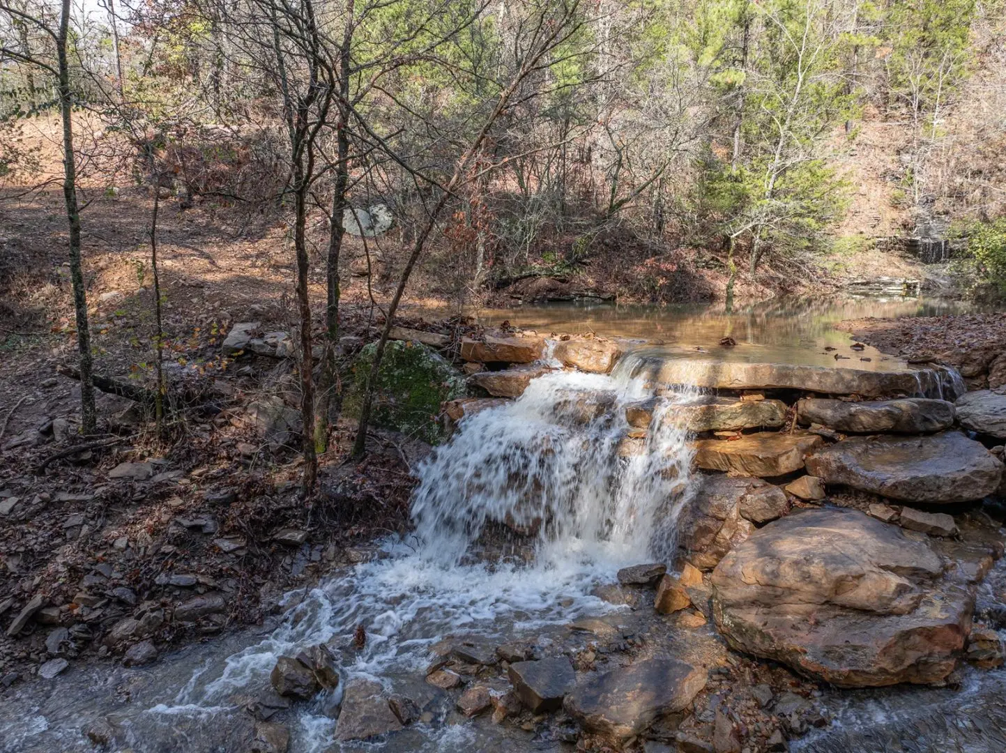 The region is a rugged dissected plateau with numerous peaks and ridges up to 1,100 feet above sea level. The Cooksons are drained by tributaries of the Illinois River (Arkansas). They are heavily wooded, predominantly oak, with patches of black walnut and hickory trees. There are three nice waterfalls on the ranch and numerous springs located throughout.
