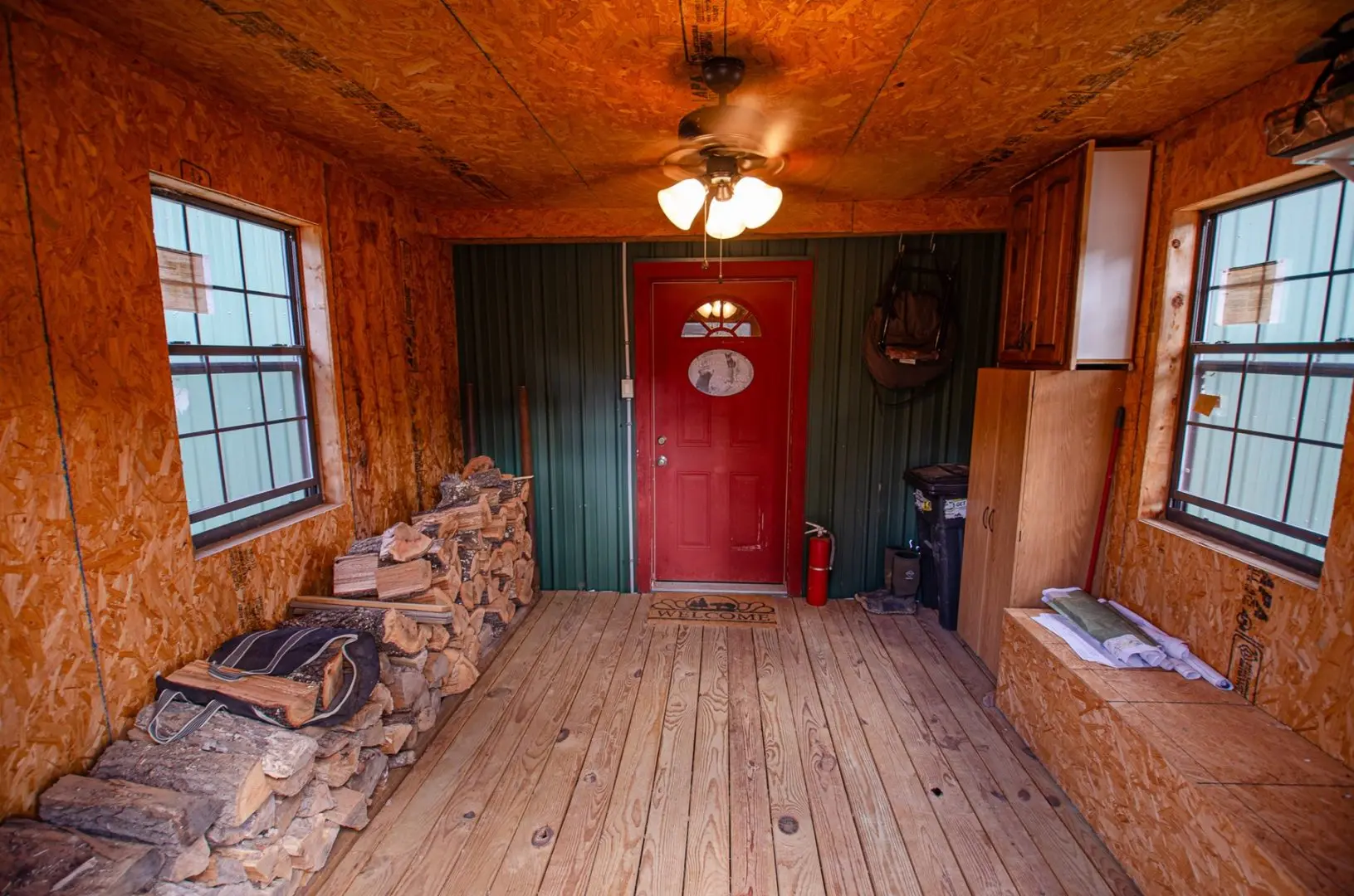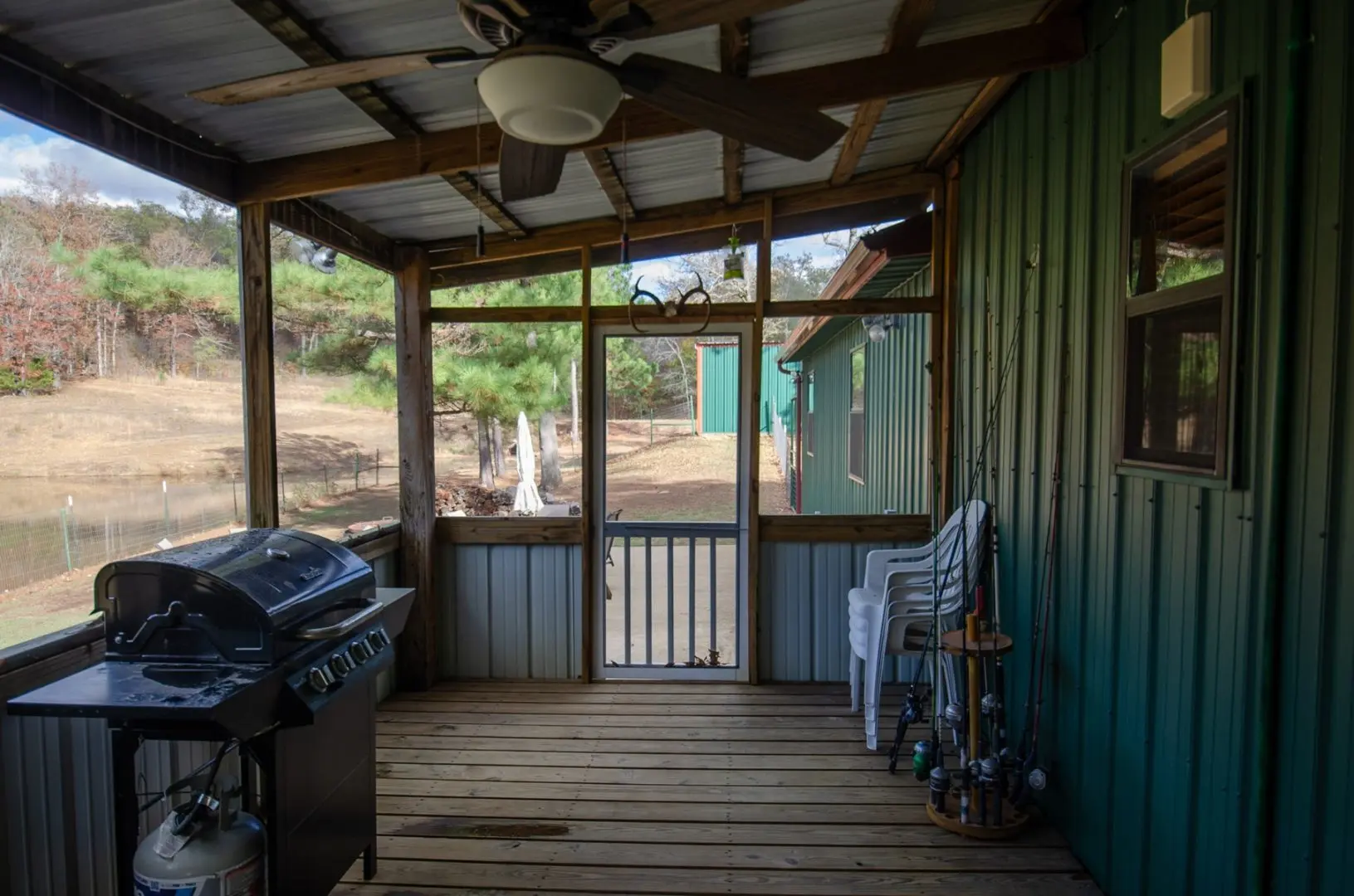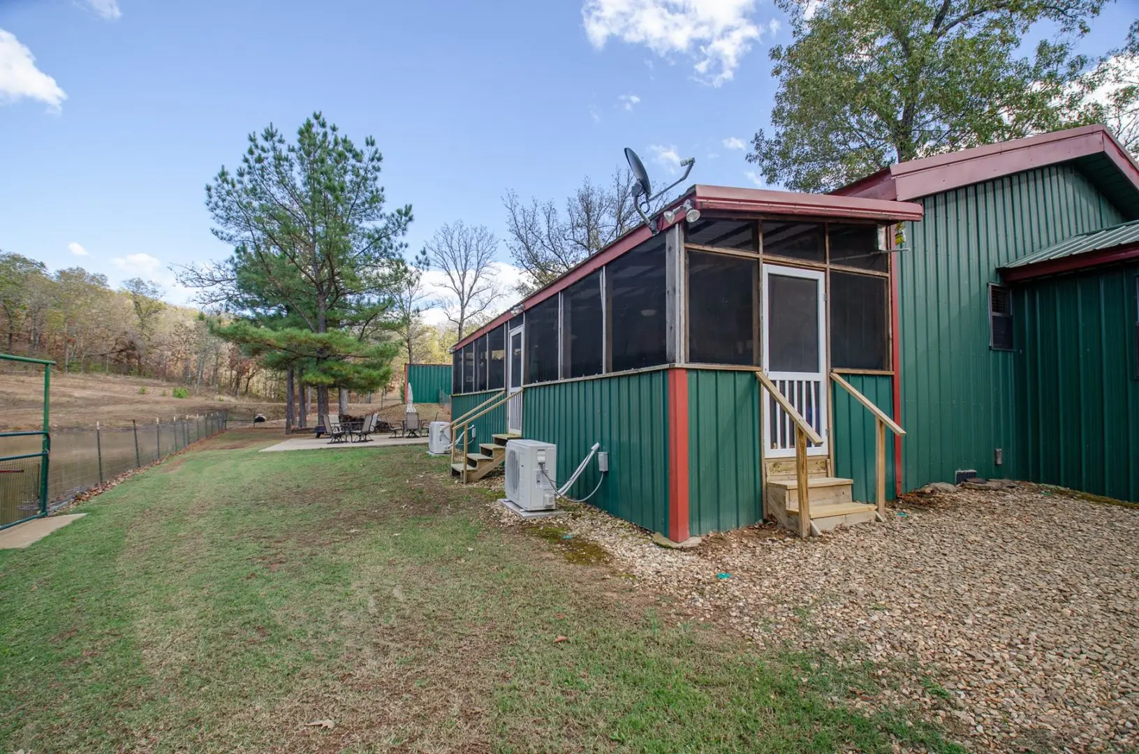 The home is 2100 sq ft, fully furnished, and has three bedrooms and two baths. It has a mudroom with a bench and storage cabinets. There is a covered enclosed patio with a grill, storage, and Refrigerator. There is also a 25 X 25 concrete deck with two sets of patio furniture and an HB 48″ fire pit with grill and shelf. There is a 20KW Backup generator with an auto-transfer switch that will supply all the power in each building.
