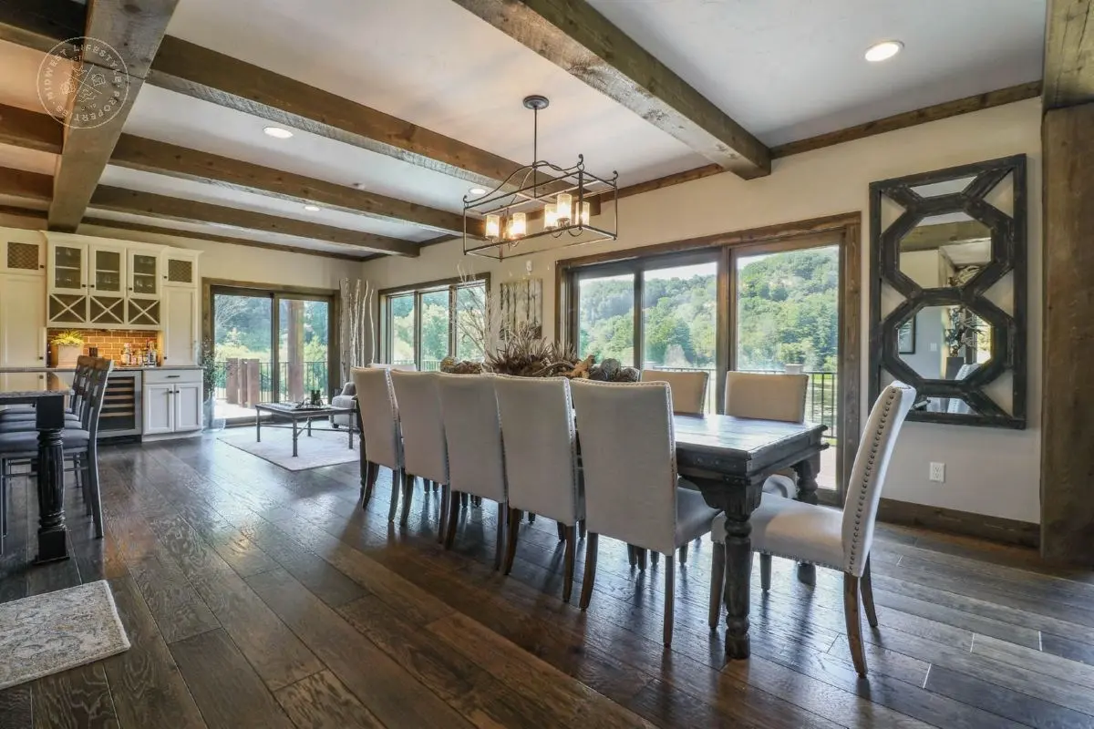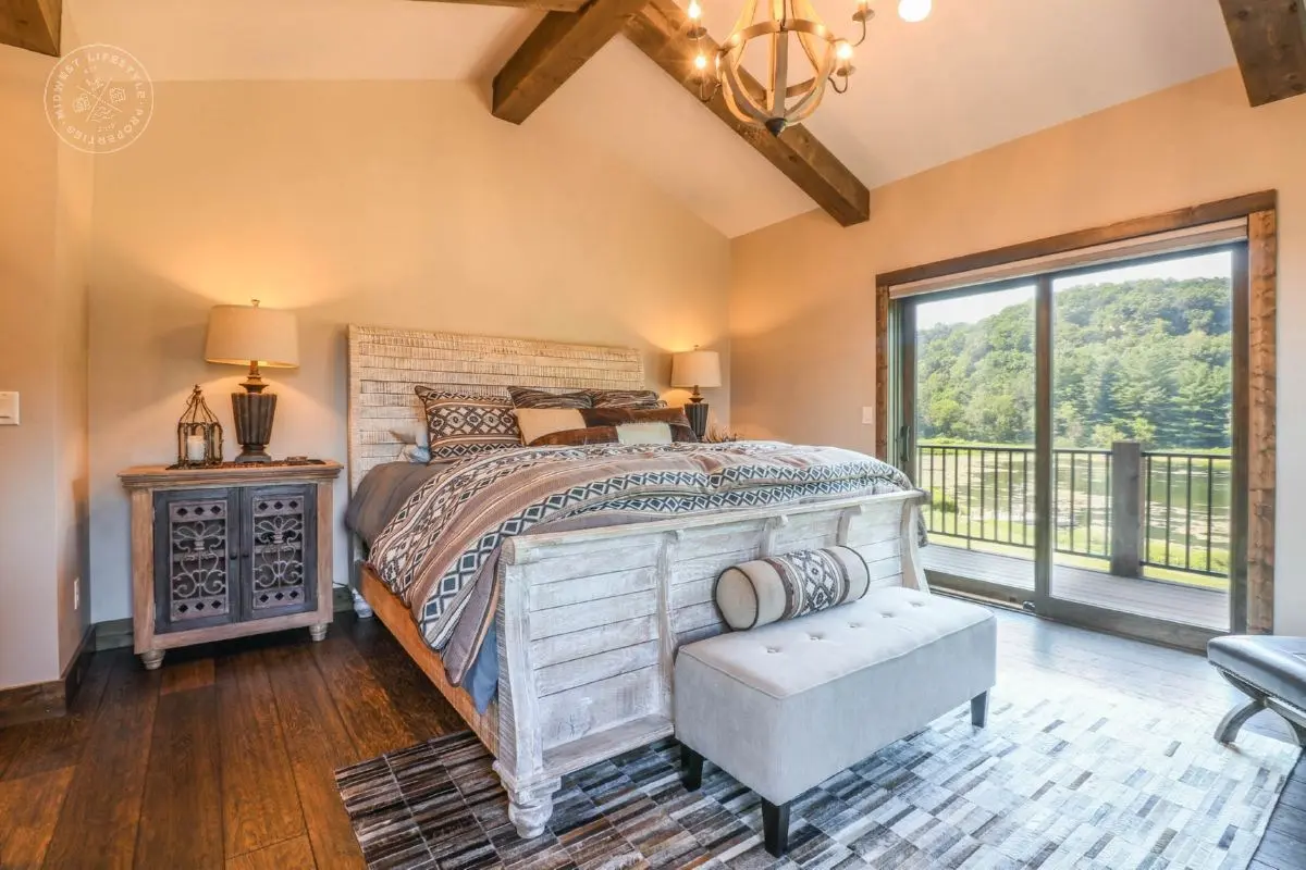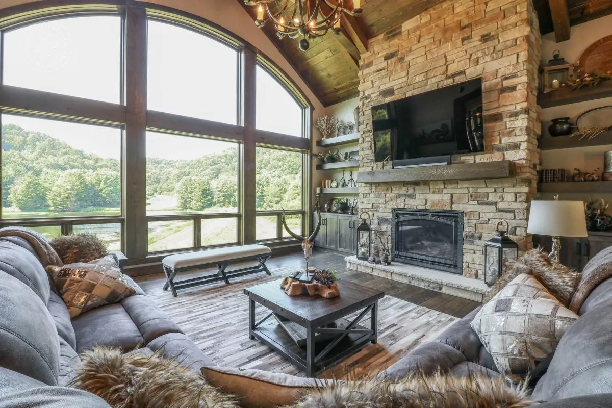 The one-story residence features divine majesty rooted in rustic ambience built to an exacting standard. Fanciful landscaping provides a gracious and welcoming entry while perfectly framing the home and timeless views. The prestigious Lodge overlooks a magnificent 4ac spring fed pond teeming with a variety of fish species. A wraparound composite deck spans across the backside of the home with panoramic rolling bluff views ideal for festive entertaining. The gourmet kitchen is nothing less than a dream decked with granite countertops. All of the appliances within the kitchen are of the highest quality. A custom 6-person island includes a built-in Kohler sink and Jenn-Air dishwasher. The open concept kitchen flows into a palatial dining area where you can gaze into nearby wildlife food plots to spot countless whitetail and turkey in their natural habitat from the comforts of your dining table. A dominant floor-to-ceiling gas fireplace accentuates the grand room’s allure. Here, you’ll find double-height architectural windows providing a sensational setting for social gatherings kissed with natural lighting. A master suite features a walk-out patio, expansive walk-in closet and a his-and-her master bathroom featuring a makeup studio. The entire home was specifically built and rendered to provide breathtaking views from every room encapsulating the bliss of being in the middle of your own fairytale