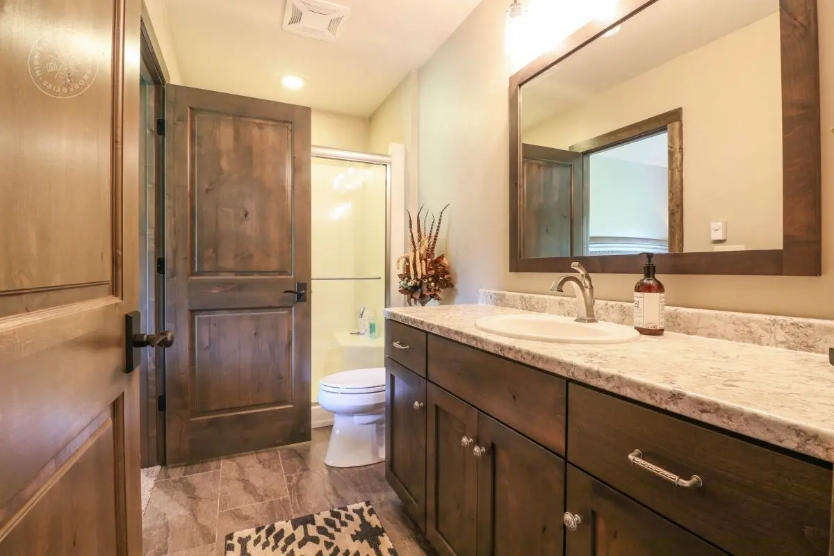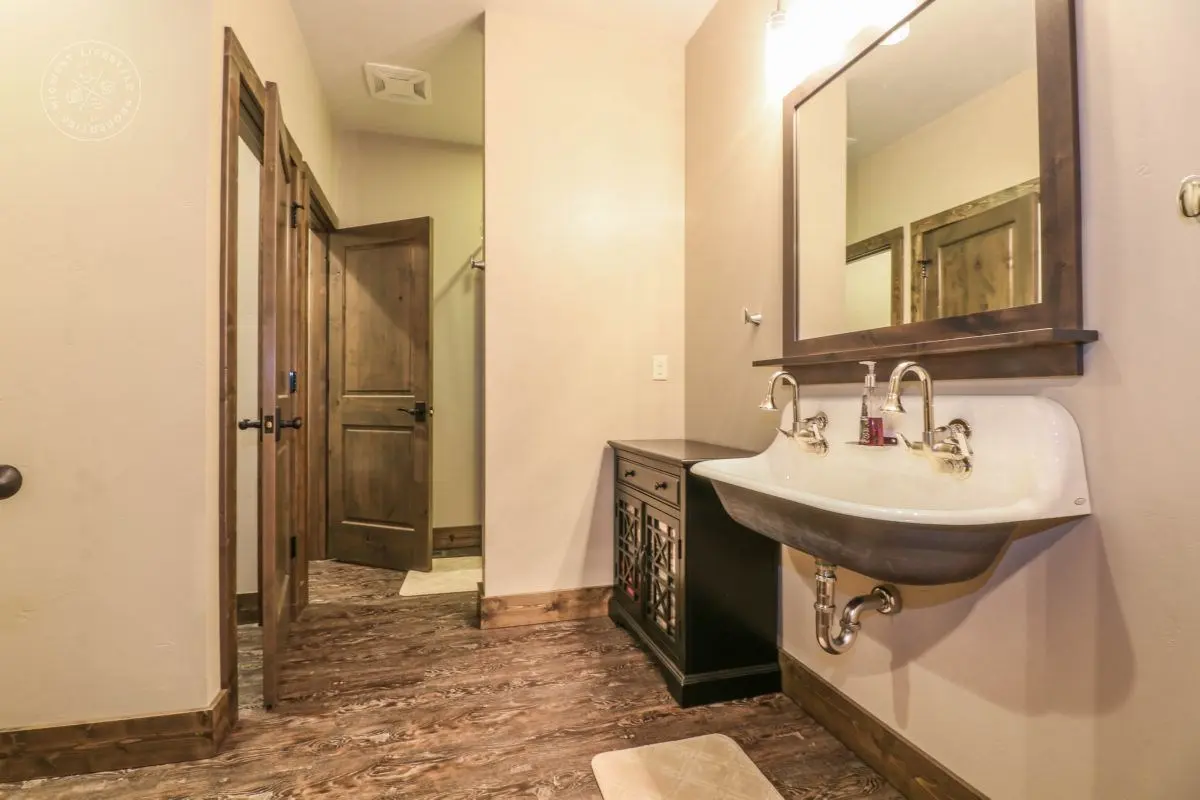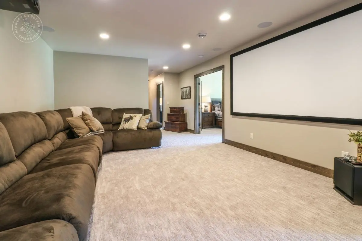 The lower level centerpiece is a dramatic theatre room boasting an 8ftx6ft screen. A premium Epson Pro Cinema 6040UB projector displays color-rich performance that offers the ultimate entertainment experience. You’ll find an additional 3-bedrooms in the lower level that each sport their very own full bath, walk-in closet and sliding glass patio door to the pond. A mudroom that connects to the garage is perfectly suited for storage or a hunting locker. There’s even a built-in dog washing station for a good rinse after swimming in the pond or trekking your pets down trails.