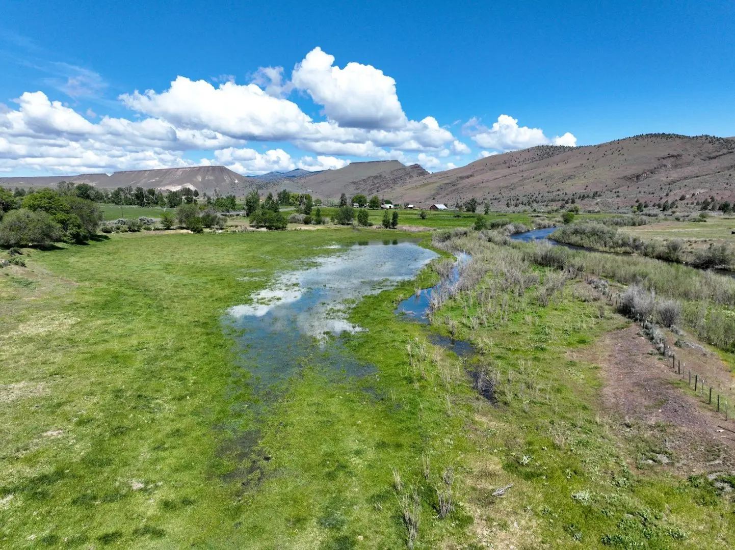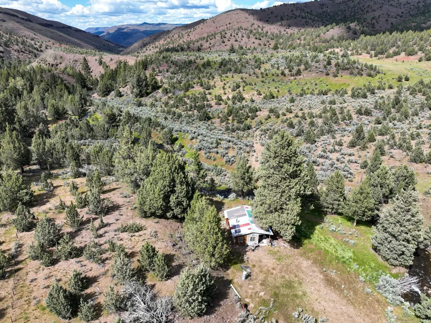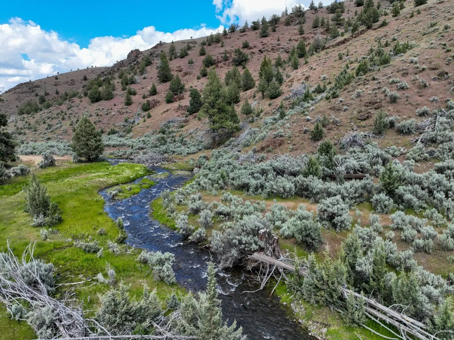 The ranch features an impressive variety of terrain, with dramatic elevation changes ranging from 2,240 to 4,680 feet. Water is found throughout portions of the ranch, with natural springs and creeks weaving through the land before feeding into the John Day River, which flows for approximately 1.75 miles across the property. Notable water sources include Day Creek, Little Rattlesnake Creek, and Rattlesnake Creek, which serve as primary tributaries. Irrigation is sourced from both the John Day River and Cottonwood Creek, supporting approximately 260.8 acres of water rights.