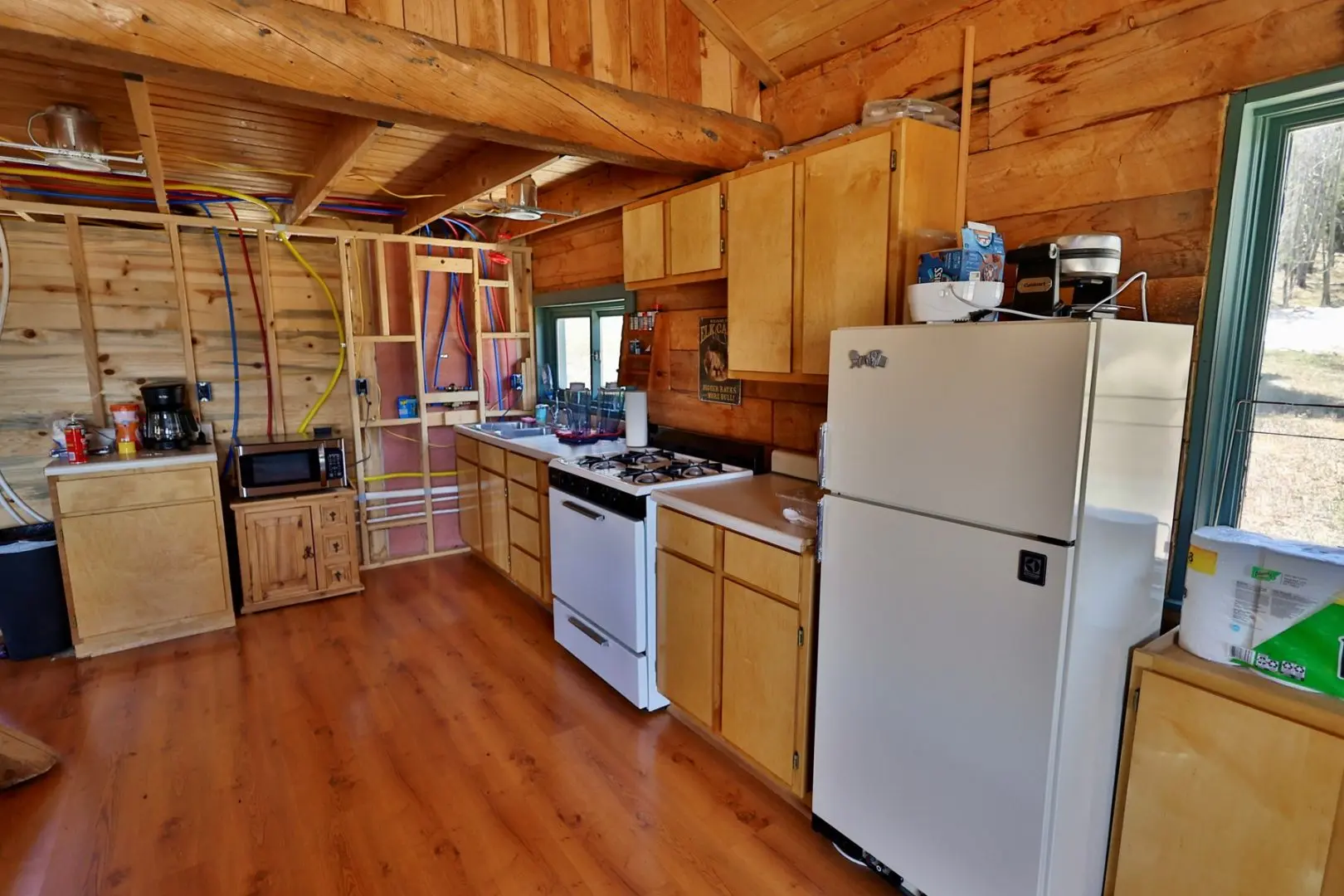 Enjoy the comforts at home in an off-grid 1,350 square foot mountain cabin. With much of the cabin recently remodeled, the current owners have made significant improvements. In the interior they’ve added new wiring, bathroom counters, tile floors, new tile shower with two shower heads, new toilet, lighting, carpet in main bedroom, Rinnai tankless water heater, solar panels with battery bank backed up with a vanguard propane generator and 500-gallon tank, new water well drilled with excellent water production, and more.