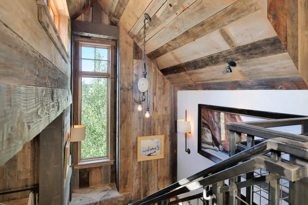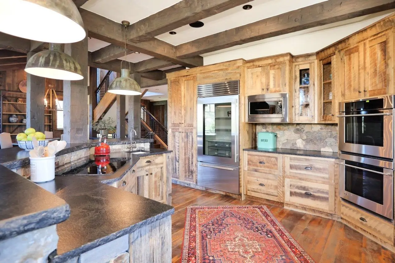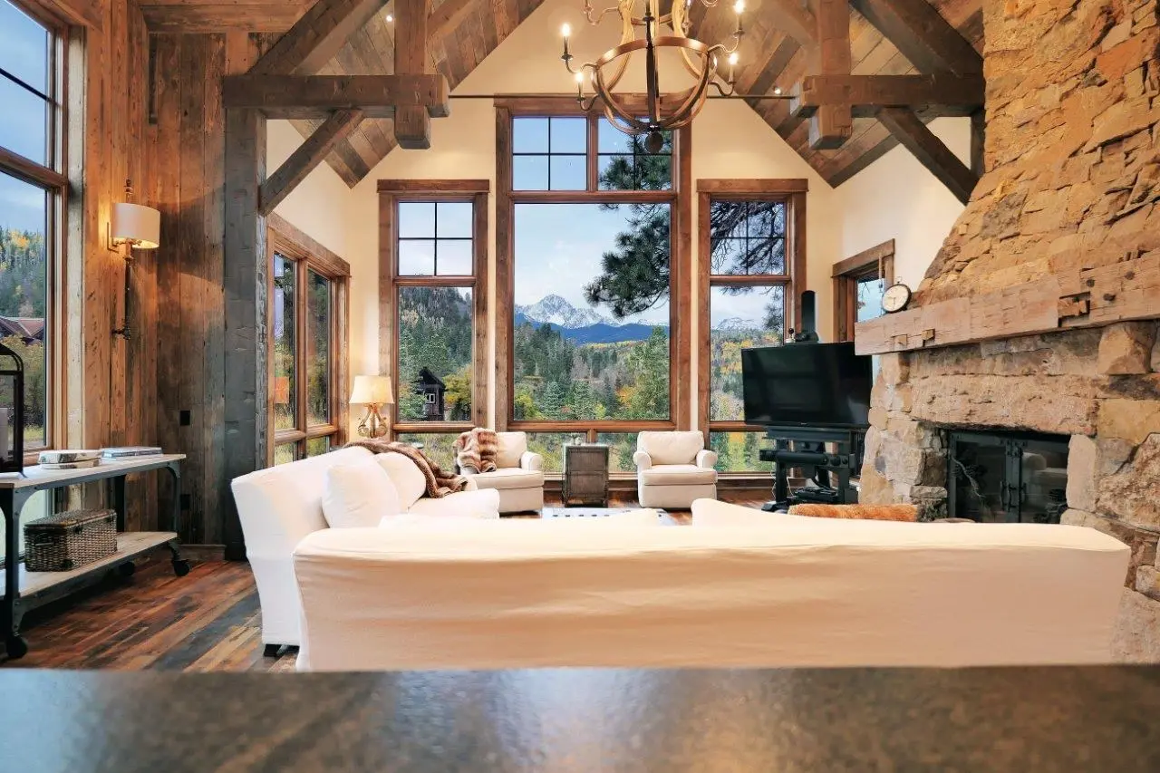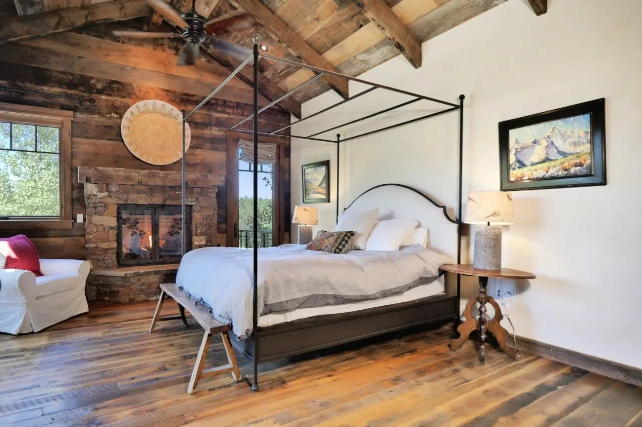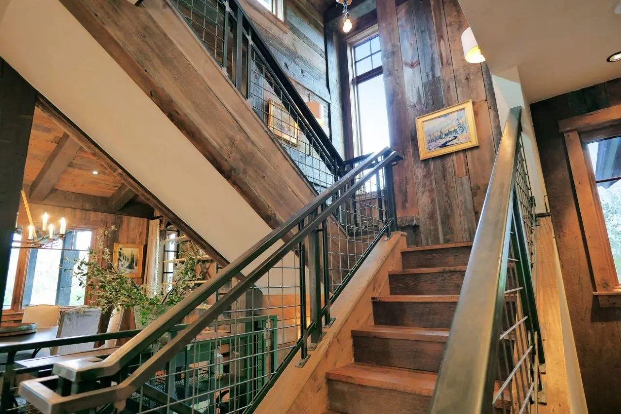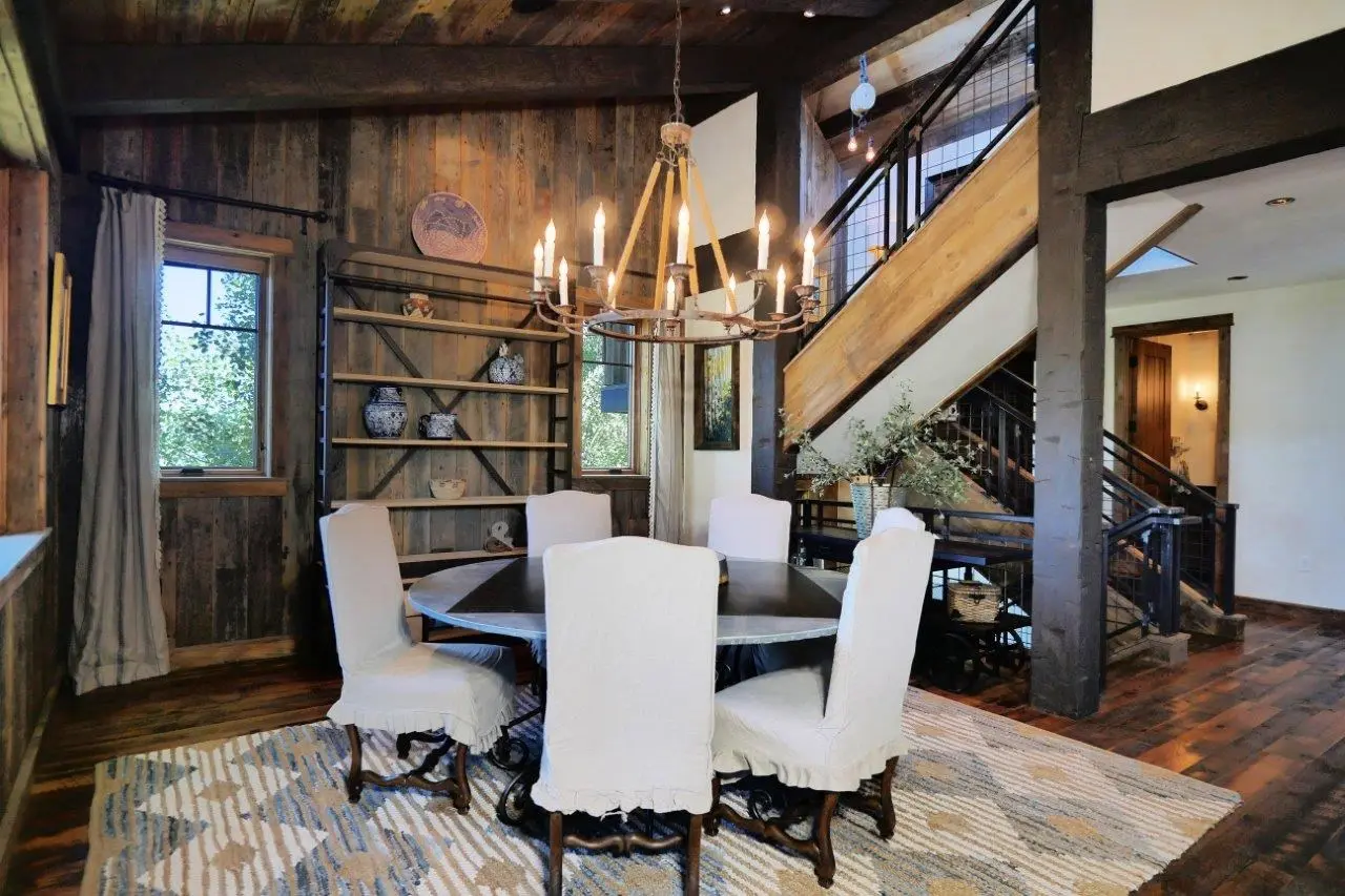 The home, nestled amidst towering Ponderosa pines, frames the awe-inspiring Mount Sneffels, evident in nearly every room, especially the soaring 22-foot-high great room. With a thoughtful layout accommodating 8 adults and 8 children, the interior showcases the perfect fusion of materials such as stone, steel, wood, and plaster, including over 30,000 board feet of reclaimed barnwood and antique oak circle-sawn flooring. The meticulous craftsmanship of local artisans is reflected in the masonry and awe-inspiring Douglas-fir timbers sourced from Washington State and British Columbia.