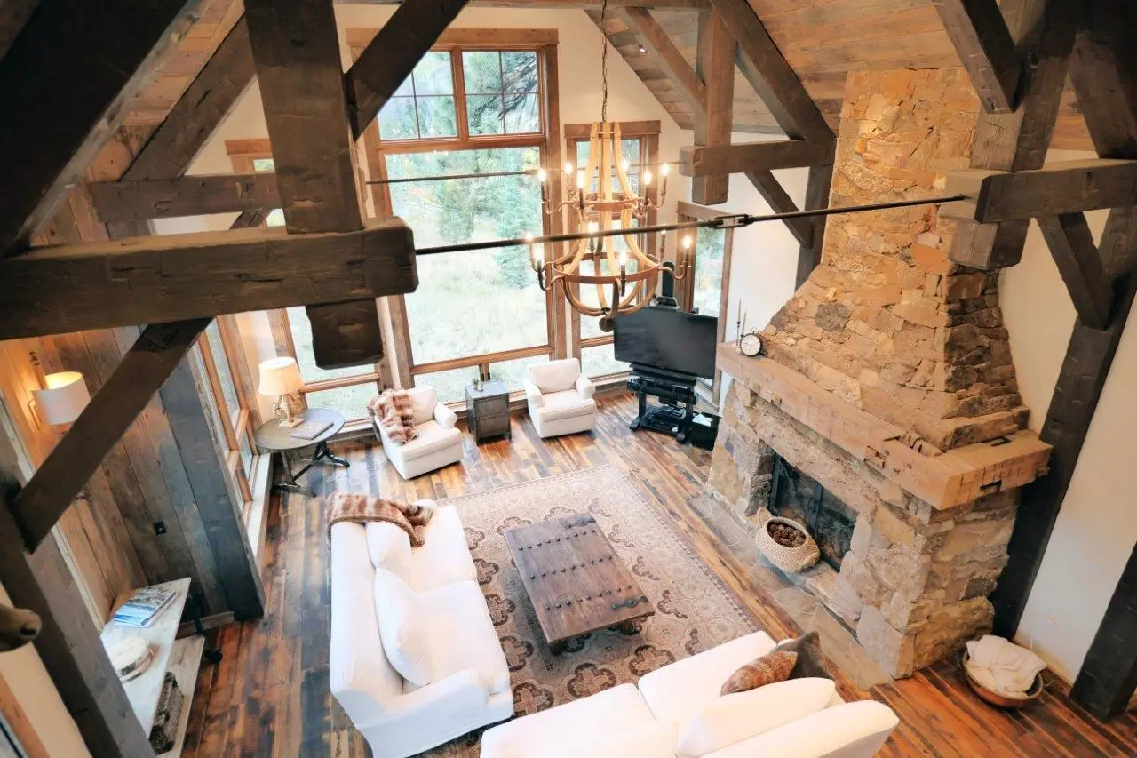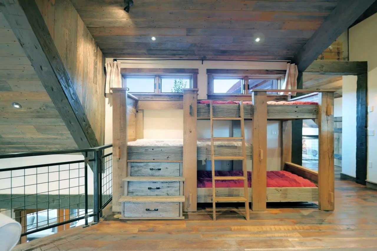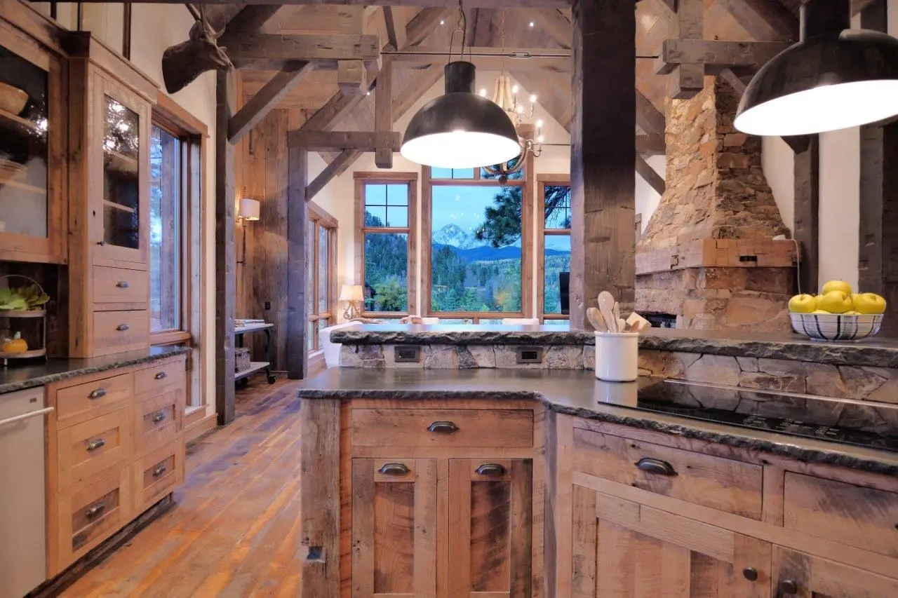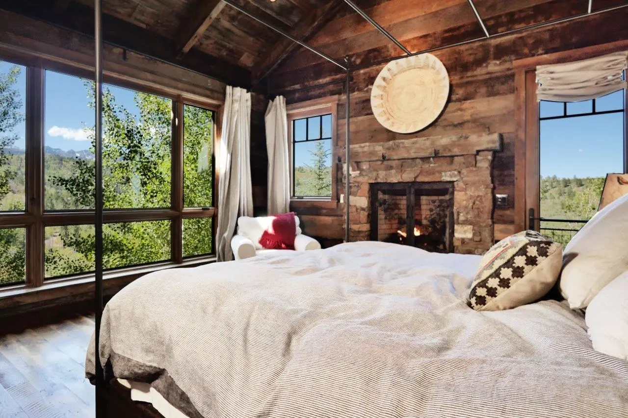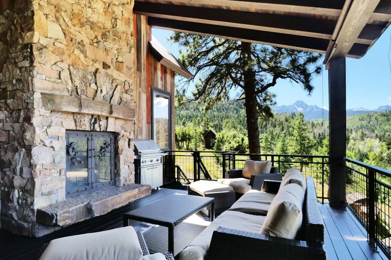 The home, nestled amidst towering Ponderosa pines, frames the awe-inspiring Mount Sneffels, evident in nearly every room, especially the soaring 22-foot-high great room. With a thoughtful layout accommodating 8 adults and 8 children, the interior showcases the perfect fusion of materials such as stone, steel, wood, and plaster, including over 30,000 board feet of reclaimed barnwood and antique oak circle-sawn flooring. The meticulous craftsmanship of local artisans is reflected in the masonry and awe-inspiring Douglas-fir timbers sourced from Washington State and British Columbia.