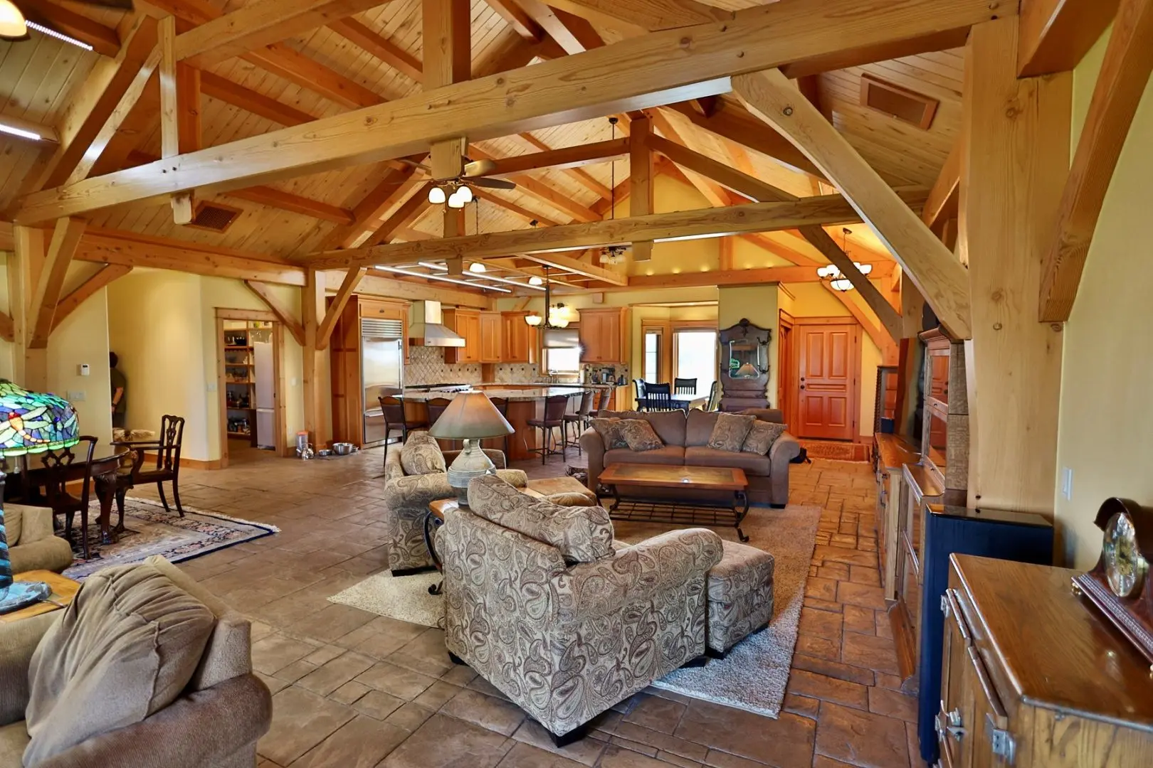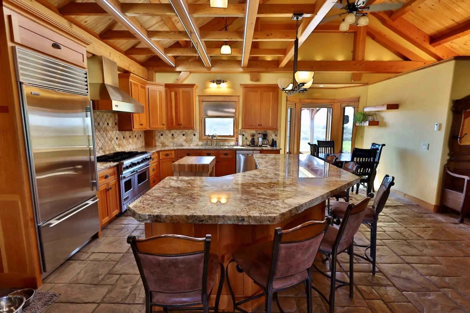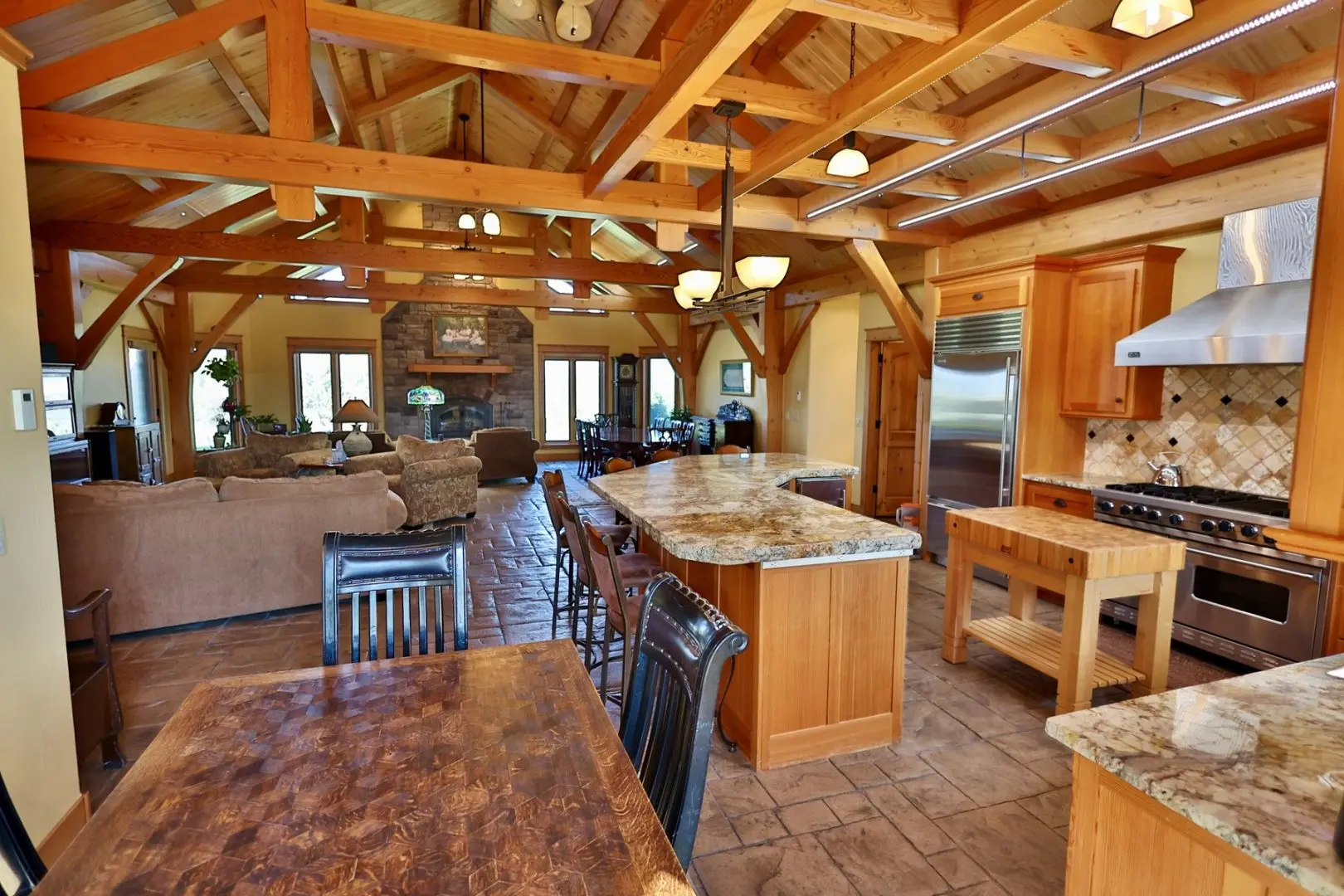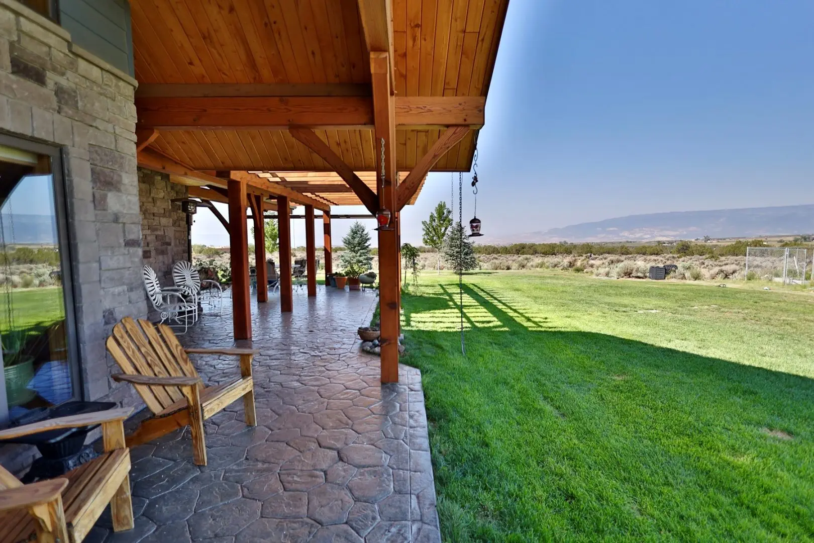 This timber-frame home on almost 47 acres has a spacious footprint of 3,487 square feet with 4 bedrooms and 3 baths, all on one level. There are no stairs in the home. In addition, there are over 1,100 square feet of covered porches for beautiful outdoor living. The main floors, patios, and entryway of the home are all stamped concrete, with in-floor radiant heat throughout the home. The bedrooms are carpeted. The main living area features a beautifully vaulted framework of mortise-and-tenon joinery of Douglas fir timbers. The exterior walls and ceiling are made of structural insulated panels, known for incredible energy efficiency and strength. The spacious kitchen has high-end appliances, including a 6-burner Viking propane stove, Sub-Zero refrigerator, granite countertops, wine refrigerator, walk-in pantry, and clear Douglas fir cabinets. The master suite features a 5-piece bath and spacious walk-in closet, along with an outside porch access to see the Western sunset. On the east end of the house are three other bedrooms, one of which is a very large hobby room that could double as a workout room, dance or music studio, or family room. Adjacent to that is a third bathroom and a comfortable office. The home has a total of three fireplaces in the living room, master suite, and hobby room for cozy winter heat. Summer cooling is provided by twin evaporative coolers. The home has a spacious 3-car attached garage. There is no HOA and there are no covenants.