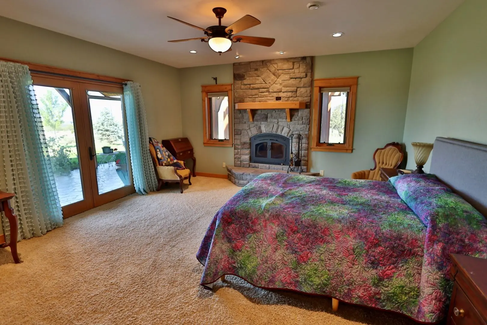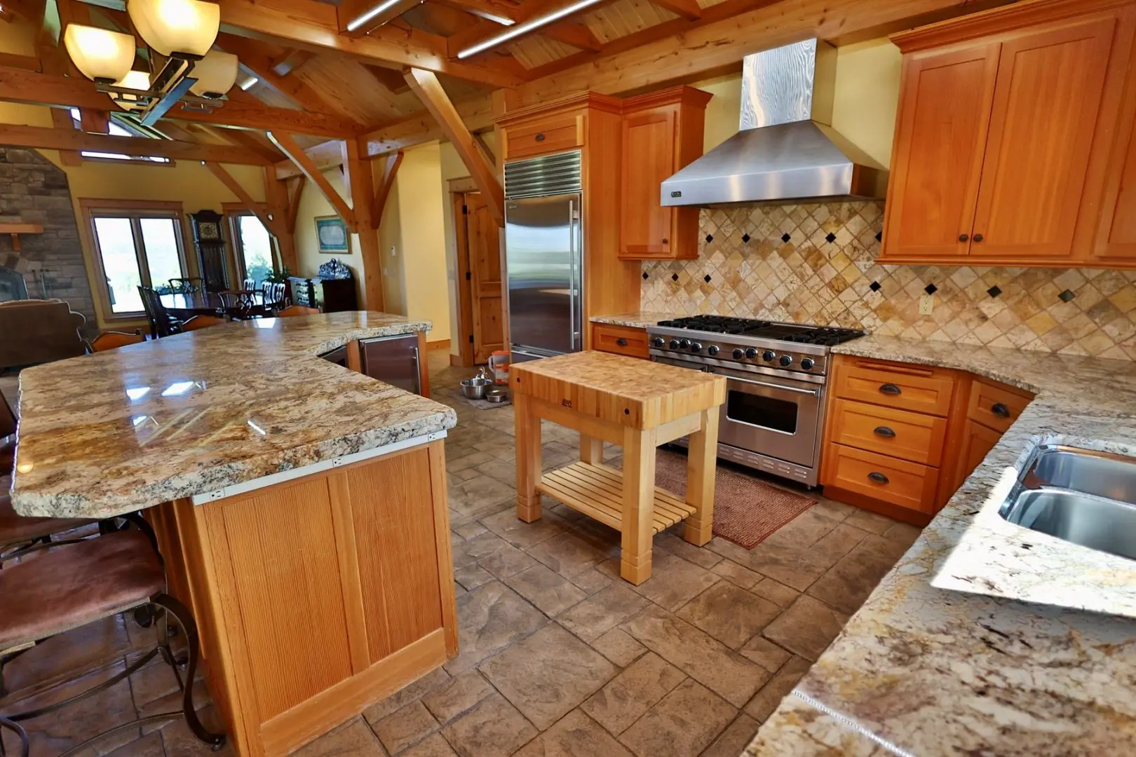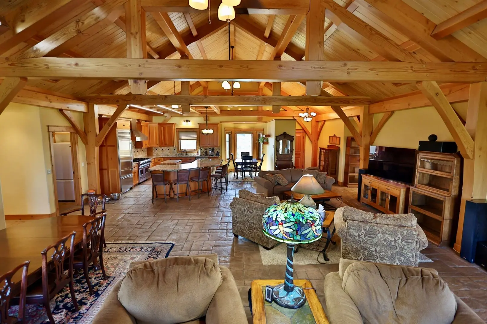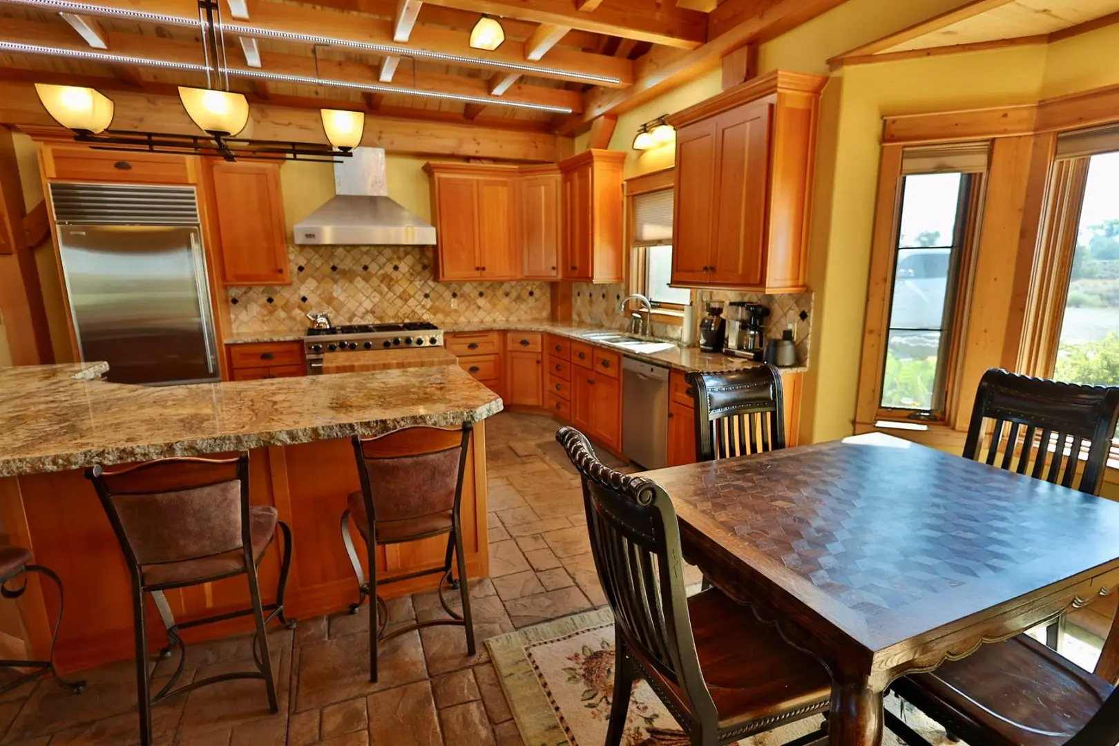 This timber-frame home on almost 47 acres has a spacious footprint of 3,487 square feet with 4 bedrooms and 3 baths, all on one level. There are no stairs in the home. In addition, there are over 1,100 square feet of covered porches for beautiful outdoor living. The main floors, patios, and entryway of the home are all stamped concrete, with in-floor radiant heat throughout the home. The bedrooms are carpeted. The main living area features a beautifully vaulted framework of mortise-and-tenon joinery of Douglas fir timbers. The exterior walls and ceiling are made of structural insulated panels, known for incredible energy efficiency and strength. The spacious kitchen has high-end appliances, including a 6-burner Viking propane stove, Sub-Zero refrigerator, granite countertops, wine refrigerator, walk-in pantry, and clear Douglas fir cabinets. The master suite features a 5-piece bath and spacious walk-in closet, along with an outside porch access to see the Western sunset. On the east end of the house are three other bedrooms, one of which is a very large hobby room that could double as a workout room, dance or music studio, or family room. Adjacent to that is a third bathroom and a comfortable office. The home has a total of three fireplaces in the living room, master suite, and hobby room for cozy winter heat. Summer cooling is provided by twin evaporative coolers. The home has a spacious 3-car attached garage. There is no HOA and there are no covenants.