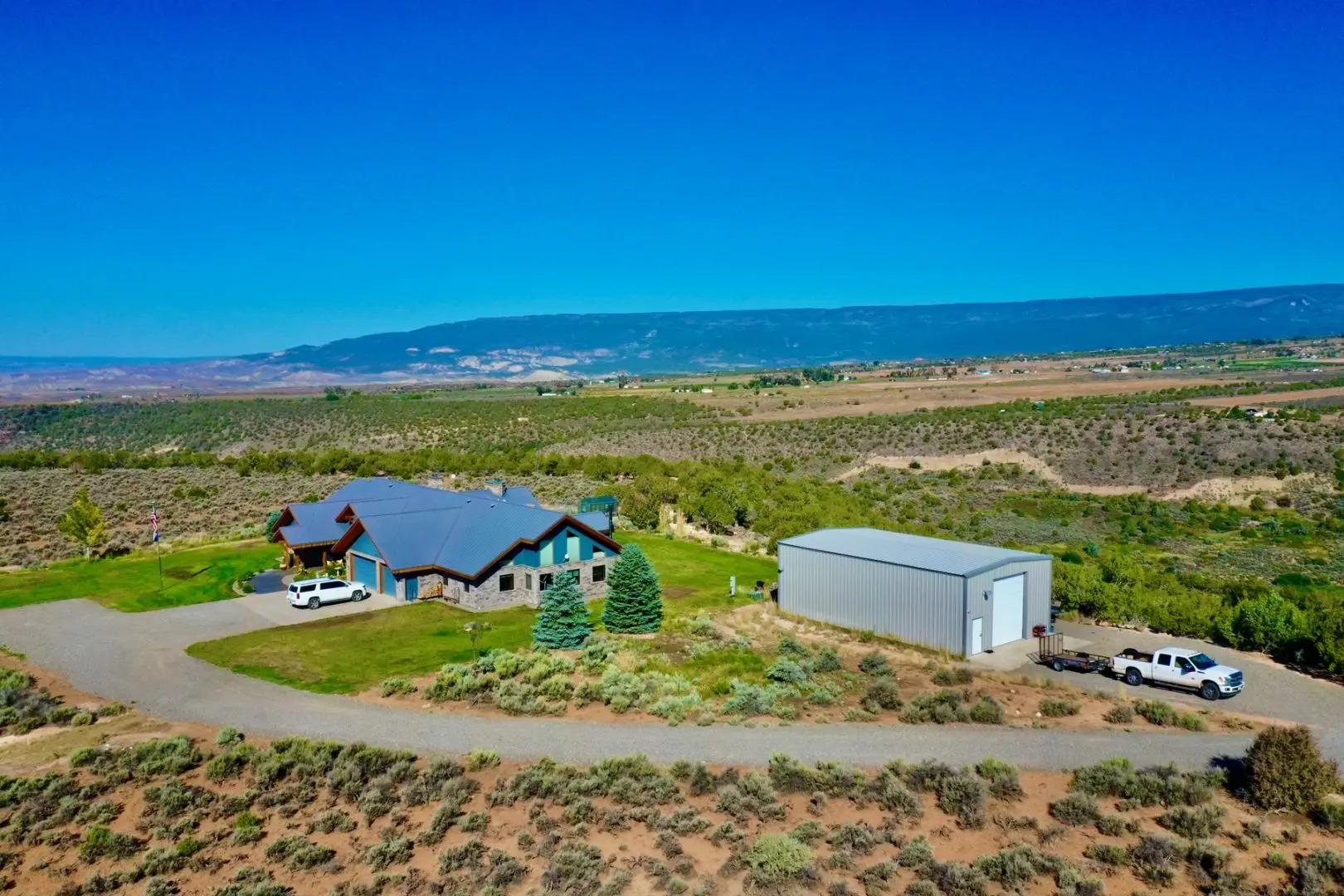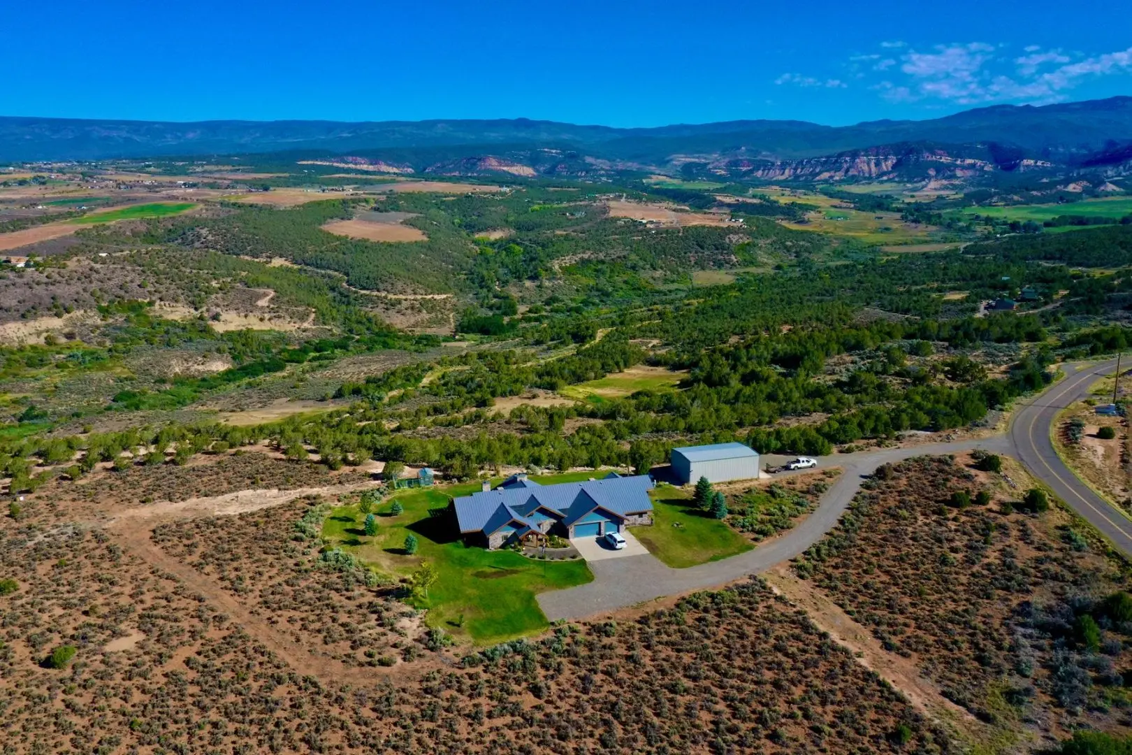 Offered for sale is a lovely country estate on almost 47 spectacular mountain acres west of Hotchkiss, Colorado. The Rimrock Retreat is situated on the western edge of Redlands Mesa overlooking the Currant Creek valley, with expansive views up to the rim of the Grand Mesa, the Uncompahgre Plateau, the Black Canyon, and the faraway San Juan mountains to the south. The timber-frame home was built with comfort, utility, and long-lasting craftsmanship in mind. The home is midway between Hotchkiss and Cedaredge in a quiet rural setting, overlooking hay meadows, orchards, canyons, mesas, and mountain ranges. Nearby properties are typically large well-built homes on large acreages. This is truly one of the nicest homes for miles around.