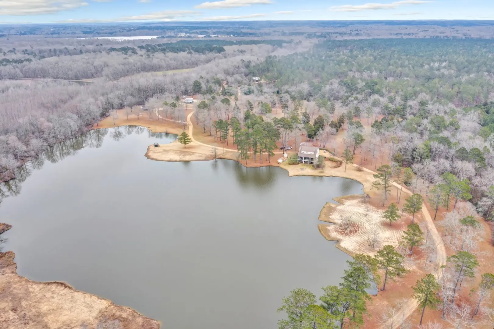 Owl Creek is located on the AL/MS boundary in Pickens County, Alabama, just East of Macon, Mississippi. The yellow brick road truly does end at Owl Creek. When the lodge comes into view, it’s hard not to pull over on the lakeshore and take it in. Perfectly situated on the water’s edge, with 6 bedrooms, 3.5 baths, screened porches, massive dining and entertaining areas, and sunset view that are otherworldly, Owl Creek Lodge grabs your heart from first glance.