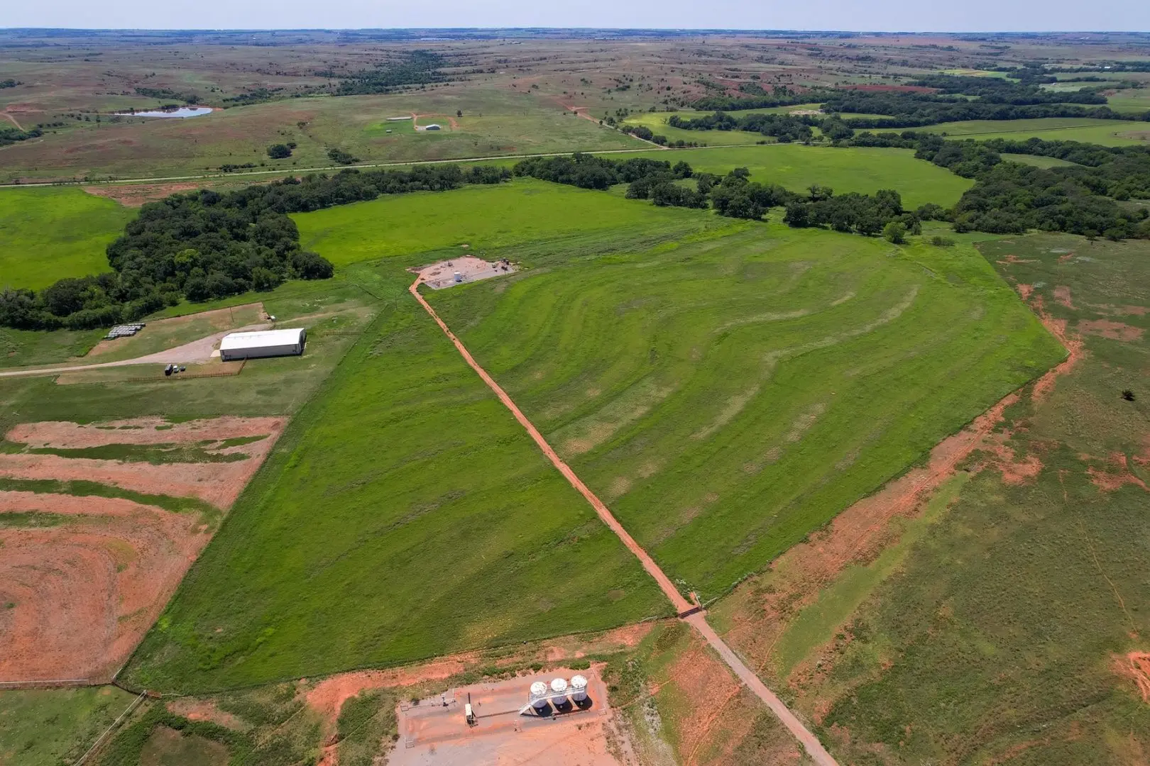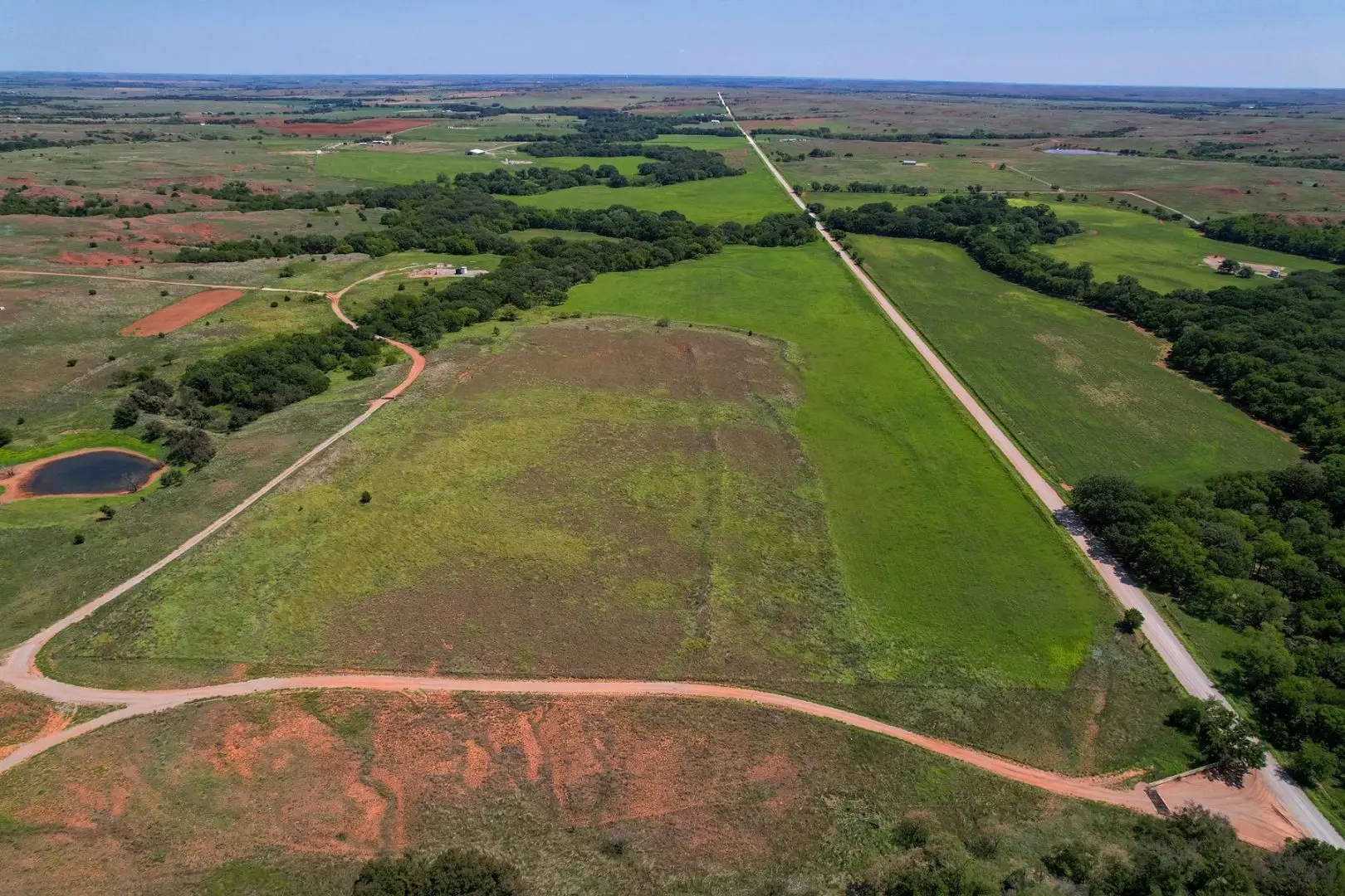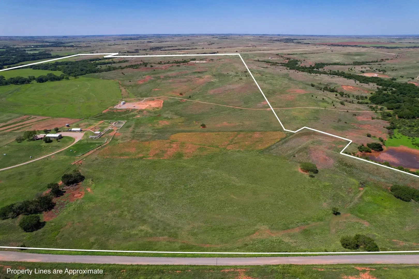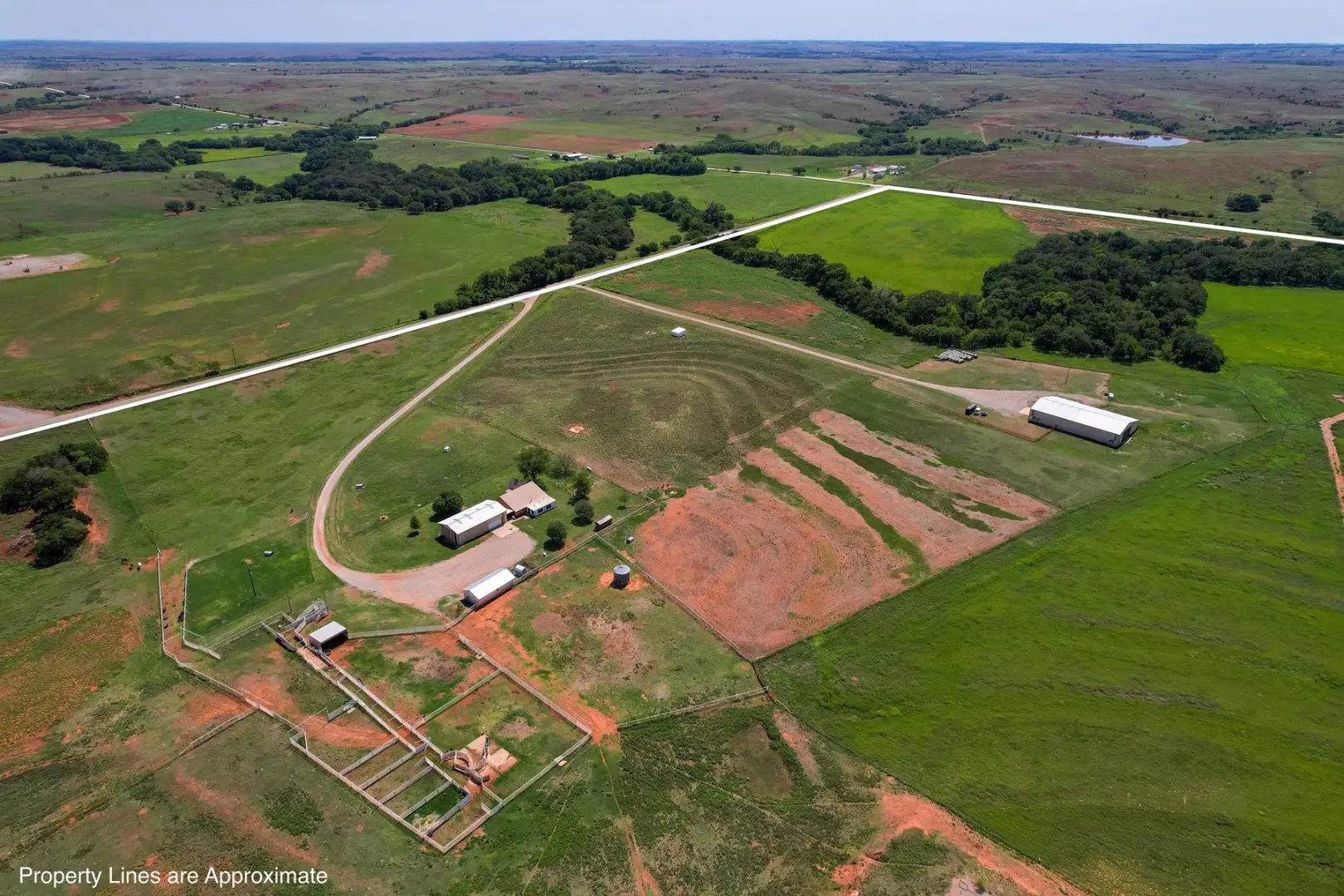 434 Acres MOL for sale in Western Oklahoma. The Washita County farm for sale is located near Foss Lake. The Foss Oklahoma land is suited for a variety of uses including ranching, farming, recreational and hunting. Oak creek runs through the south 160 acres which is composed of mostly bottom ground. The farm for sale includes a 60’ x 120’ Morton Barn with a kitchenette, wash pad, electricity and a 120’ lean to. Located on the eastern side of the property is a 1,500 square foot, 3 bed, 1 bath, county home that has been recently renovated and includes a large sunroom, open kitchen, and a 40’ x 60’ shop. The shop features an overhead door and a full bathroom. Also on the property is a large corral, well house with a 3 1/2 HP pump, 2 water wells, a 2018 Generac 15K generator, and 8 hydrants. The Rural Oklahoma Ranch provides many amenities and features.