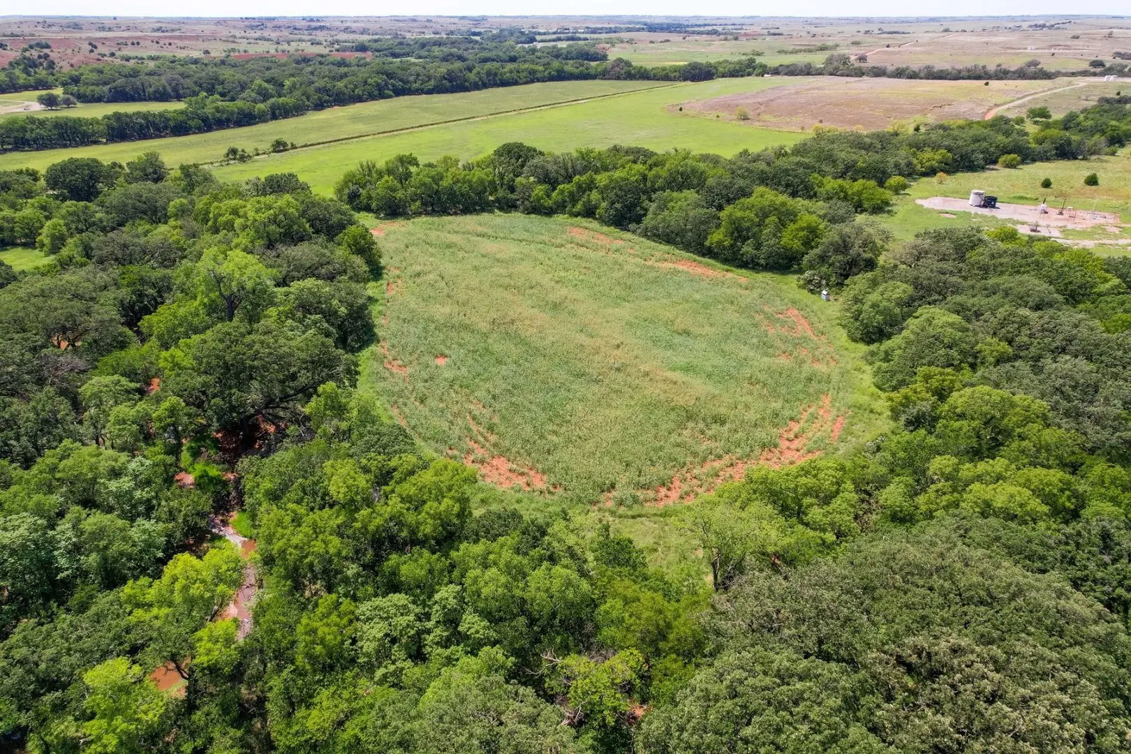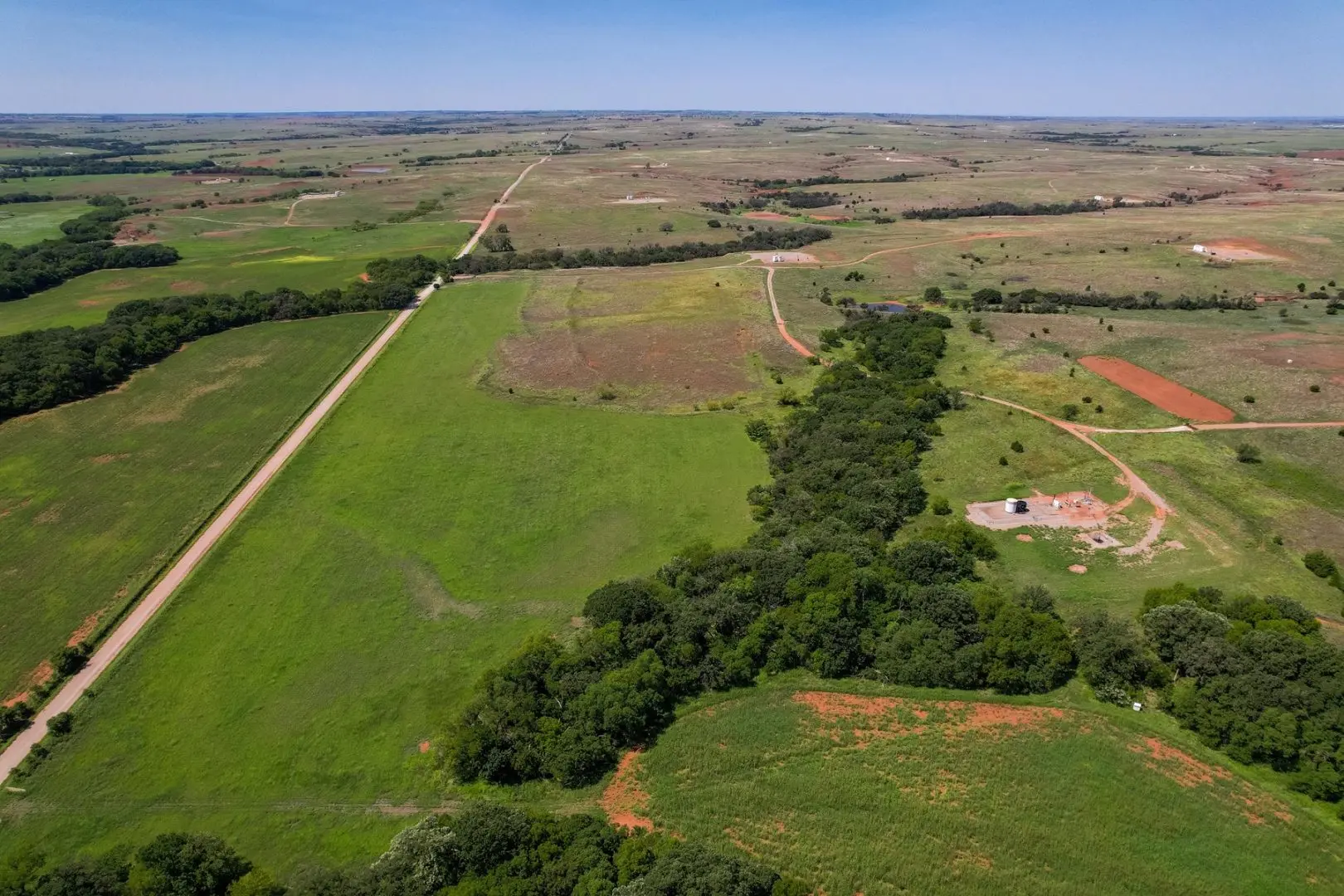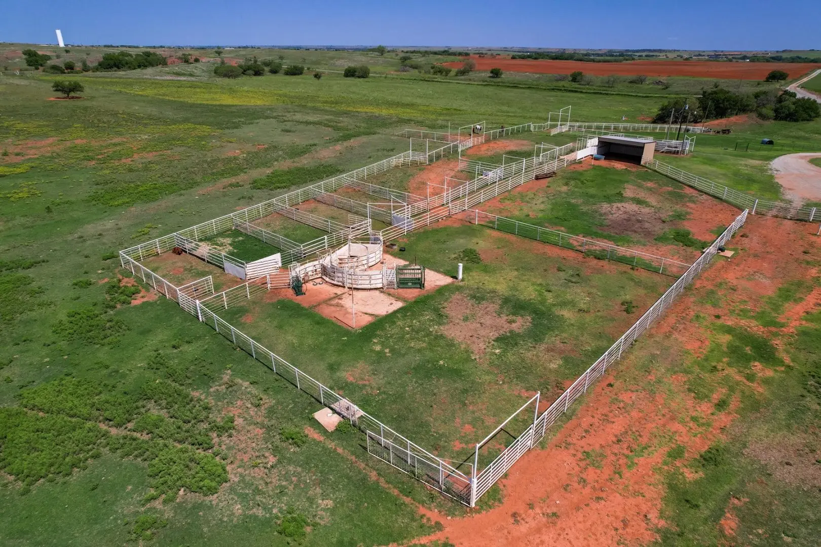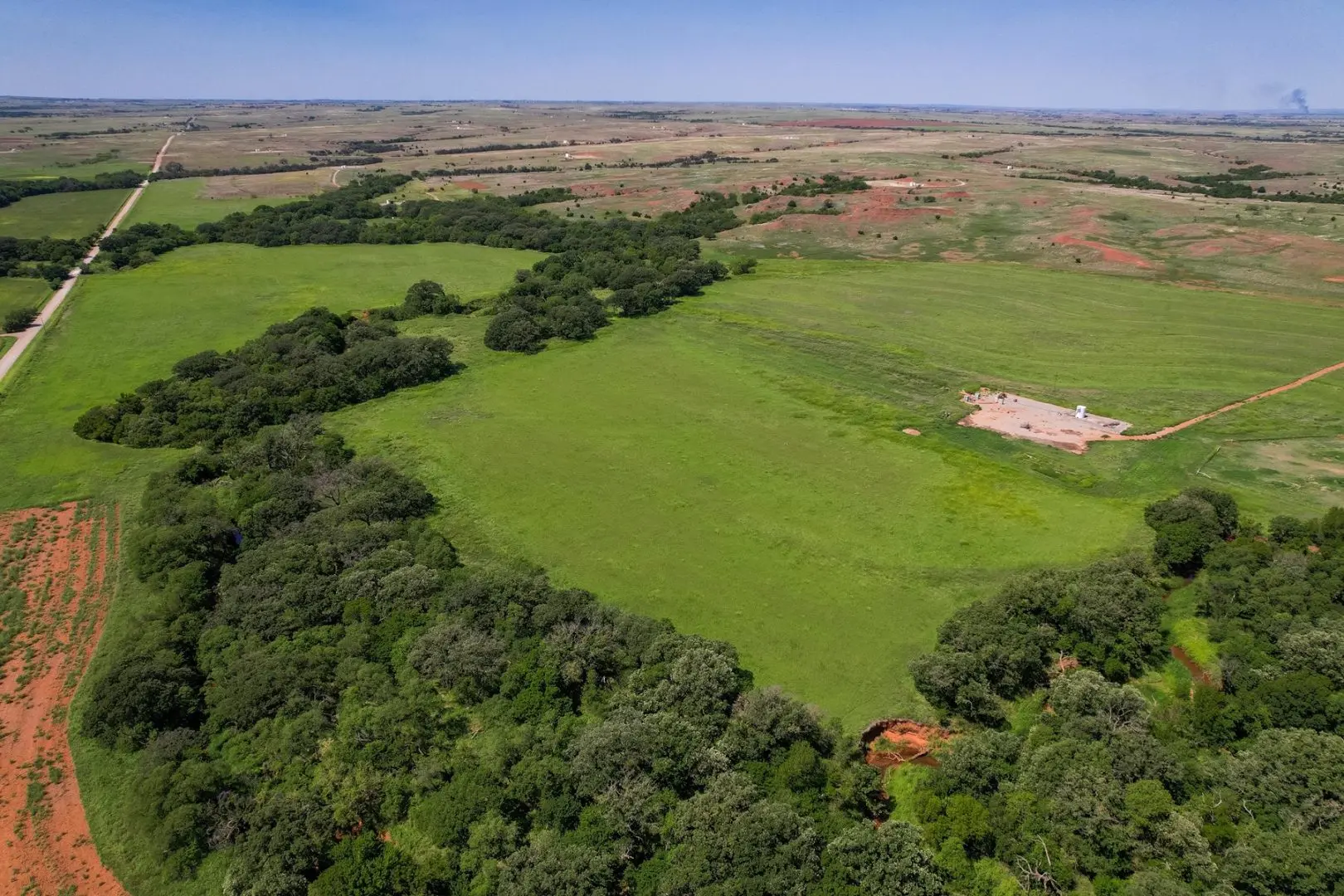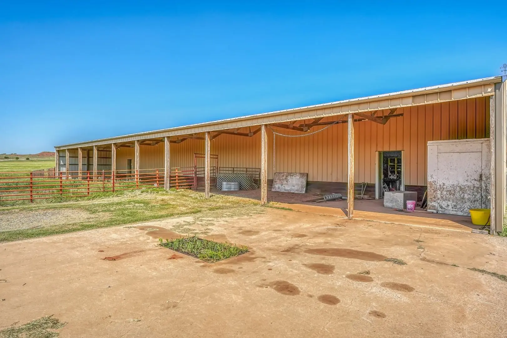 434 Acres MOL for sale in Western Oklahoma. The Washita County farm for sale is located near Foss Lake. The Foss Oklahoma land is suited for a variety of uses including ranching, farming, recreational and hunting. Oak creek runs through the south 160 acres which is composed of mostly bottom ground. The farm for sale includes a 60’ x 120’ Morton Barn with a kitchenette, wash pad, electricity and a 120’ lean to. Located on the eastern side of the property is a 1,500 square foot, 3 bed, 1 bath, county home that has been recently renovated and includes a large sunroom, open kitchen, and a 40’ x 60’ shop. The shop features an overhead door and a full bathroom. Also on the property is a large corral, well house with a 3 1/2 HP pump, 2 water wells, a 2018 Generac 15K generator, and 8 hydrants. The Rural Oklahoma Ranch provides many amenities and features.