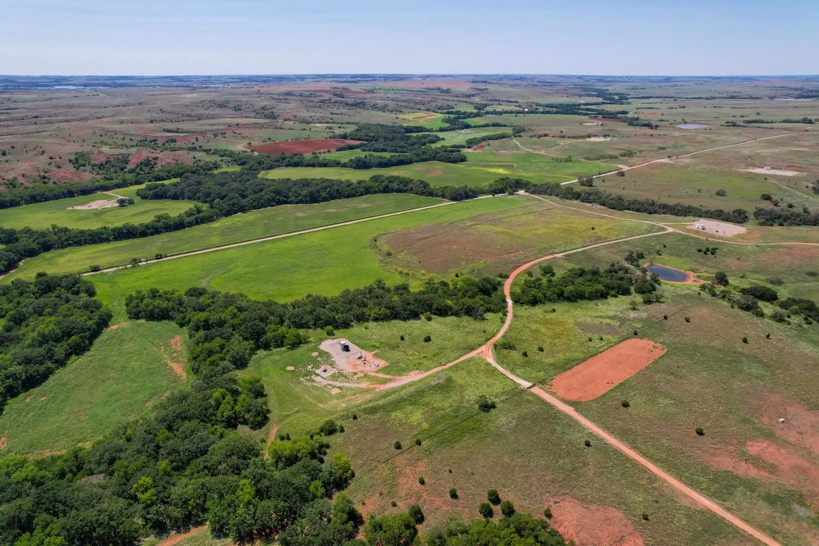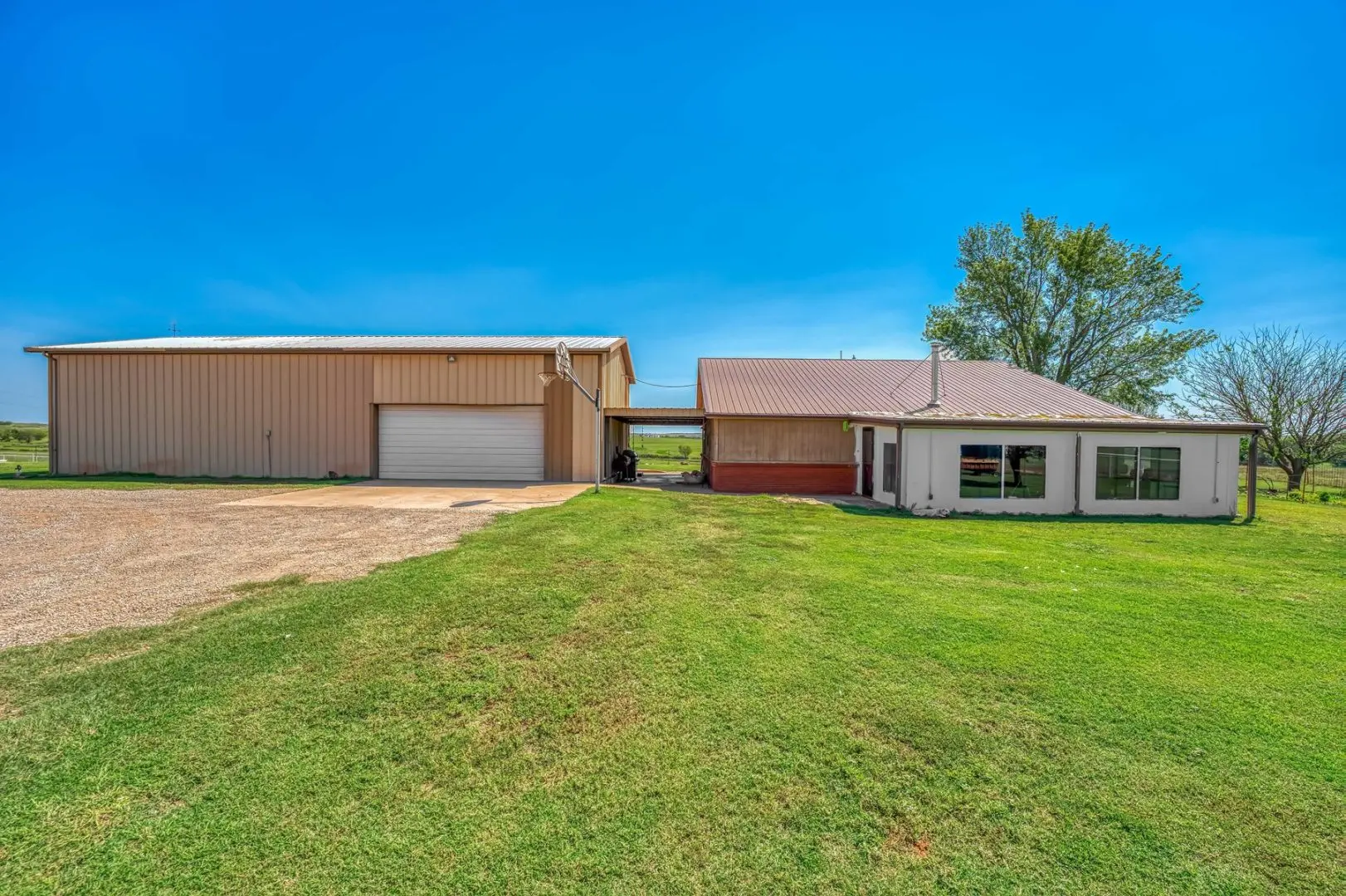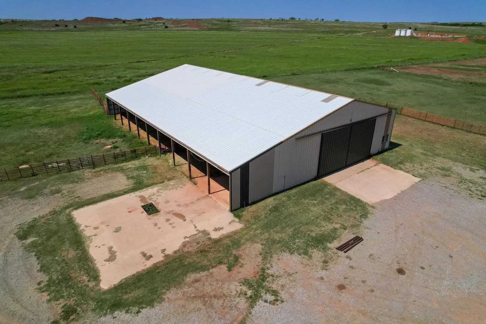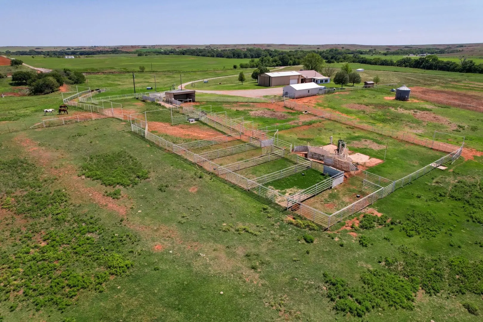 434 Acres MOL for sale in Western Oklahoma. The Washita County farm for sale is located near Foss Lake. The Foss Oklahoma land is suited for a variety of uses including ranching, farming, recreational and hunting. Oak creek runs through the south 160 acres which is composed of mostly bottom ground. The farm for sale includes a 60’ x 120’ Morton Barn with a kitchenette, wash pad, electricity and a 120’ lean to. Located on the eastern side of the property is a 1,500 square foot, 3 bed, 1 bath, county home that has been recently renovated and includes a large sunroom, open kitchen, and a 40’ x 60’ shop. The shop features an overhead door and a full bathroom. Also on the property is a large corral, well house with a 3 1/2 HP pump, 2 water wells, a 2018 Generac 15K generator, and 8 hydrants. The Rural Oklahoma Ranch provides many amenities and features.