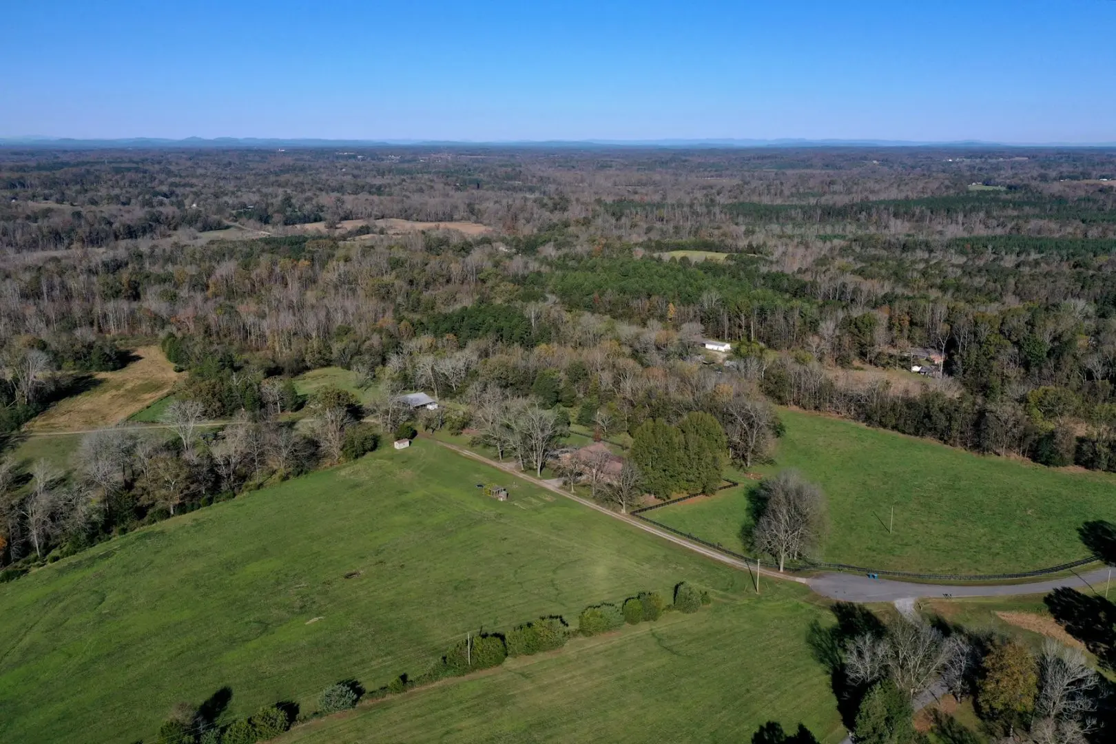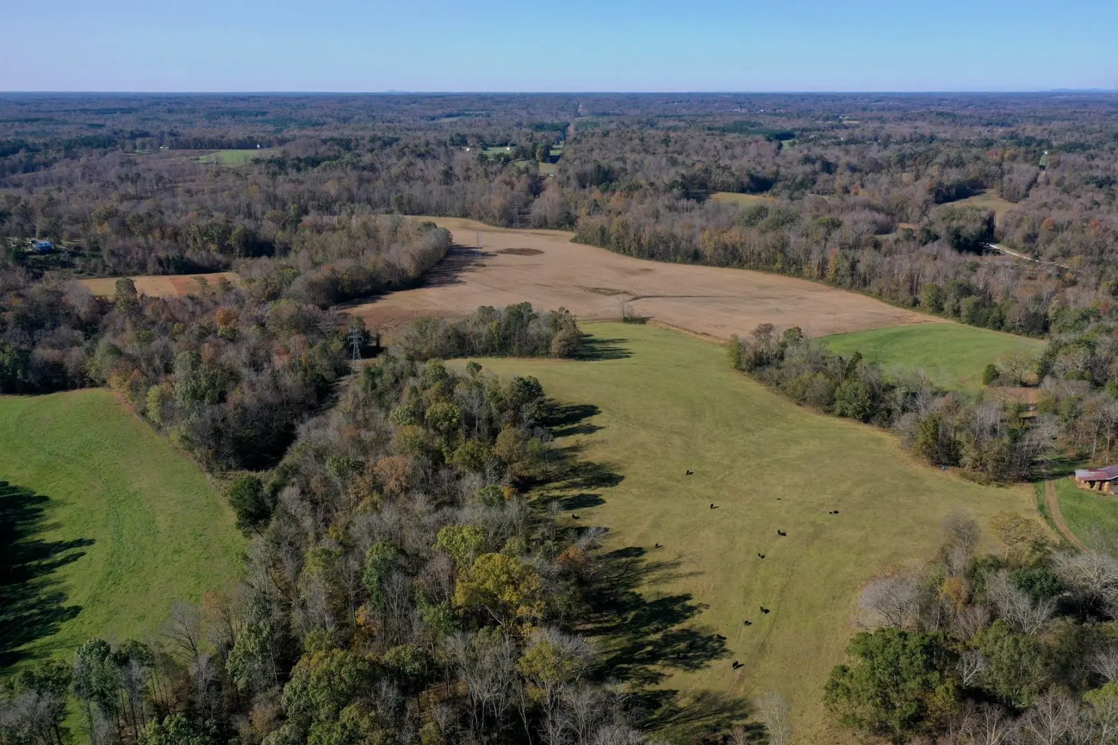 Tucked at the back end of a small country road in rural Davie County North Carolina, with almost two miles of frontage on Hunting Creek, 60 acres in pasture and hay, 40 acres in row crops, and over a 100 acres in hardwood timber, this property is one that you don’t want to miss! Located only a few minutes from I-40 and shopping and amenities in Mocksville, the property is still very secluded and private. This property consists of around 300 acres and includes multiple fenced pastures, established graveled farm lanes, five cattle waterers, and a two-year-old equipment and hay shed, a 32×48 barn with lean-tos and 200 AMP service, and several other barns and outbuildings. At the front of the property, overlooking one of the pastures, there is a spacious brick ranch home that is large enough for extended family Thanksgiving and Christmas dinners