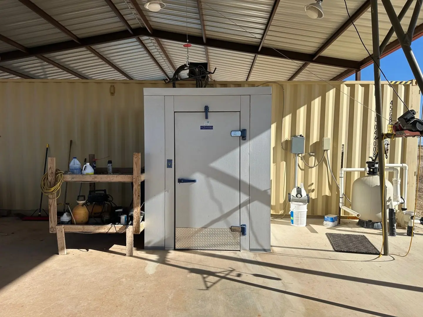 • Skinning rack with electric hoist, a walk-in cooler, and 3 large storage containers