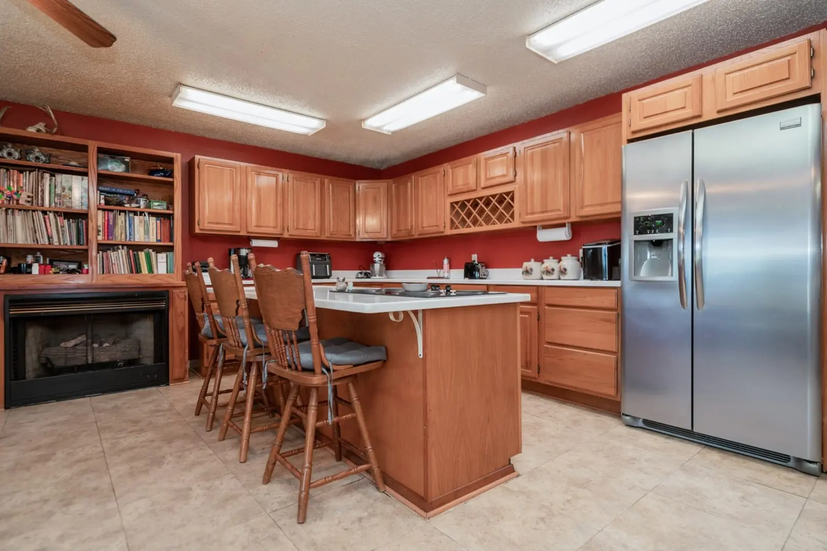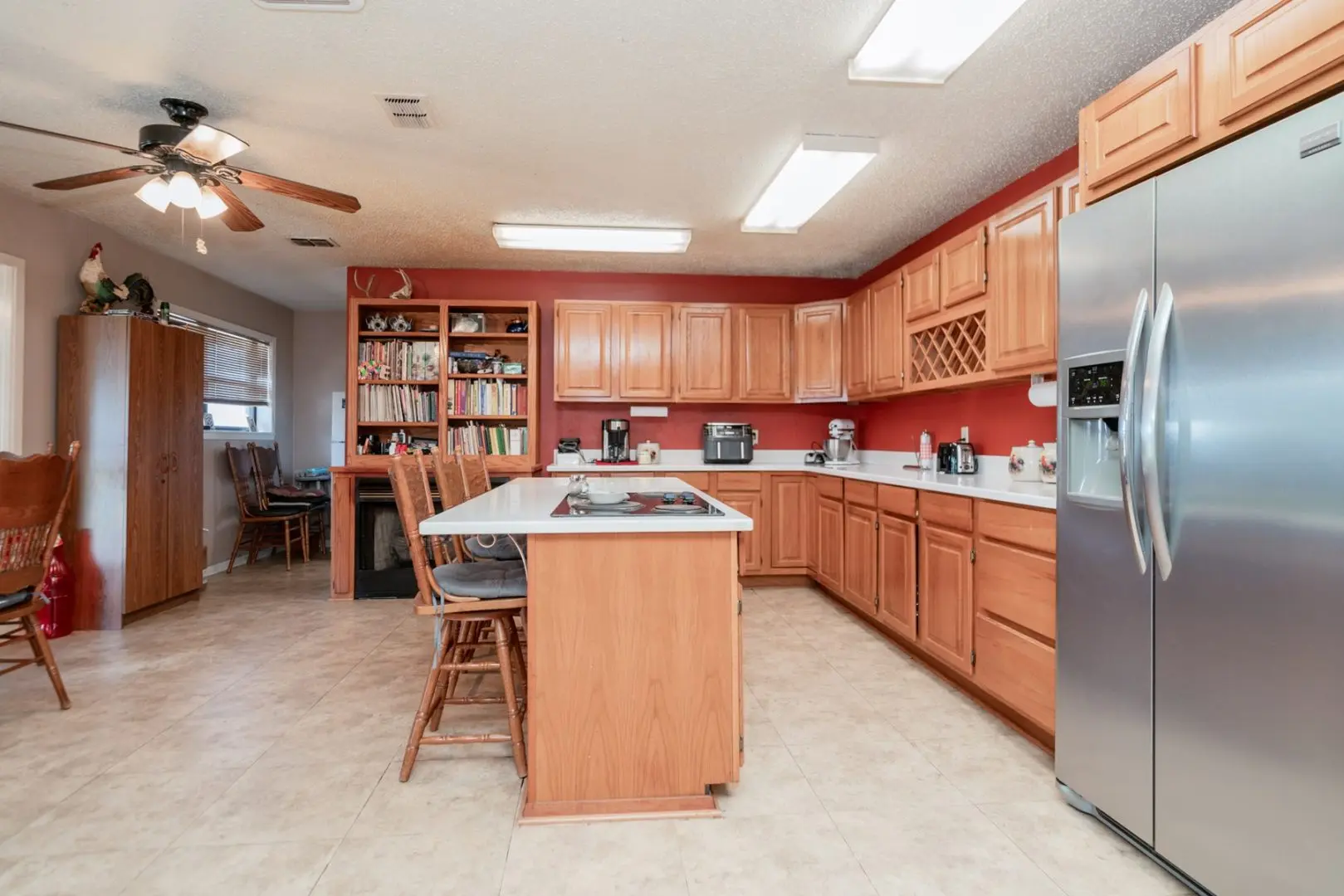 As you step inside from the inviting rear covered patio, you are greeted by a spacious country kitchen. Warm oak cabinets, complete with a built-in wine rack, seamlessly blend with a propane fireplace. To add to the country charm, oak bookshelves grace the space above. A bay window, overlooking the backyard, creates a cozy breakfast nook, allowing tranquil views of your East Texas ranch land to start your mornings. Food enthusiasts will delight in the expansive counter-height island, equipped with an electric cooktop. Furthermore, an additional electric range and a wall oven are seamlessly integrated into the cabinetry, making this kitchen a dream for preparing Southern feasts.