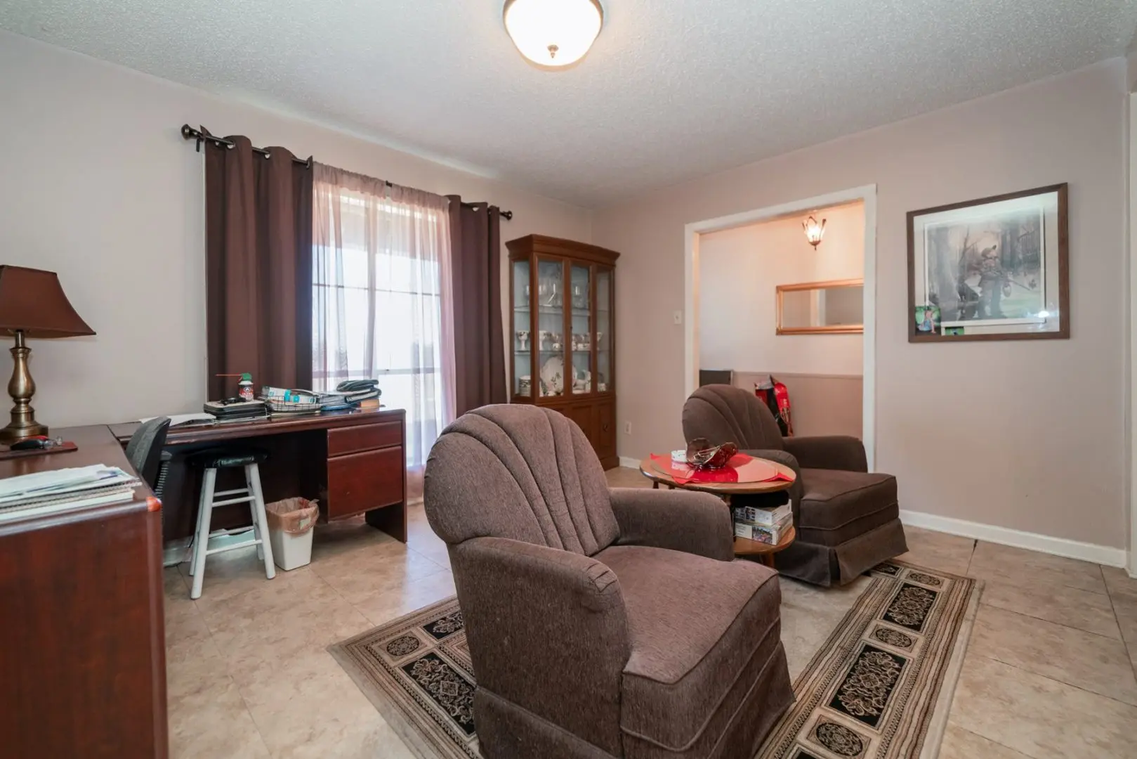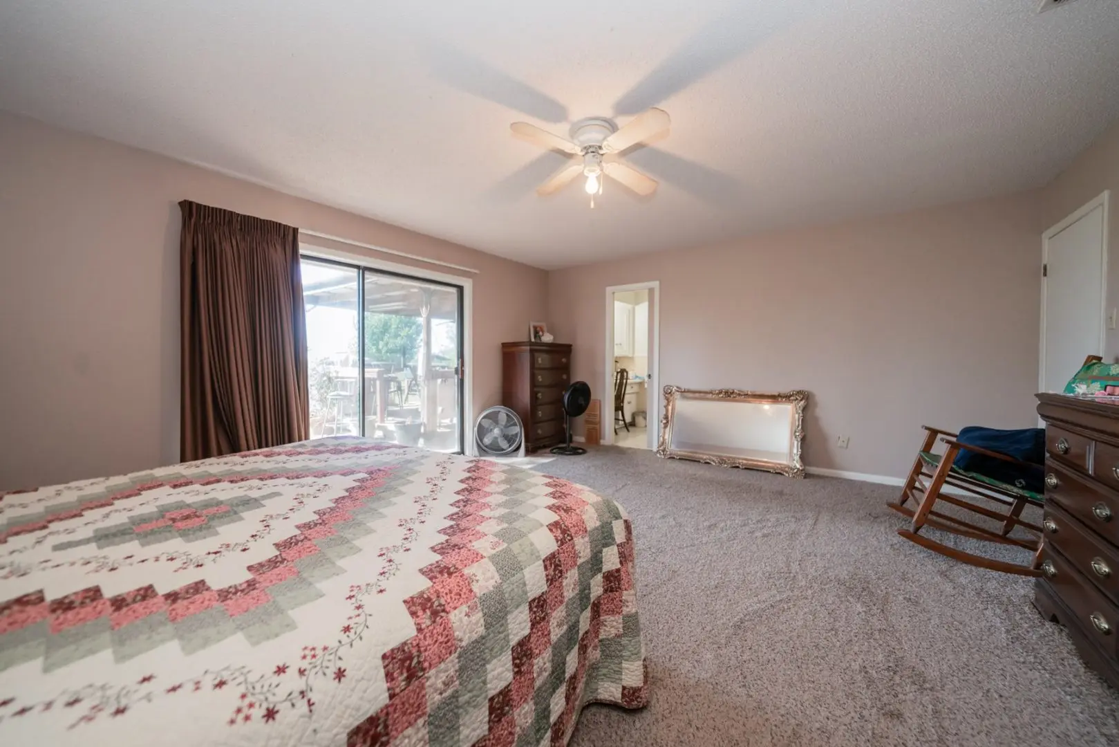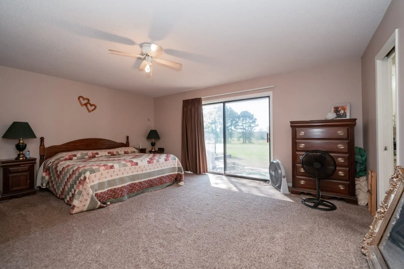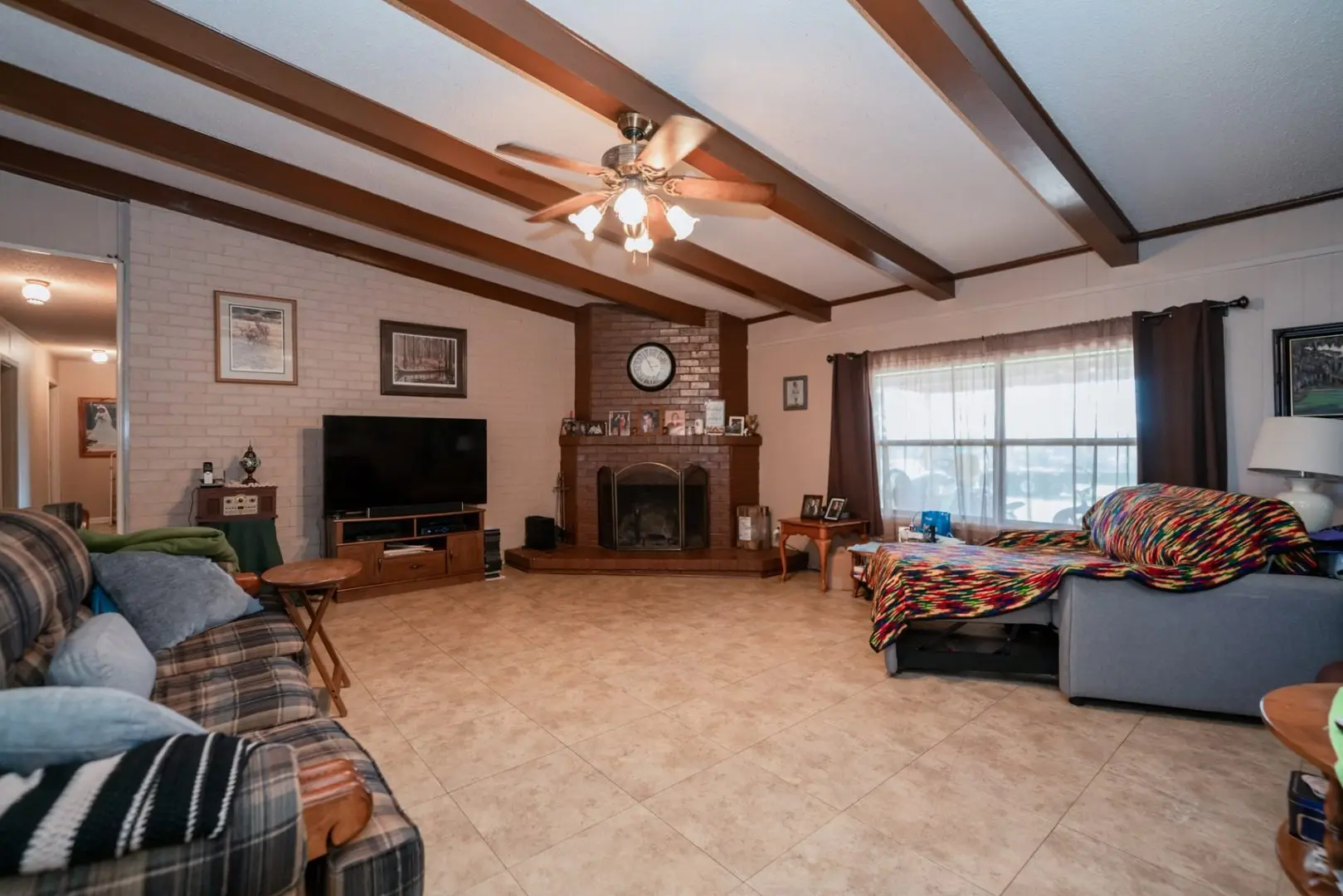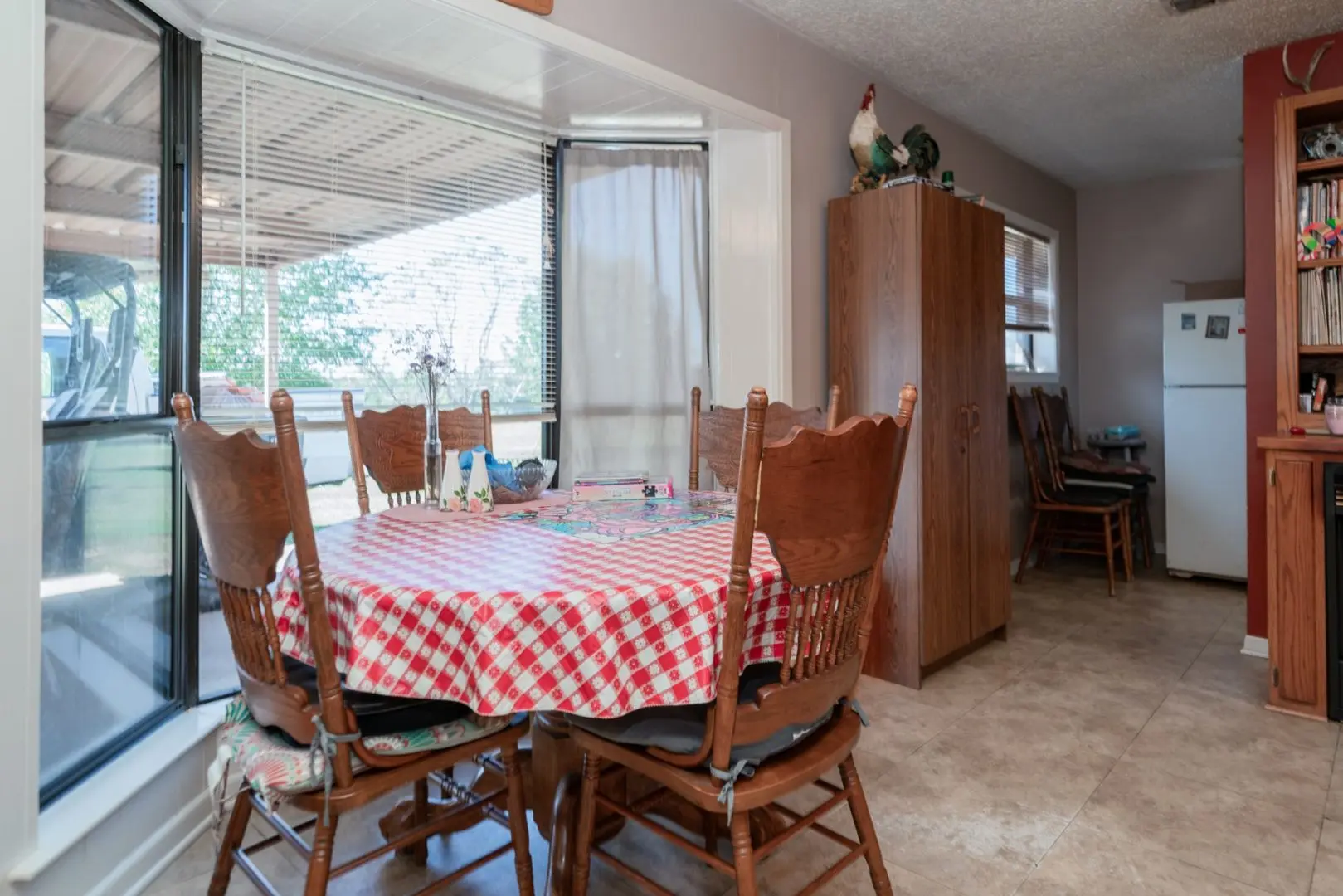 Transitioning seamlessly from the kitchen, a formal dining room is adorned with expansive windows framing a picturesque view of the front pasture. Adjacent, the living area boasts vinyl tile floors and a striking brick wall that perfectly complements the wood-burning fireplace. Sliding glass doors not only usher in serene views of the yard but also provide effortless access to the shaded patio, facilitating indoor-outdoor transitions.