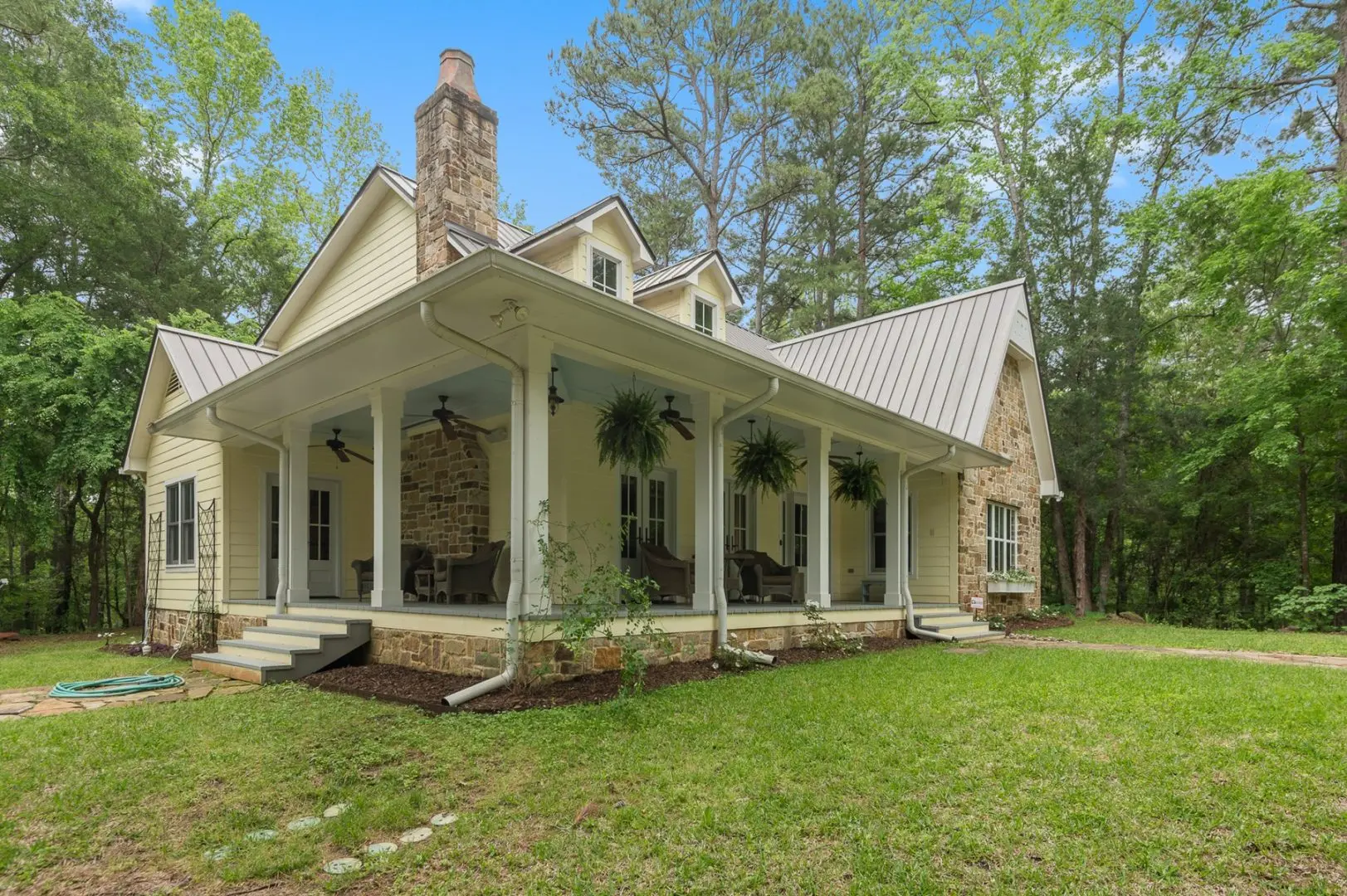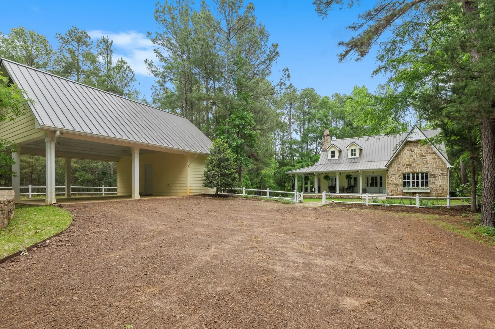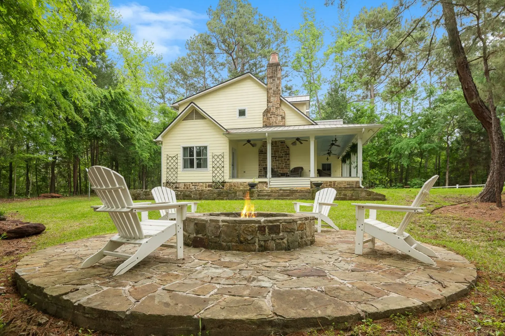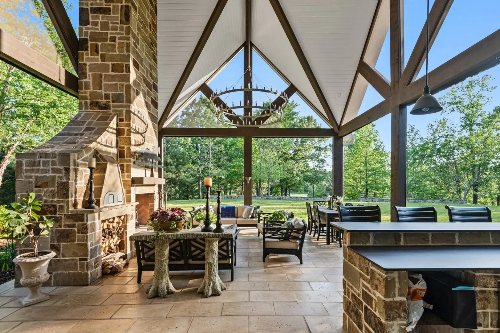 Complementing the main house is a 2,147 SF guest home featuring vaulted ceilings, a stone fireplace, a wraparound porch, and a screened-in porch, which creates an inviting atmosphere for guests or caretaker’s home. Outdoor entertainment and living areas include a back patio with a stone fireplace, a wood-burning pizza oven, and a landscaped garden. A custom chicken house adds a unique flair.