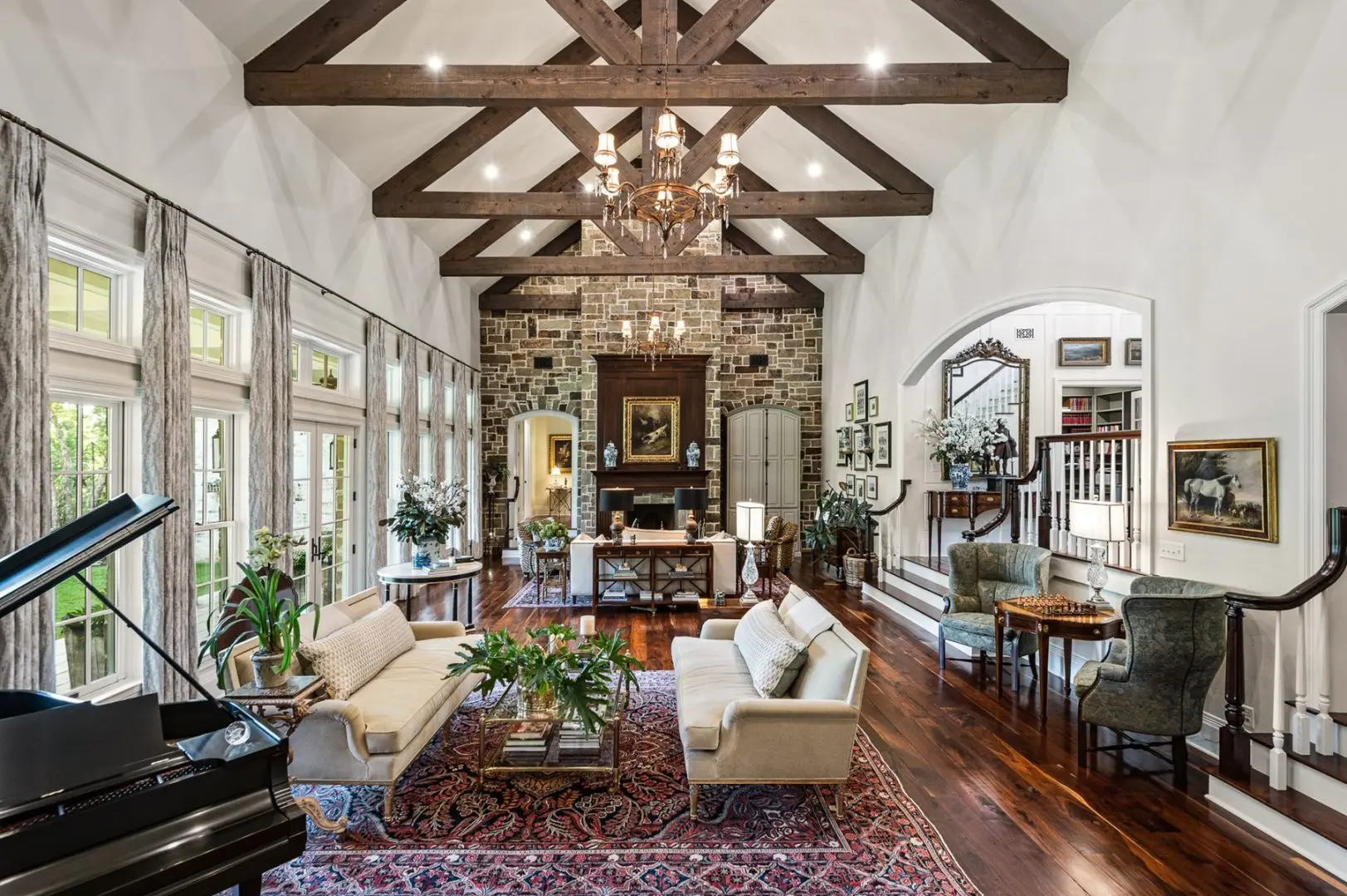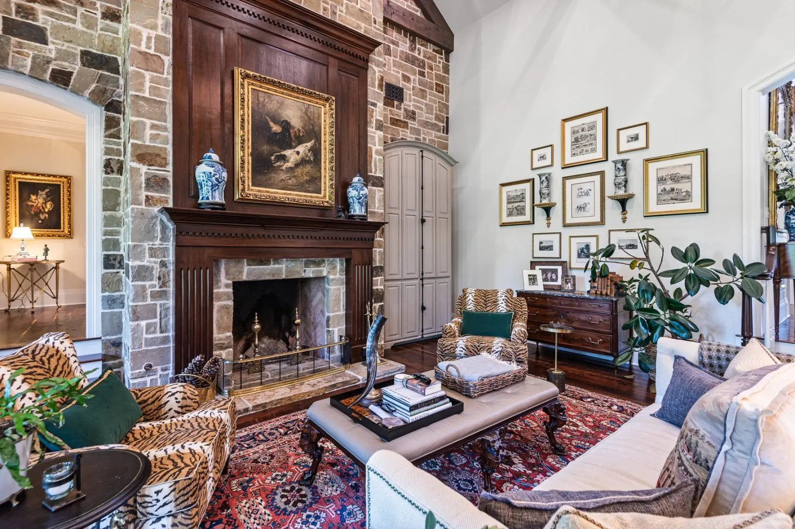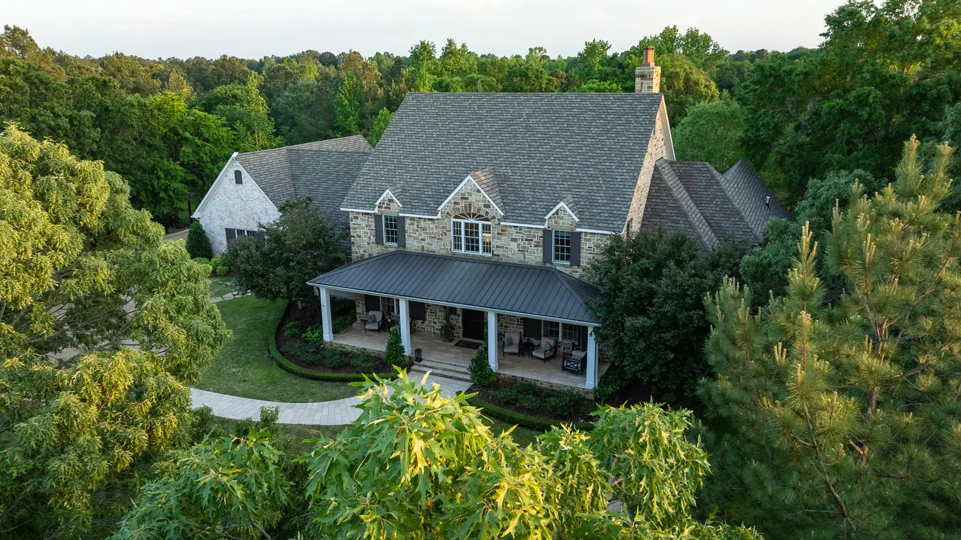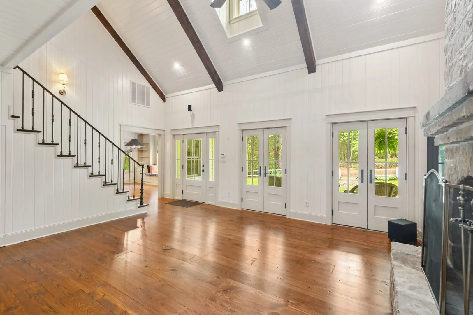 Complementing the main house is a 2,147 SF guest home featuring vaulted ceilings, a stone fireplace, a wraparound porch, and a screened-in porch, which creates an inviting atmosphere for guests or caretaker’s home. Outdoor entertainment and living areas include a back patio with a stone fireplace, a wood-burning pizza oven, and a landscaped garden. A custom chicken house adds a unique flair.