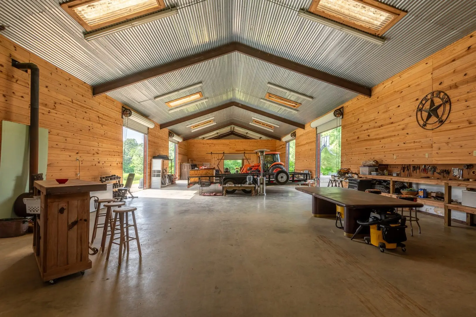 The property’s functional elegance extends to the barn, which previously hosted family events and weddings. It has horse stalls, a tack room, and office space and extends to functional areas like the workshop and garages. The ranch estate is currently on the grid, but off-grid infrastructure is in place. The land is under rotational grazing to enhance soil and vegetation with a stock tank and a sizable fishing pond, enriching recreational options.