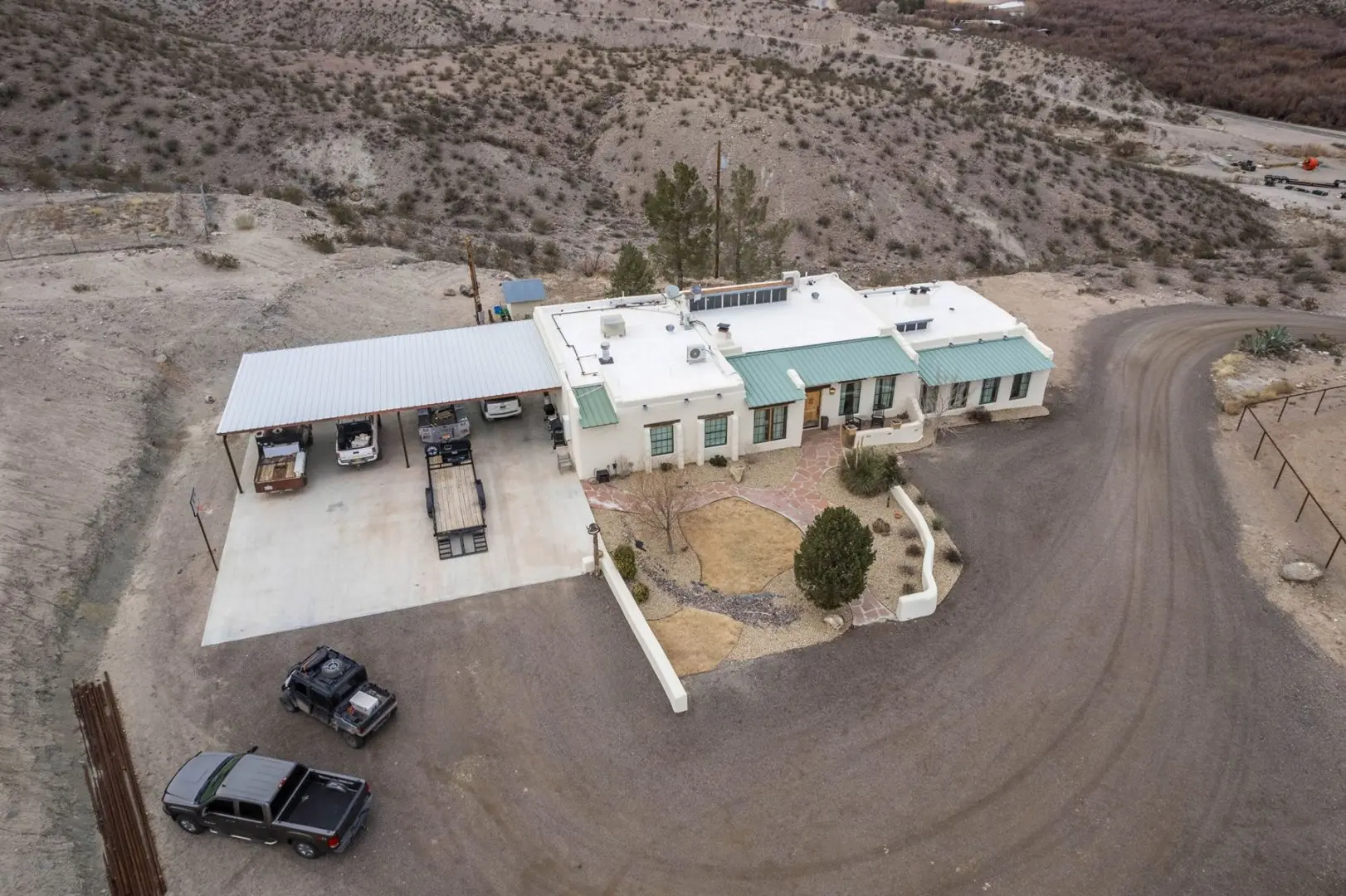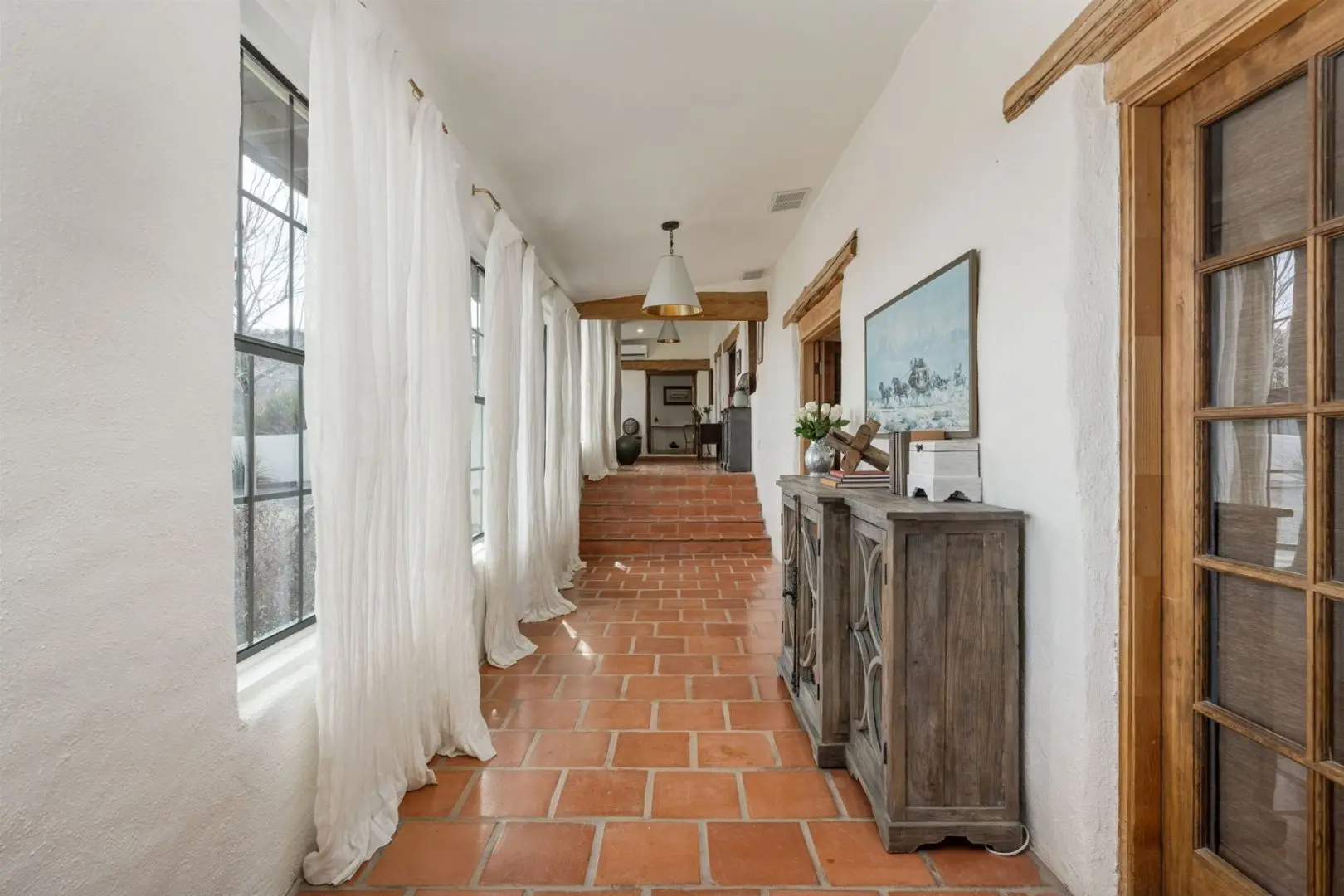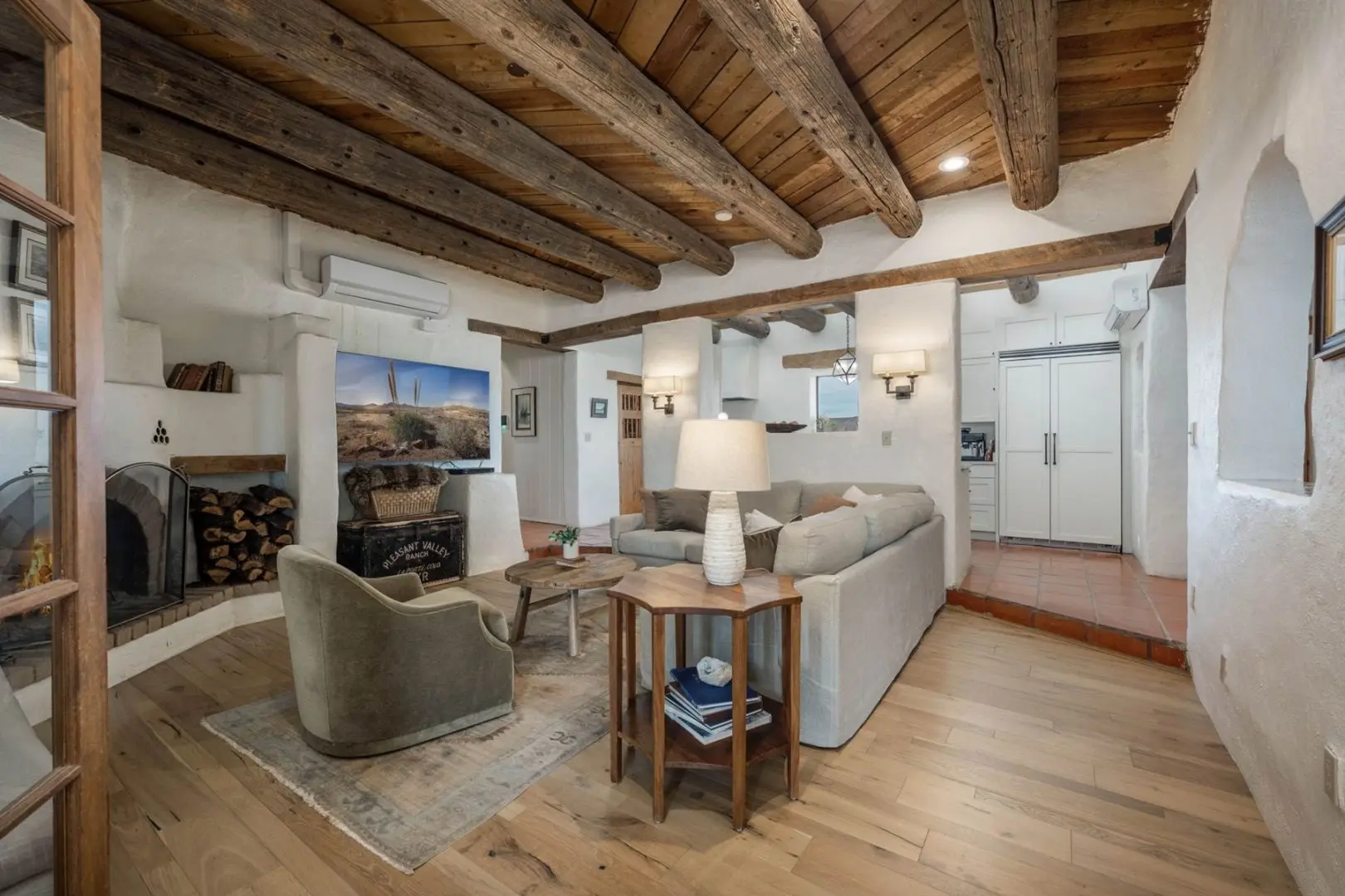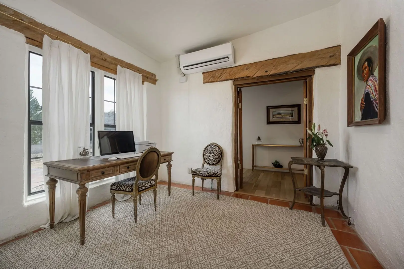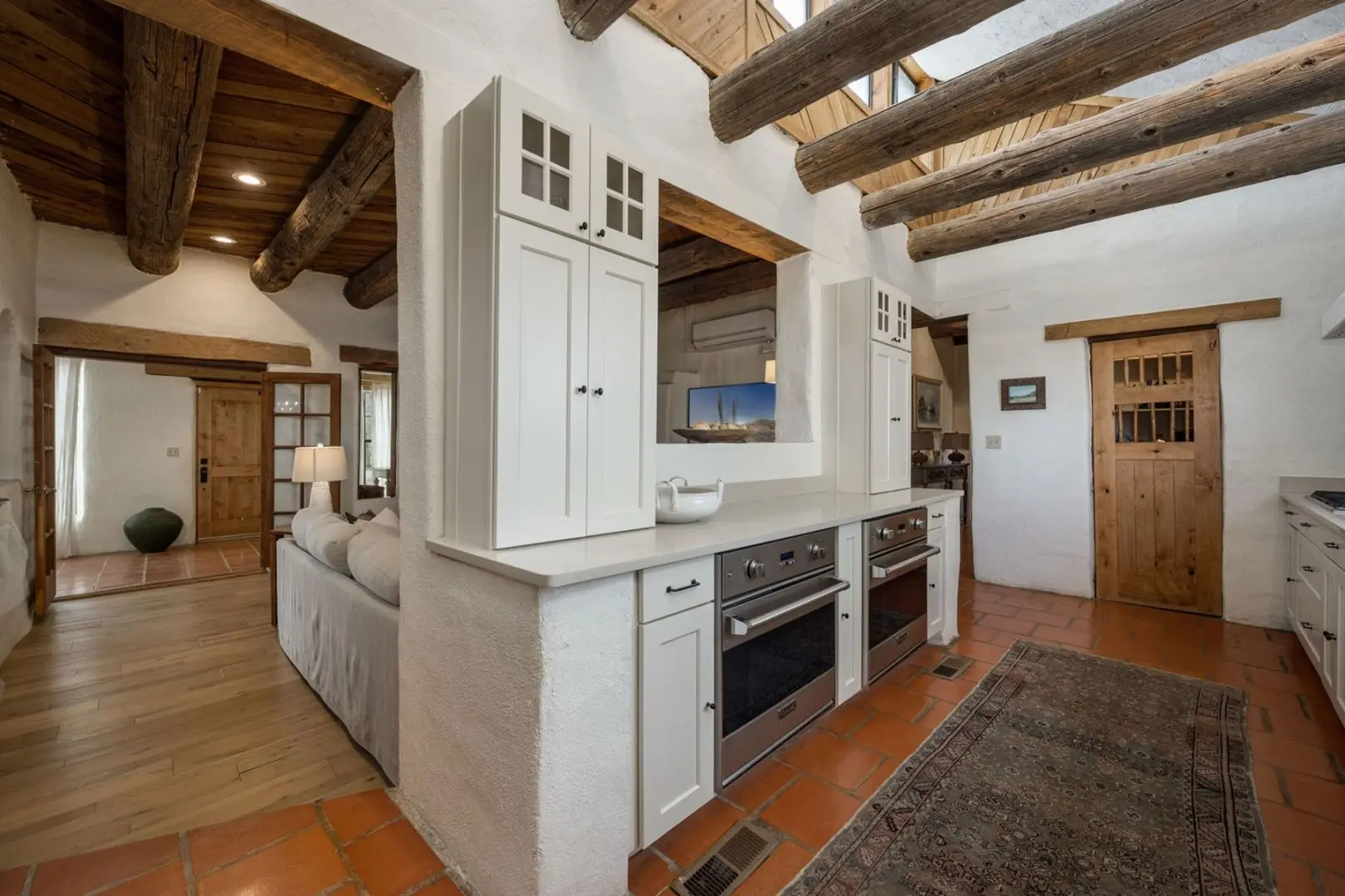 The headquarters features a beautifully remodeled adobe home, a barn with an attached shop, horse stalls, and a riding arena. The spacious 3,204-square-foot home includes three bedrooms, two and a half bathrooms, an office, and four charming Kiva-style fireplaces. The upgraded kitchen is equipped with high-end Viking appliances, a coffee bar, and stunning quartz countertops.