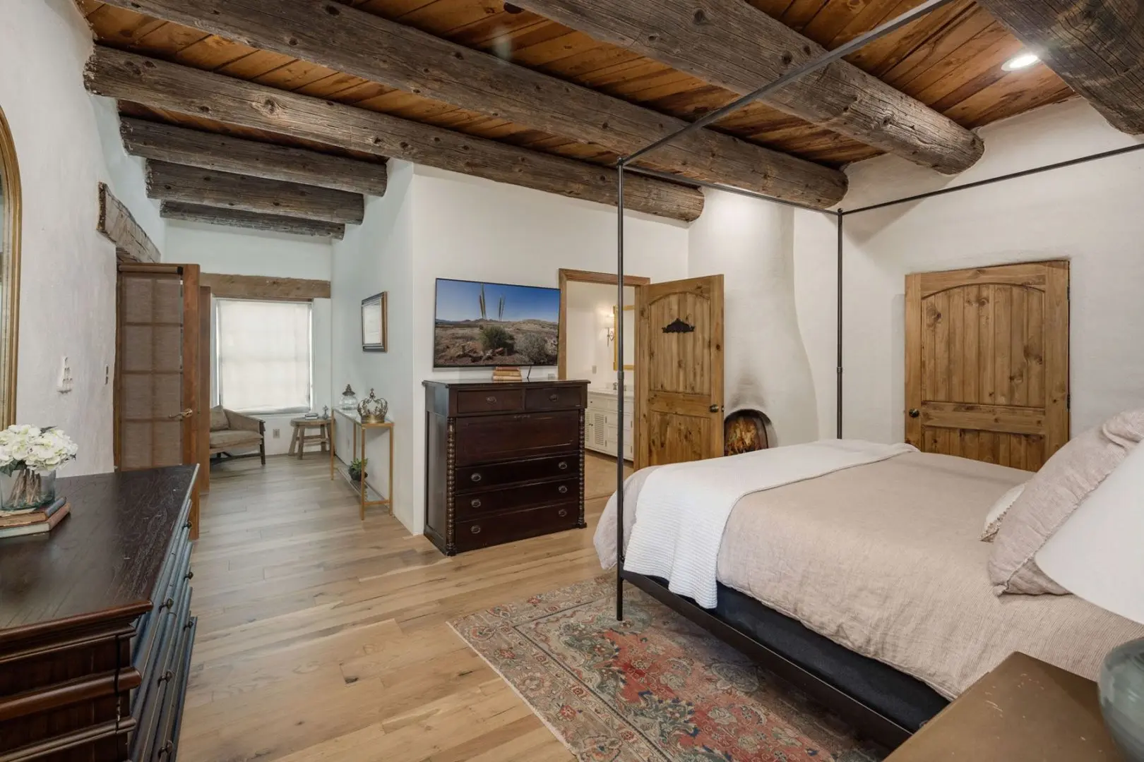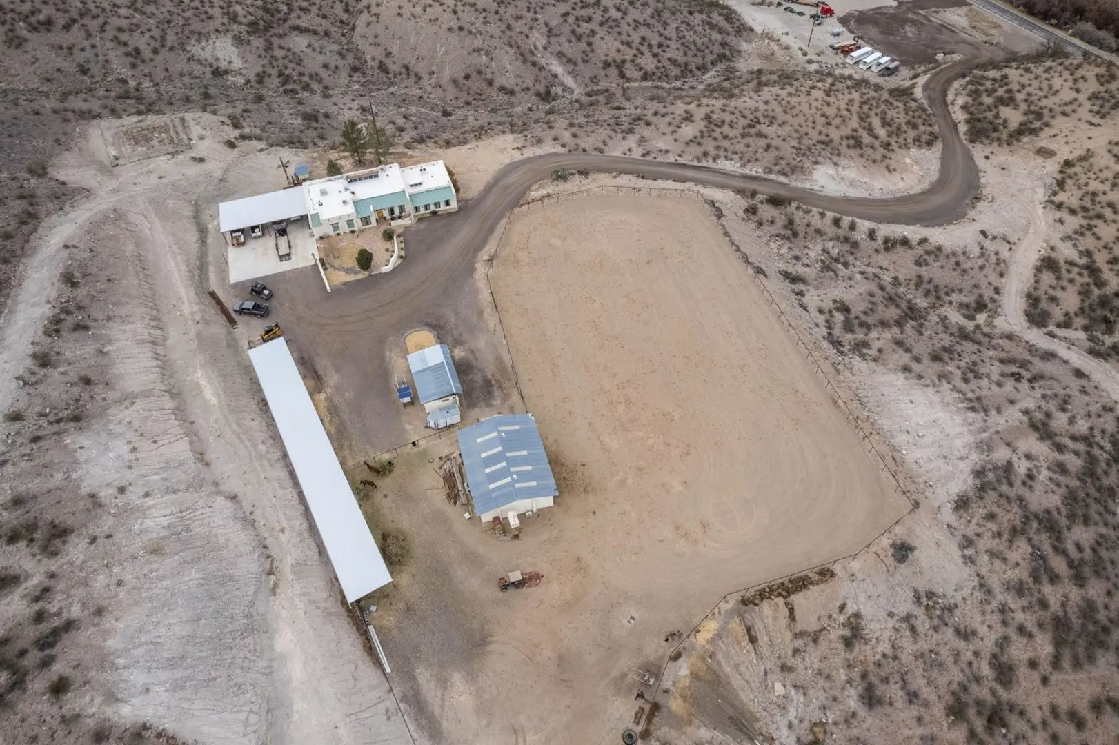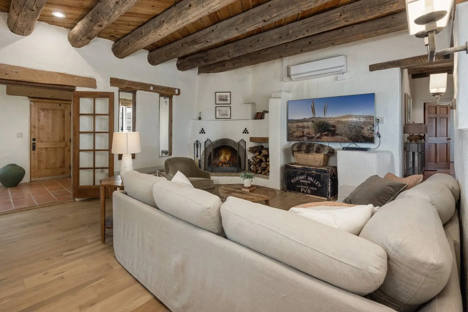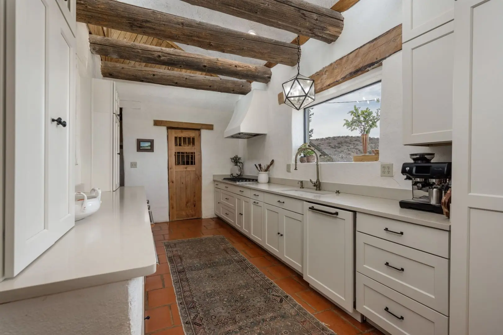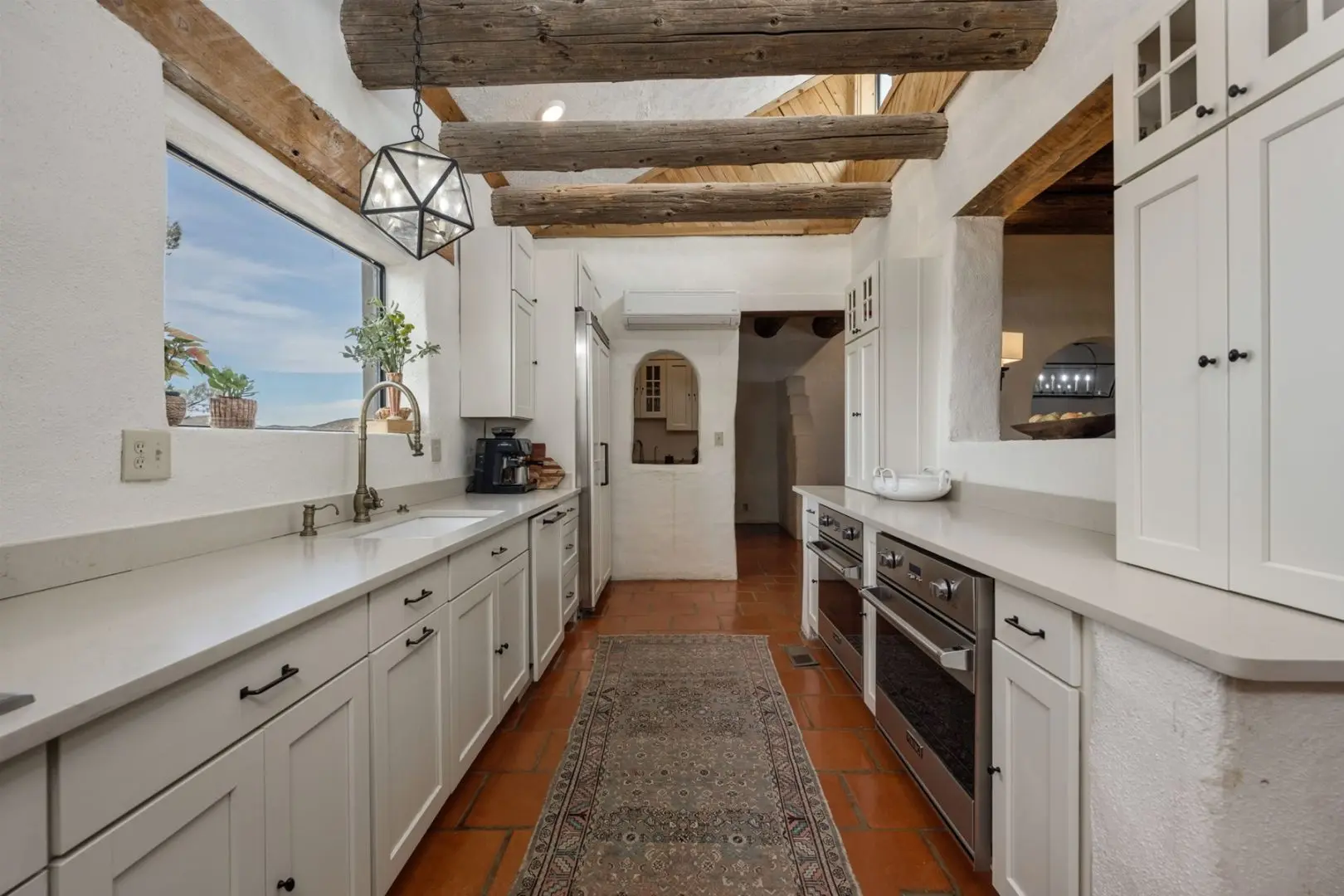 The headquarters features a beautifully remodeled adobe home, a barn with an attached shop, horse stalls, and a riding arena. The spacious 3,204-square-foot home includes three bedrooms, two and a half bathrooms, an office, and four charming Kiva-style fireplaces. The upgraded kitchen is equipped with high-end Viking appliances, a coffee bar, and stunning quartz countertops.