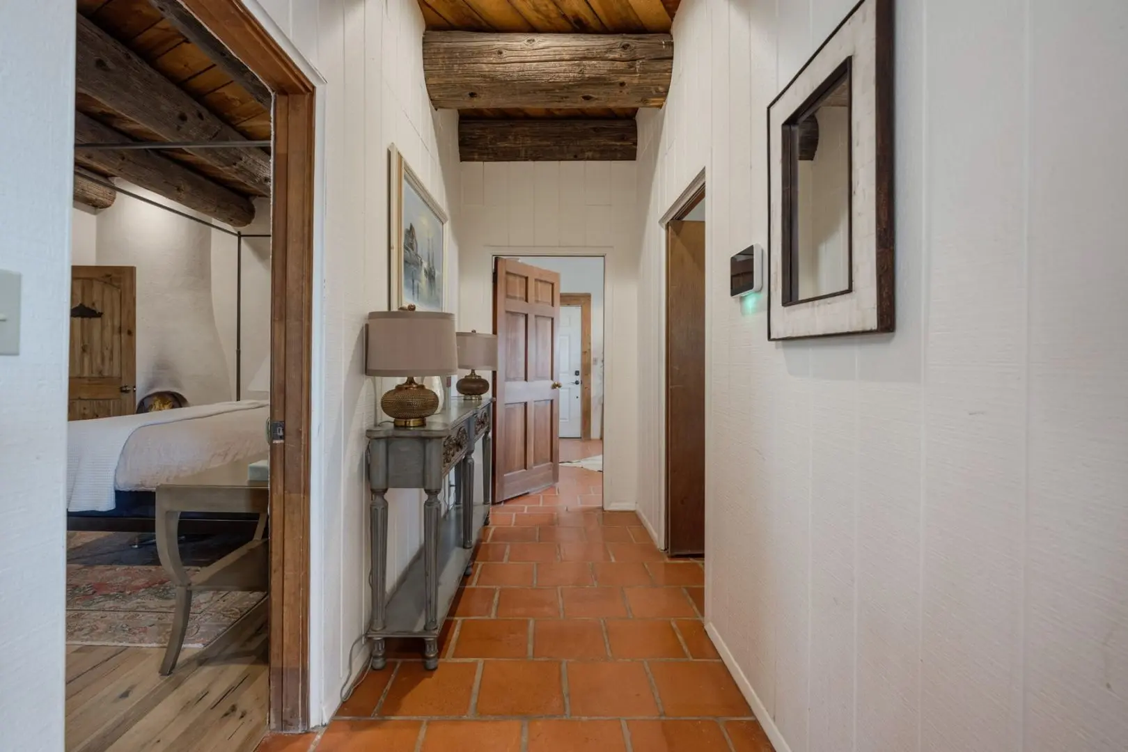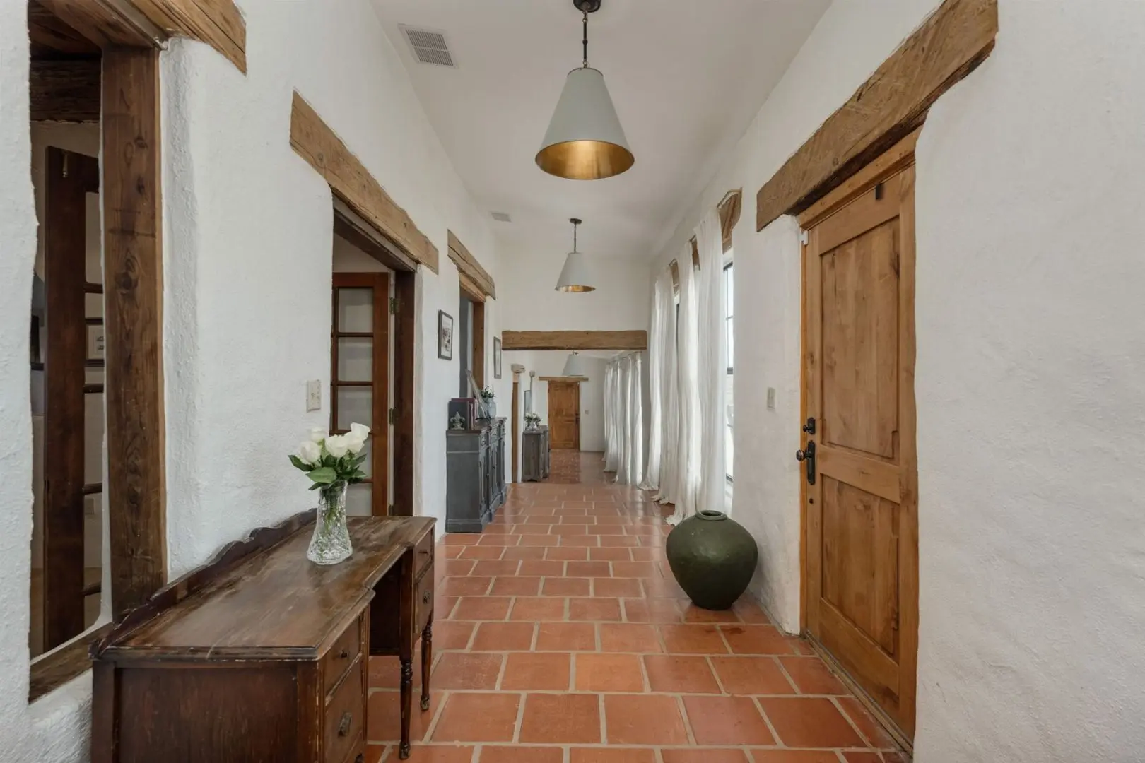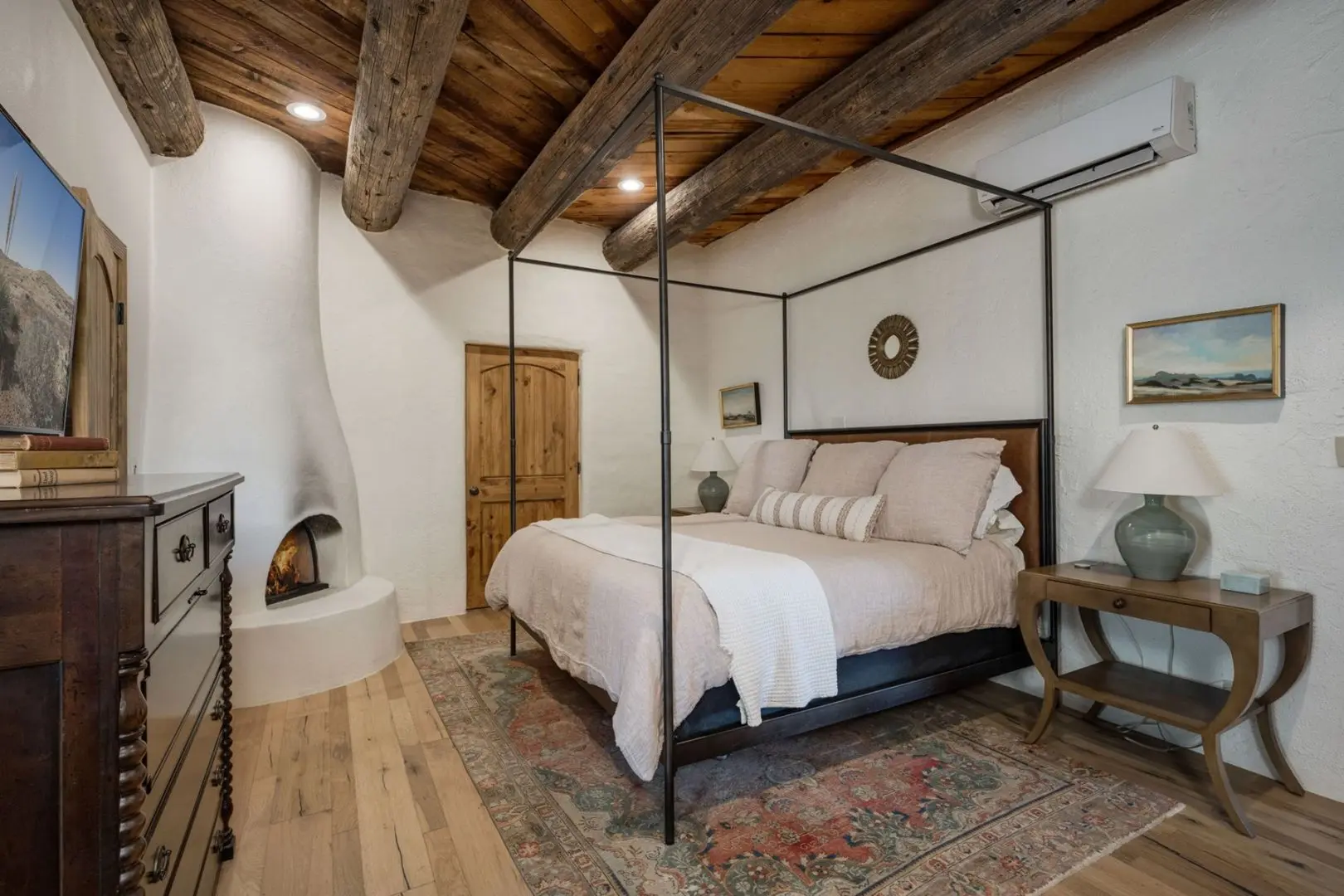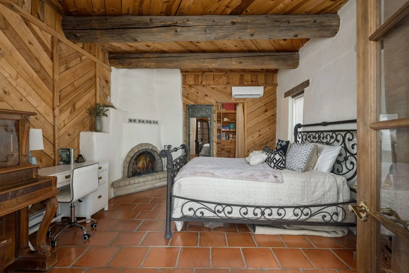 The headquarters features a beautifully remodeled adobe home, a barn with an attached shop, horse stalls, and a riding arena. The spacious 3,204-square-foot home includes three bedrooms, two and a half bathrooms, an office, and four charming Kiva-style fireplaces. The upgraded kitchen is equipped with high-end Viking appliances, a coffee bar, and stunning quartz countertops.