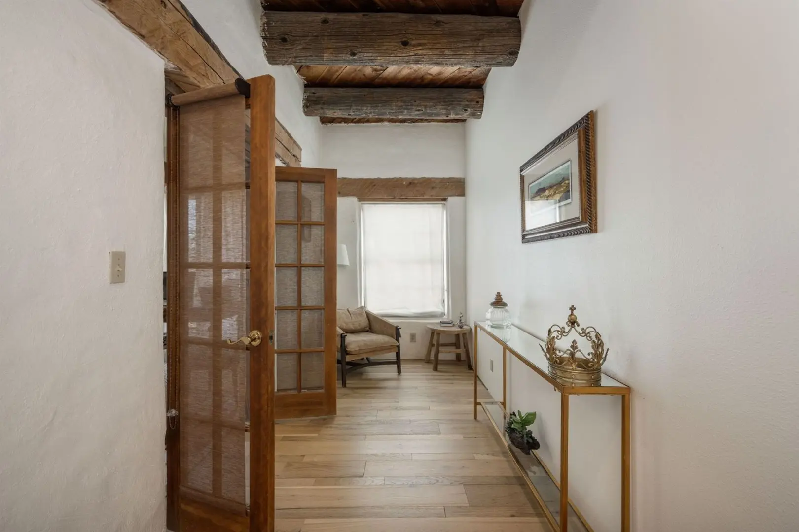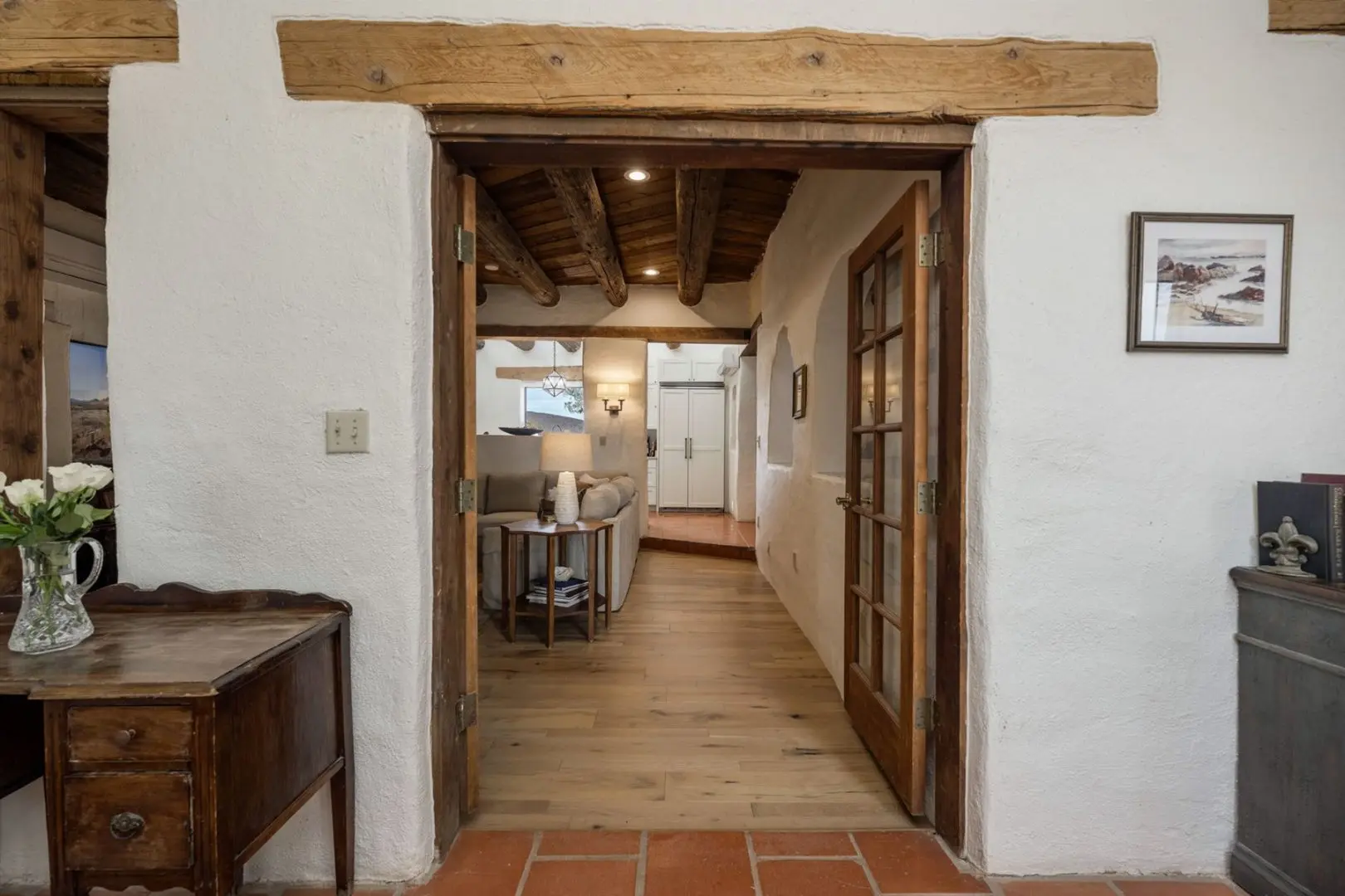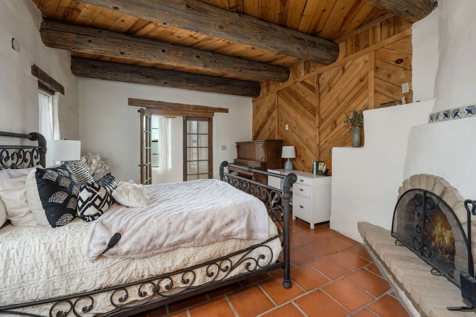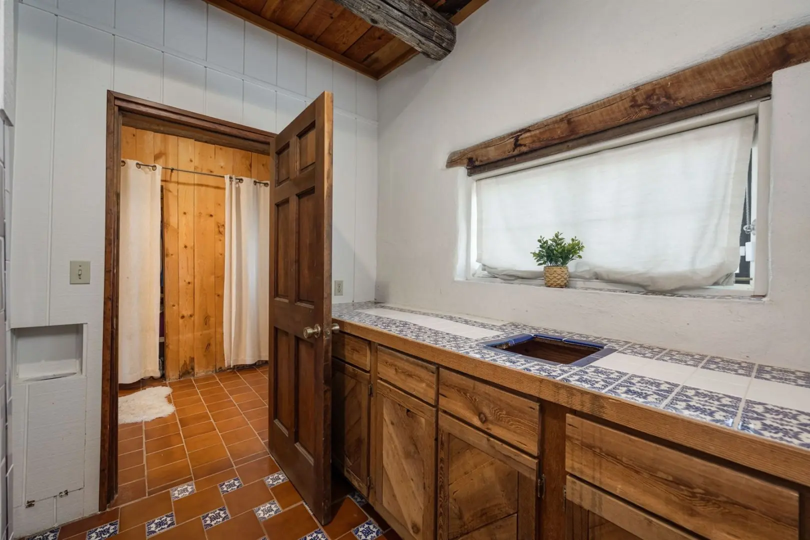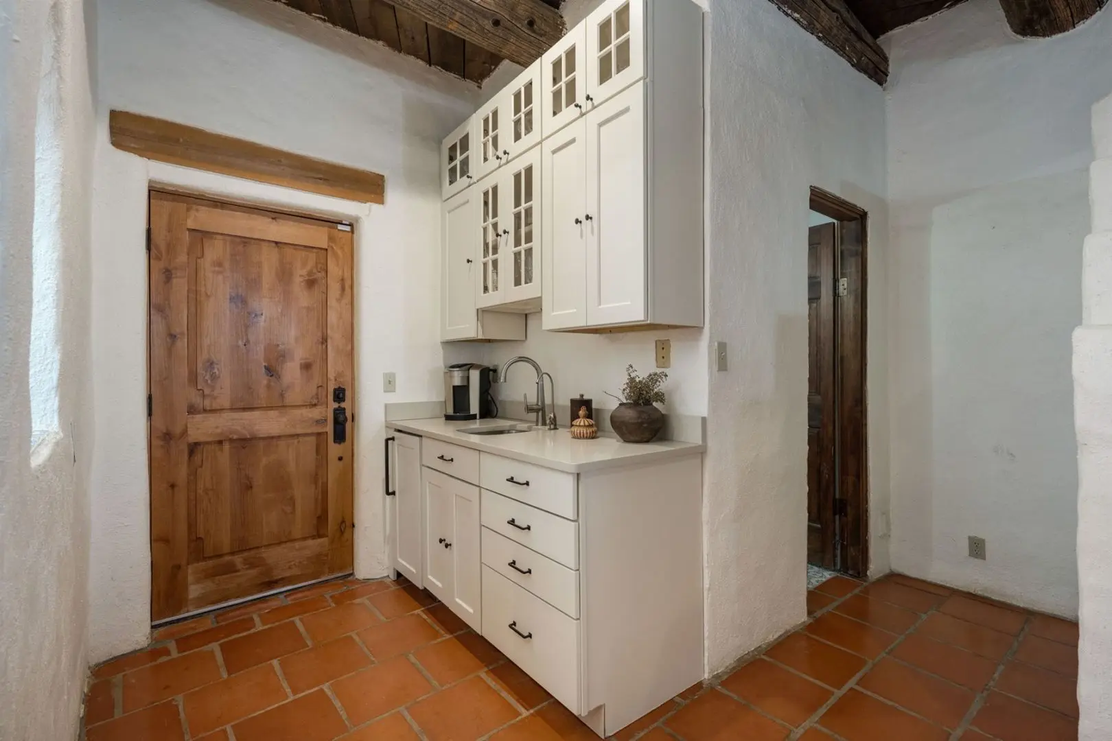 The headquarters features a beautifully remodeled adobe home, a barn with an attached shop, horse stalls, and a riding arena. The spacious 3,204-square-foot home includes three bedrooms, two and a half bathrooms, an office, and four charming Kiva-style fireplaces. The upgraded kitchen is equipped with high-end Viking appliances, a coffee bar, and stunning quartz countertops.