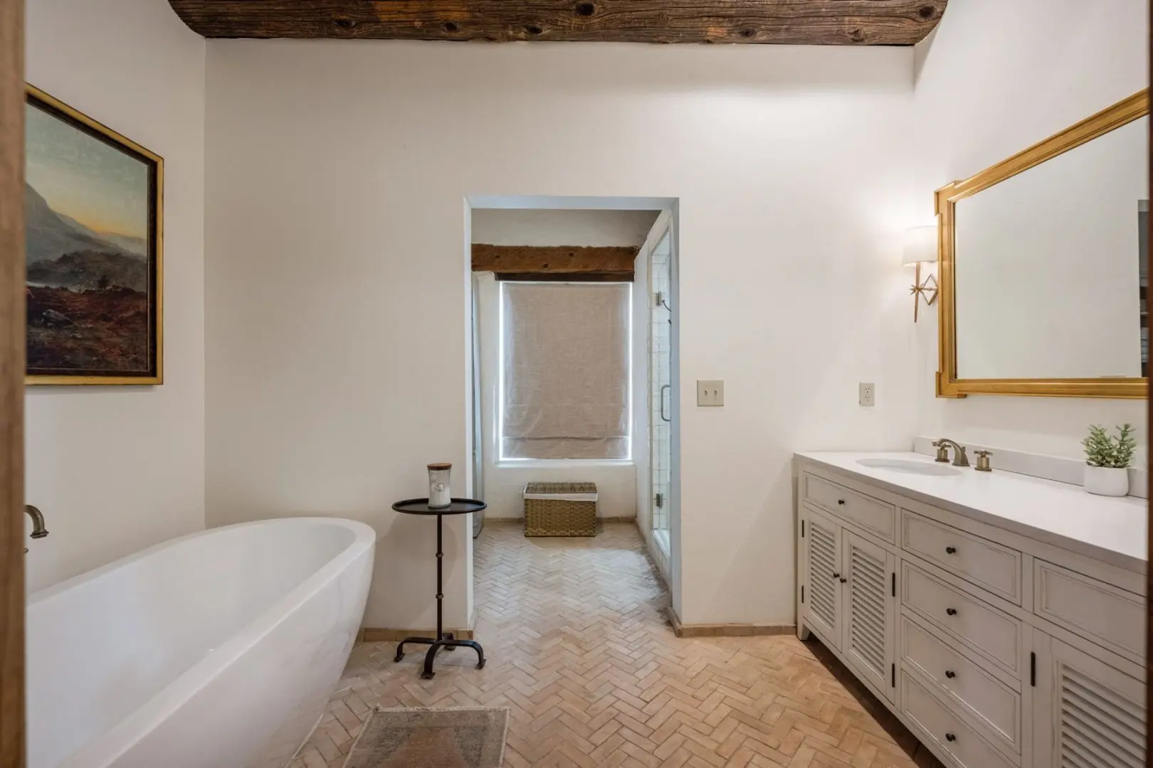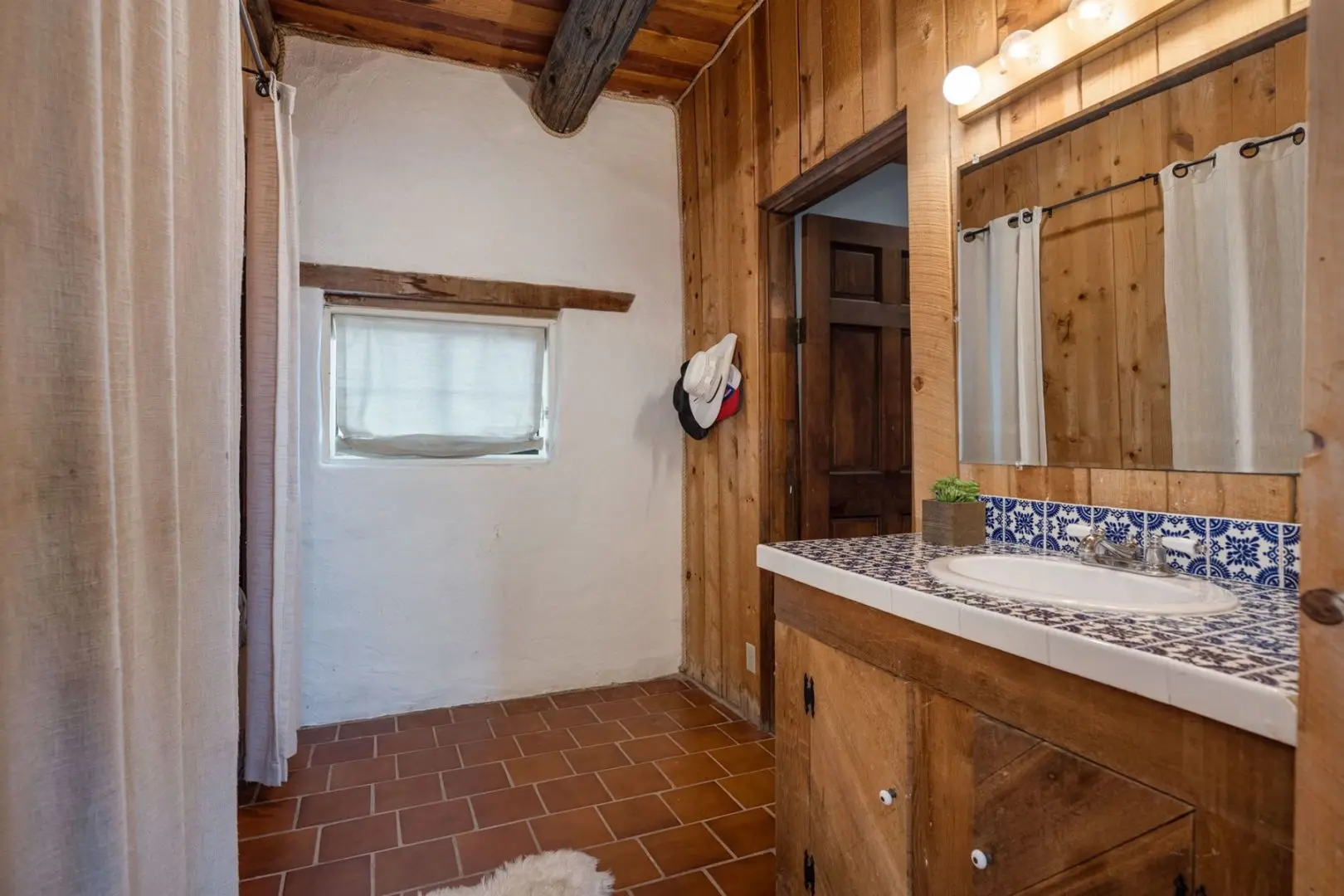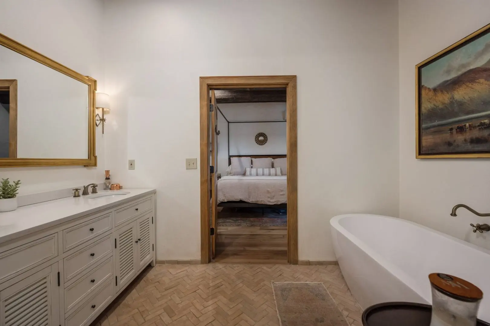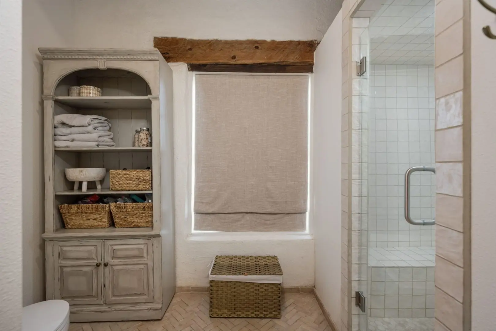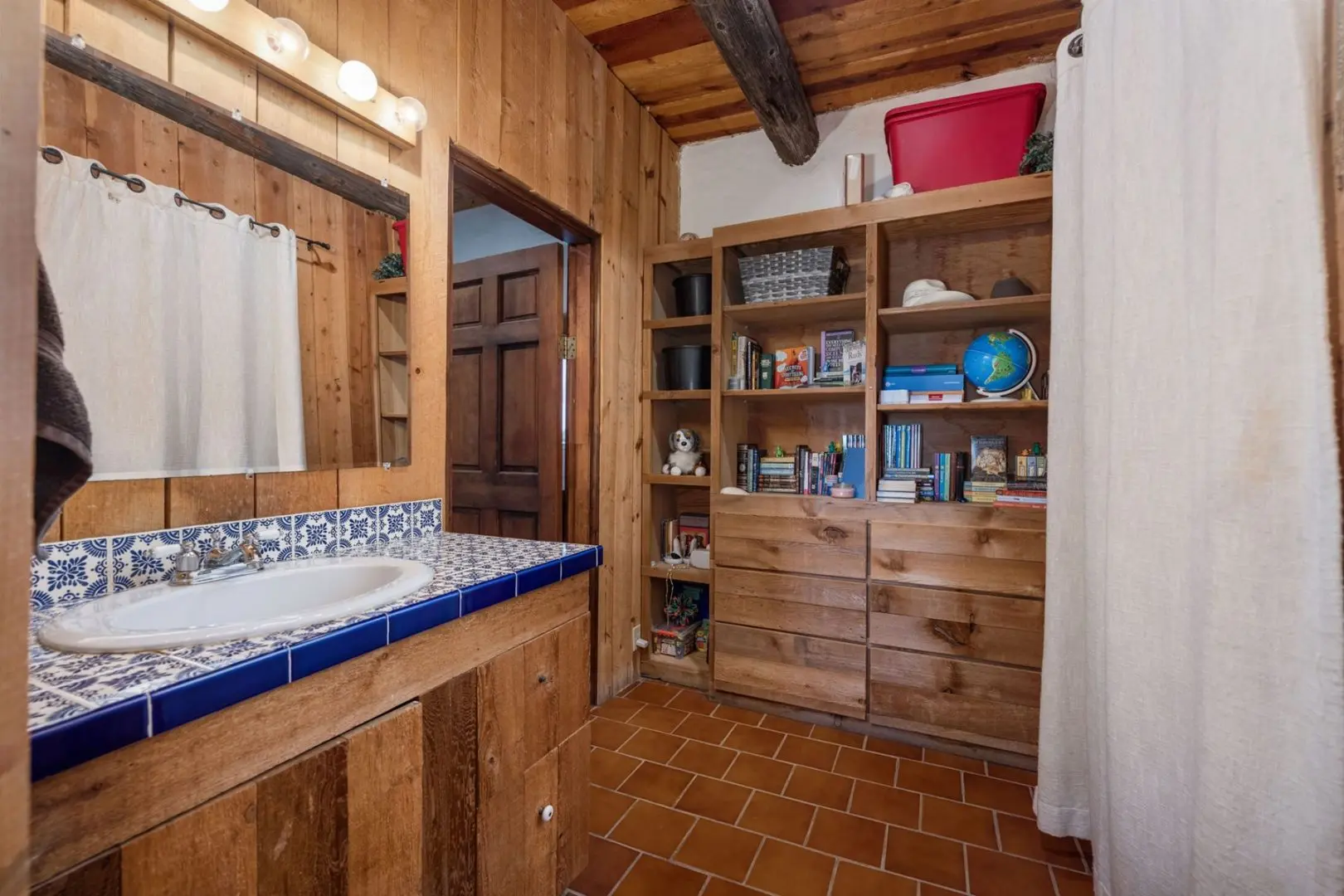 The headquarters features a beautifully remodeled adobe home, a barn with an attached shop, horse stalls, and a riding arena. The spacious 3,204-square-foot home includes three bedrooms, two and a half bathrooms, an office, and four charming Kiva-style fireplaces. The upgraded kitchen is equipped with high-end Viking appliances, a coffee bar, and stunning quartz countertops.