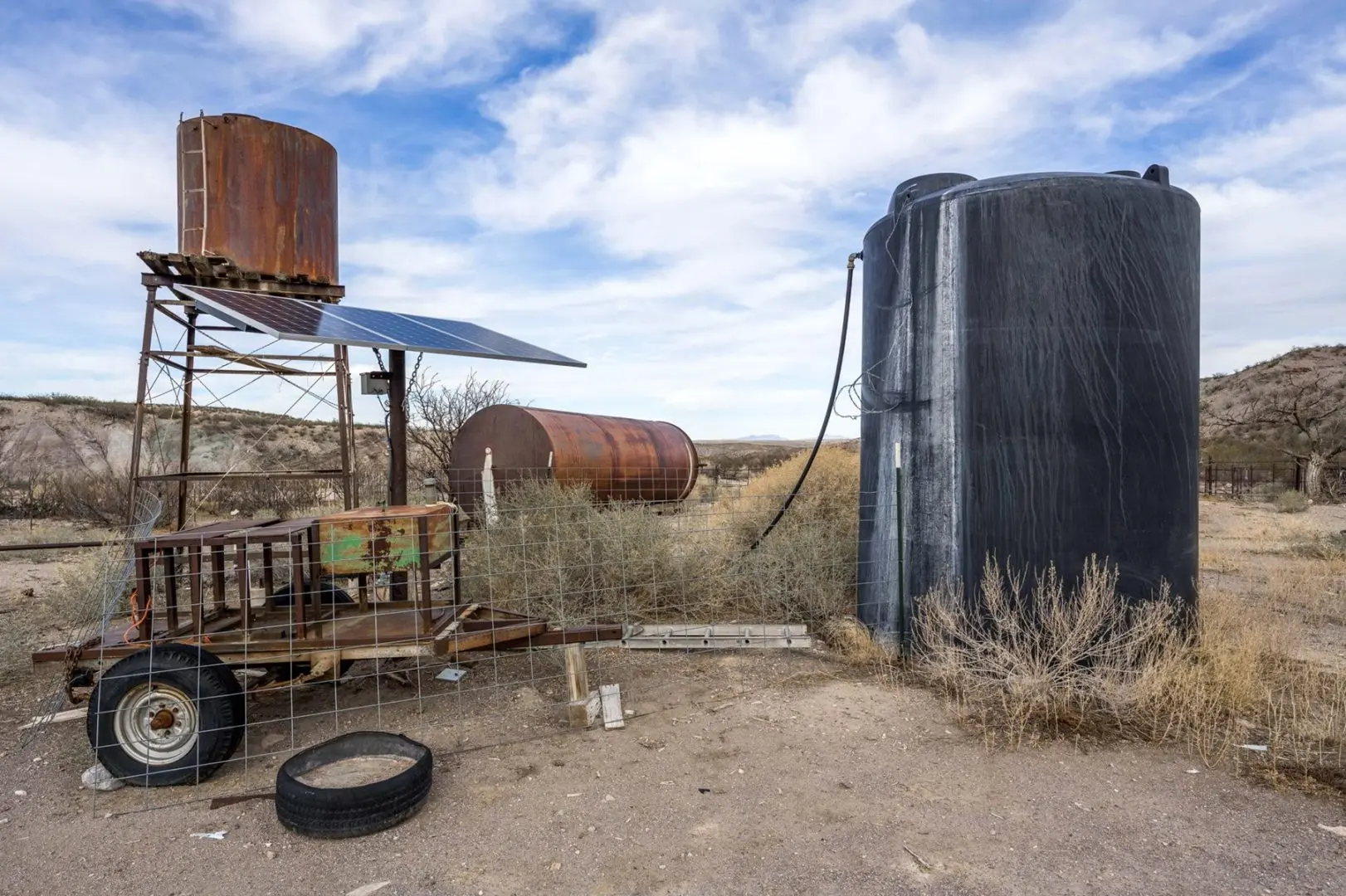 Encompassing approximately 16,648 acres, the ranch consists of 238± deeded acres, 14,931± BLM acres, and 1,479± State lease acres. Water resources include two wells producing six gallons per minute, supplying nine miles of pipeline. Additionally, there are five earthen tanks that fill with rainwater, 36,000 gallons of water storage, seven drinkers, and two sets of pens.