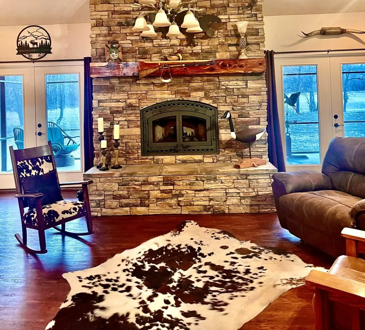 - Stay cozy by the stack stone fireplace with a wood insert and plug-in convenience.