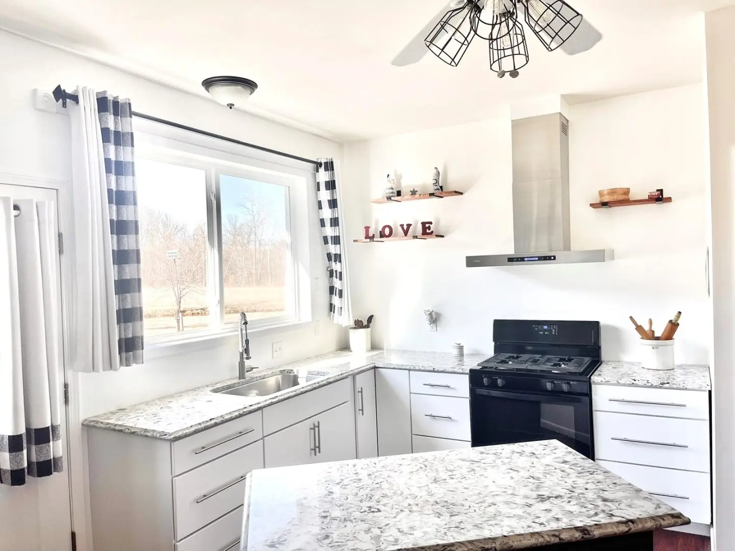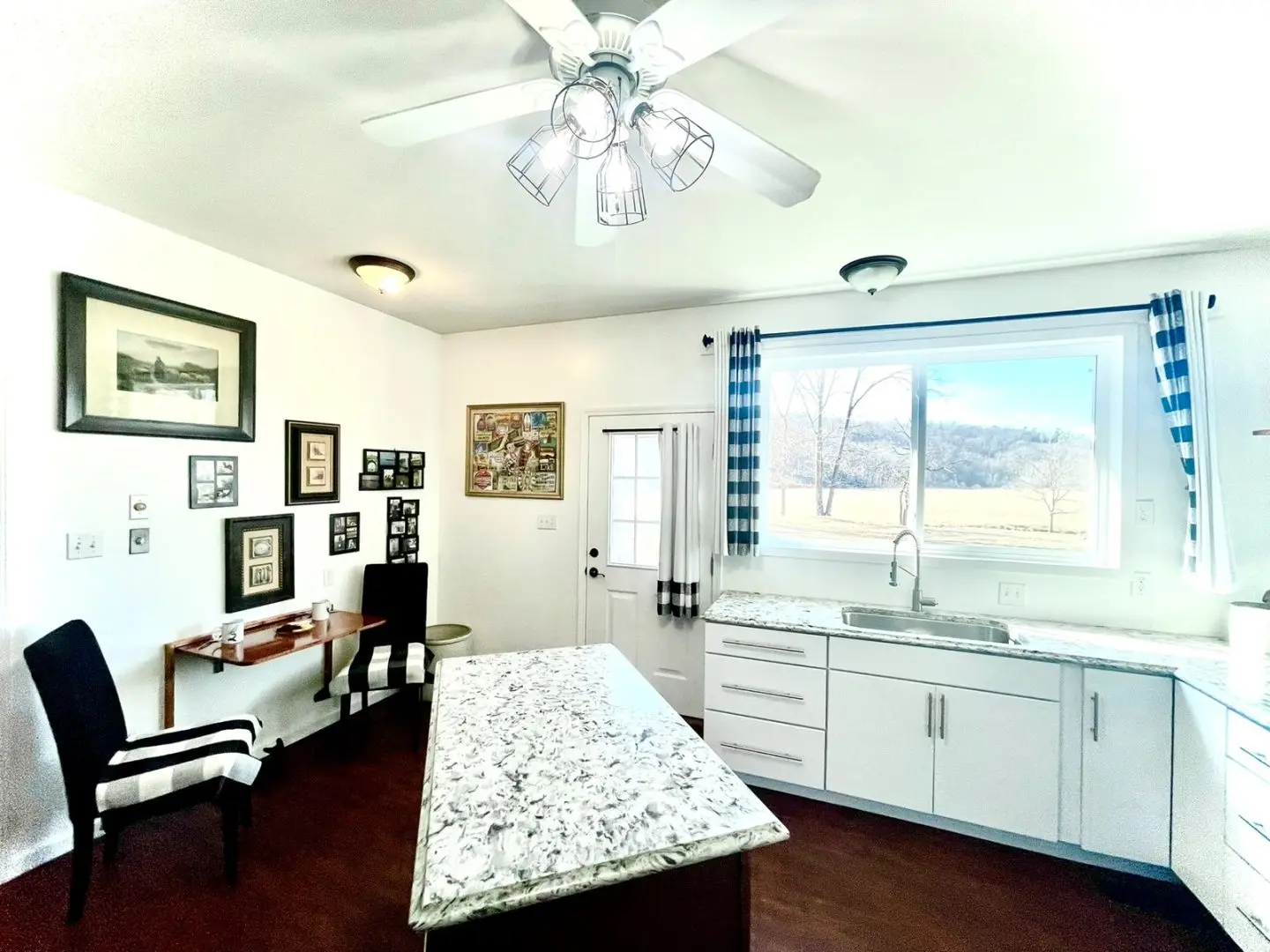 - Working kitchen with maple and white cabinets, island, whole house fan, washer-dryer hookup, and pantry with laundry chute.