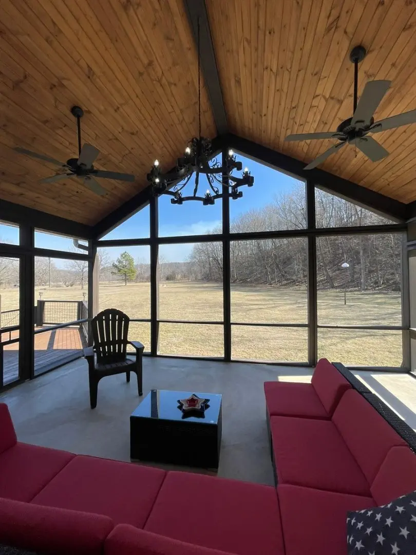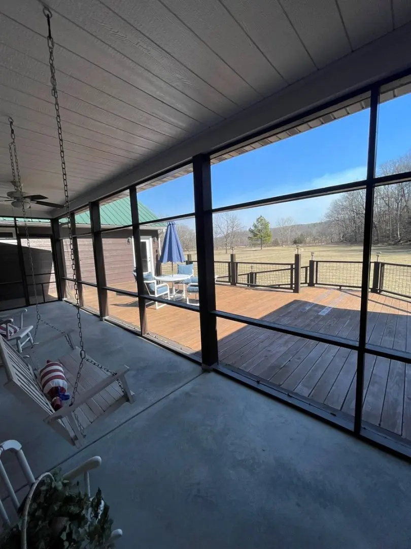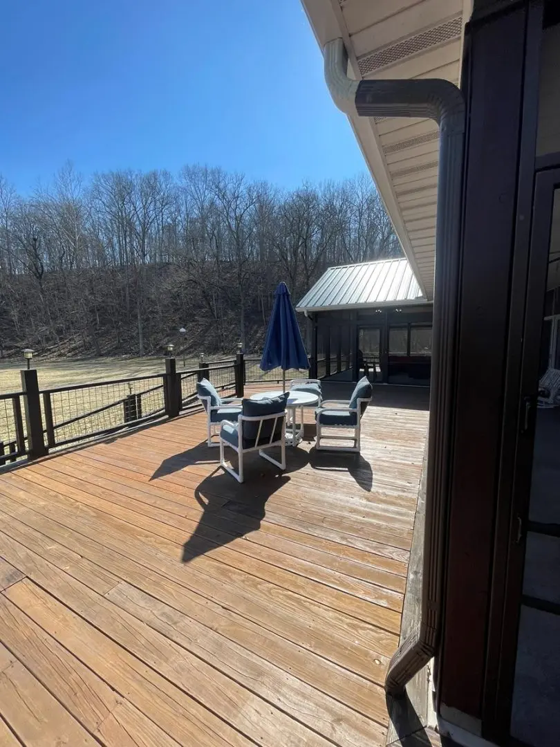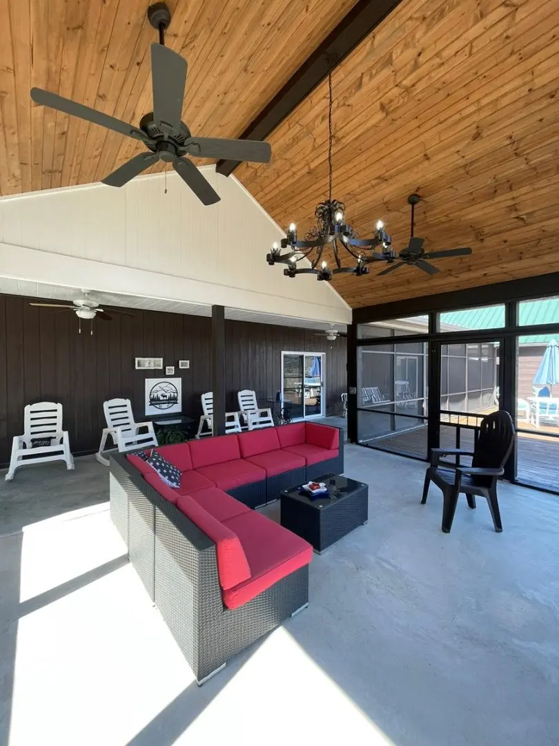 - Relax in the screened front porch with a vaulted wood ceiling, adjacent to a large entertaining deck perfect for gatherings.
