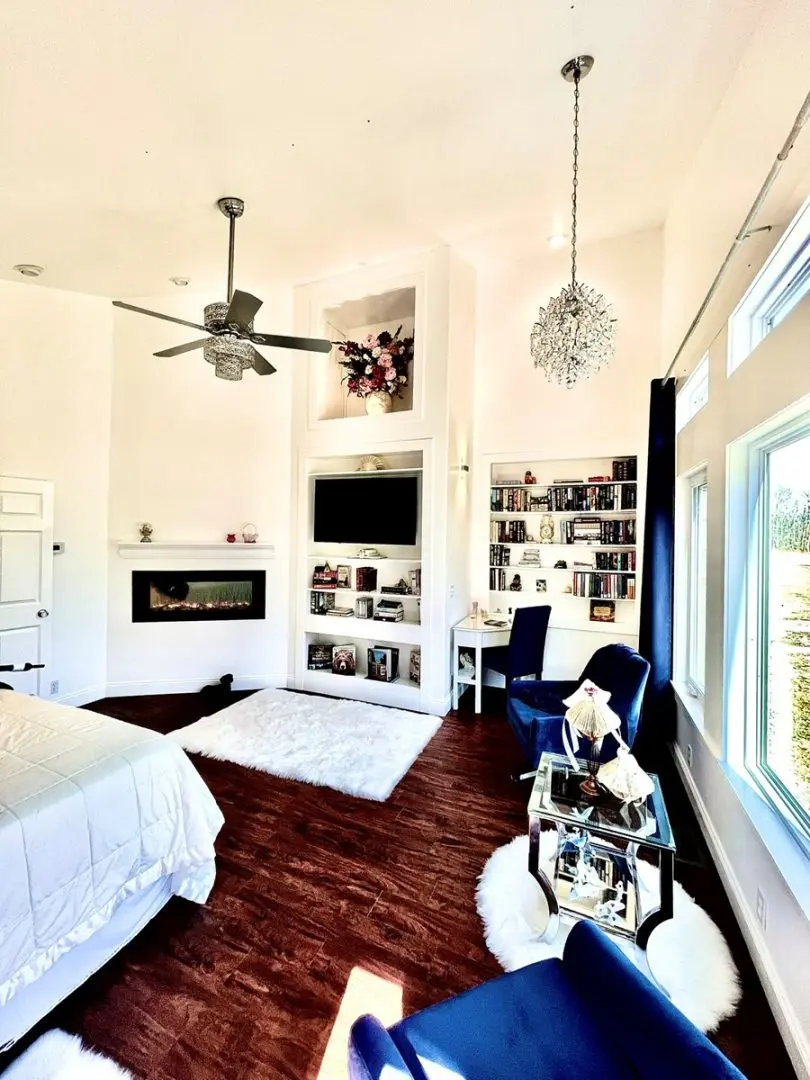 - Four bedrooms and four baths, including a luxurious master suite with TV, built-ins, walk-in closet, and separate his and hers bathrooms.