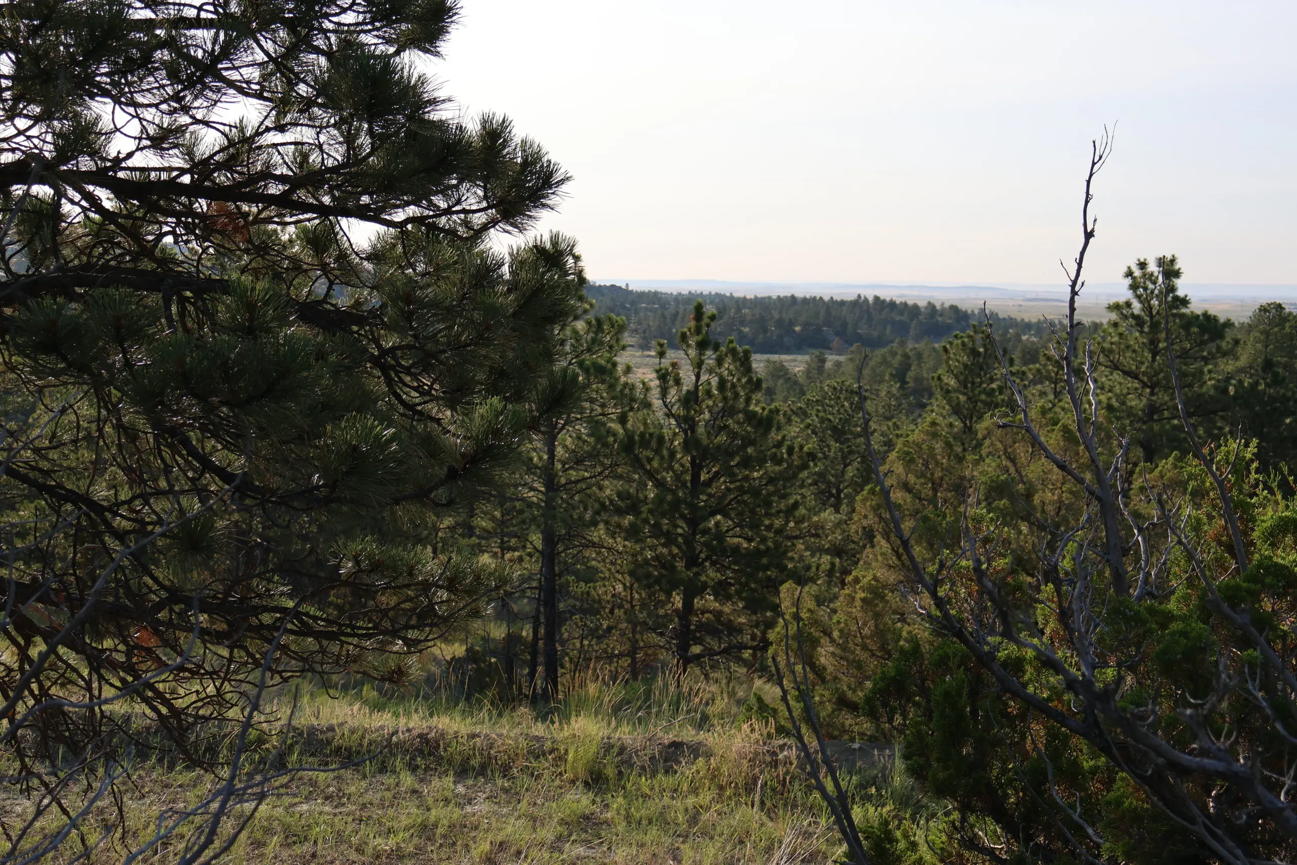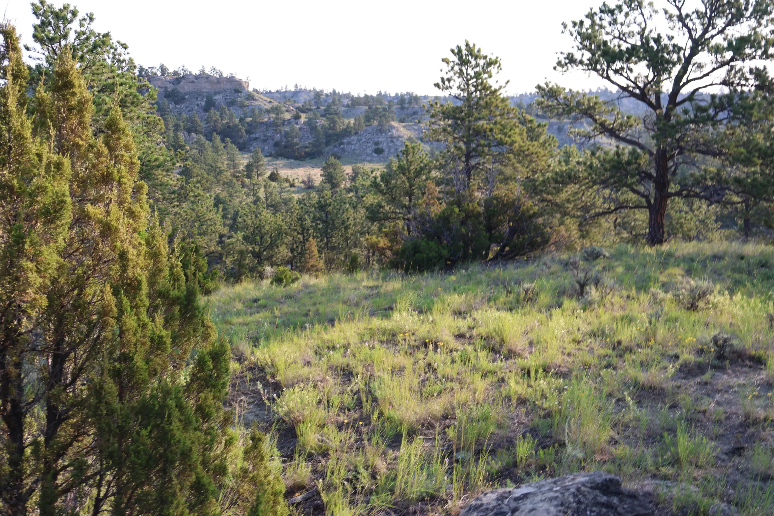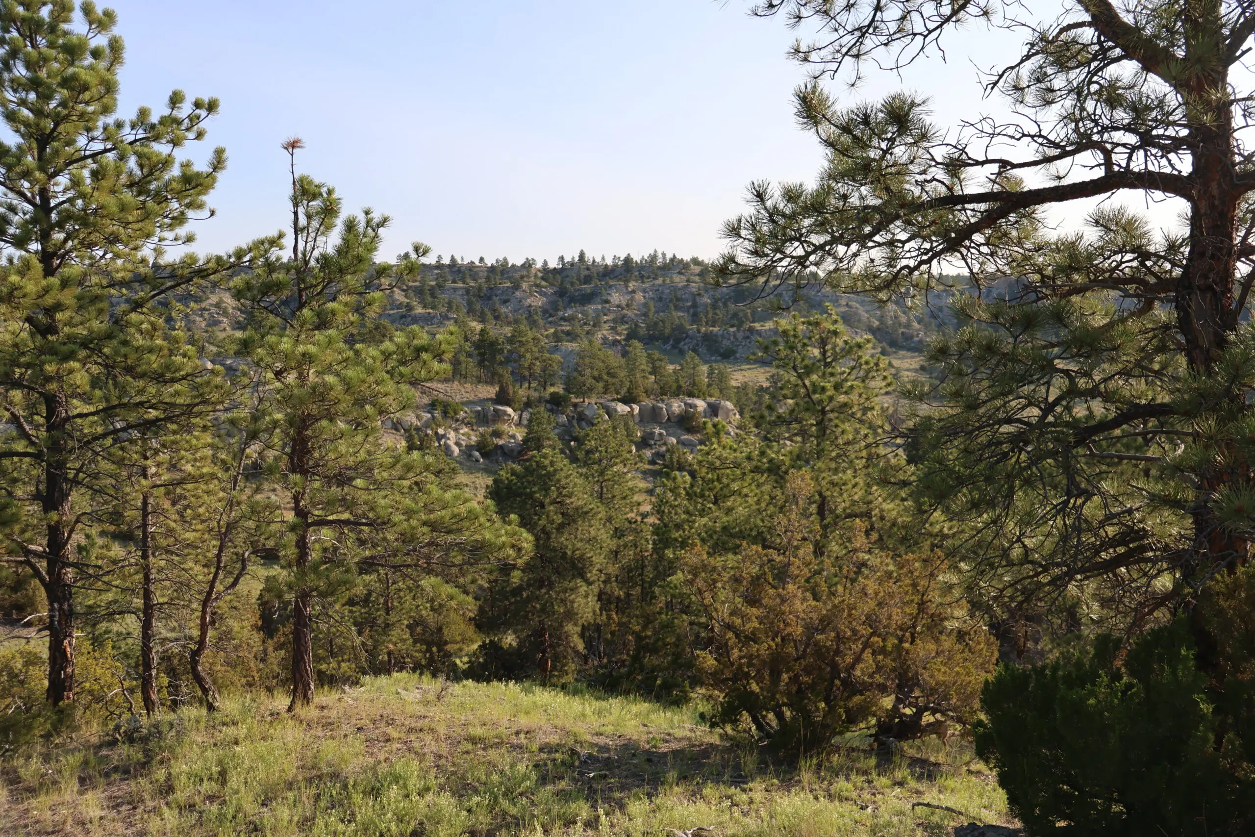 The land features a striking blend of rimrock walls, pine-covered ridges, and native grasslands interspersed with brush-filled draws and seasonal runoff channels. These natural features provide both scenic character and strong habitat for elk, mule deer, whitetail, antelope, and upland game birds. Game cameras have captured consistent wildlife presence throughout the year, confirming the ranch’s reliable food, water, and cover sources.
